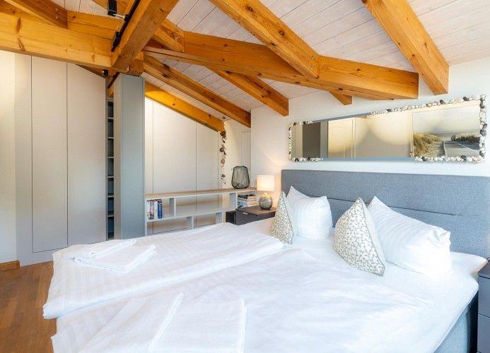 Auch im Schlafzimmer findet man die schöne Holzbalkendecke. Neue, hochwertige Boxspringbetten sorgen für einen erholsamen Urlaubsschlaf - gerne auch länger, denn hier herrscht himmlische Ruhe.... Die Urlaubsgarderobe findet Platz in einem eigenen kleinen Ankleidezimmer. Vom Schlafzimmer aus haben Sie Zugang auf die ca. 16m² große Dachterrasse (ebenso vom Wohnzimmer). Als zusätzliche Schlafgelegenheit steht das Sofa mit einer ausgeklappten Liegefläche von ca. 1,40m x 2,00m zur Verfügung.