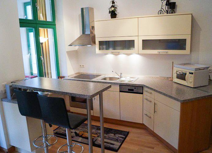 Herzstück der Ferienwohnung ist die verglaste Veranda, die gleichermaßen als Essplatz und Wohnzimmer dient. Vielleicht etwas ungewöhnlich, aber durchaus praktisch: ein Tresen trennt den Schlafbereich von der komplett ausgestatteten Einbauküche, die keine Wünsche offen lässt: Geschirrspülmaschine, Backofen, Mikrowelle, Kühlschrank - alles da, was der Hobbykoch im Urlaub benötigt. Den ersten Kaffee am Morgen genießt man am besten am schönen Tresen oder gerne auch in der Veranda.