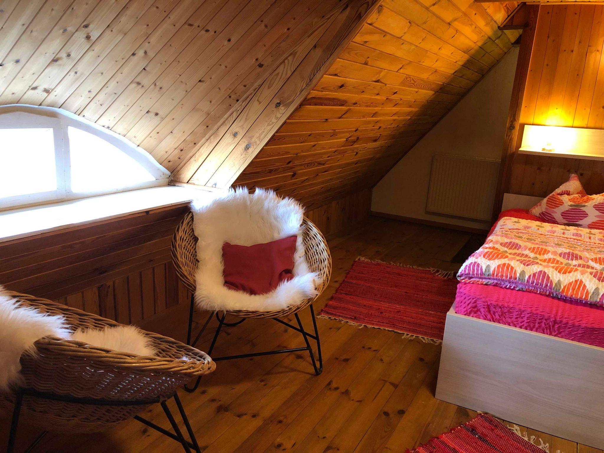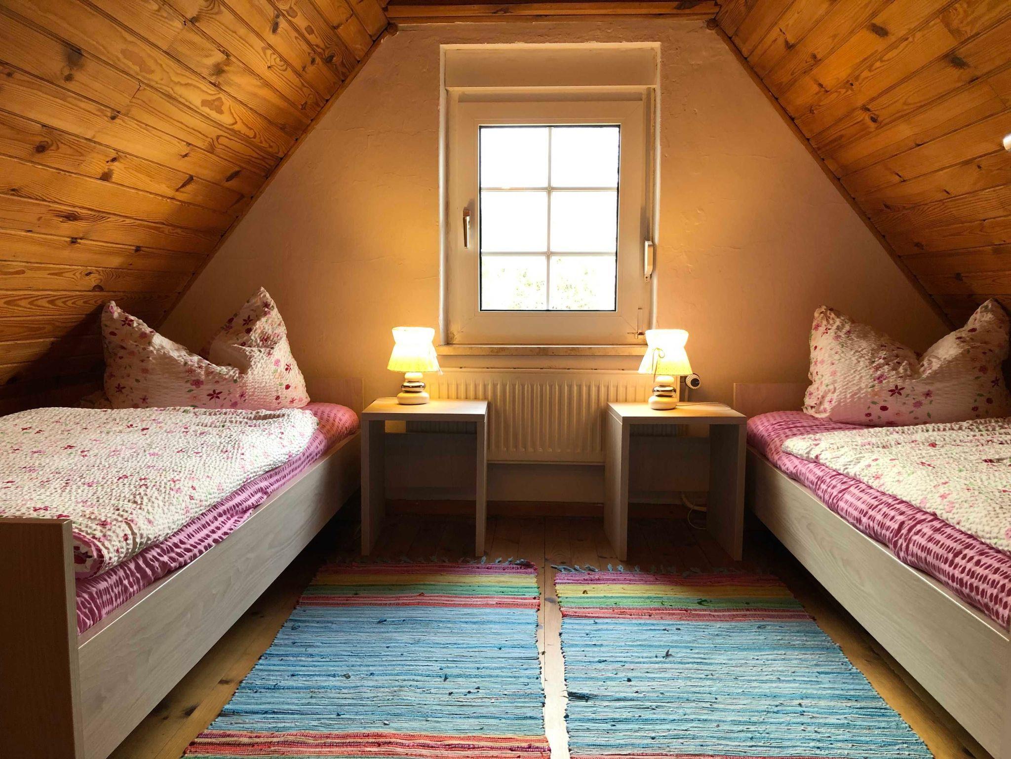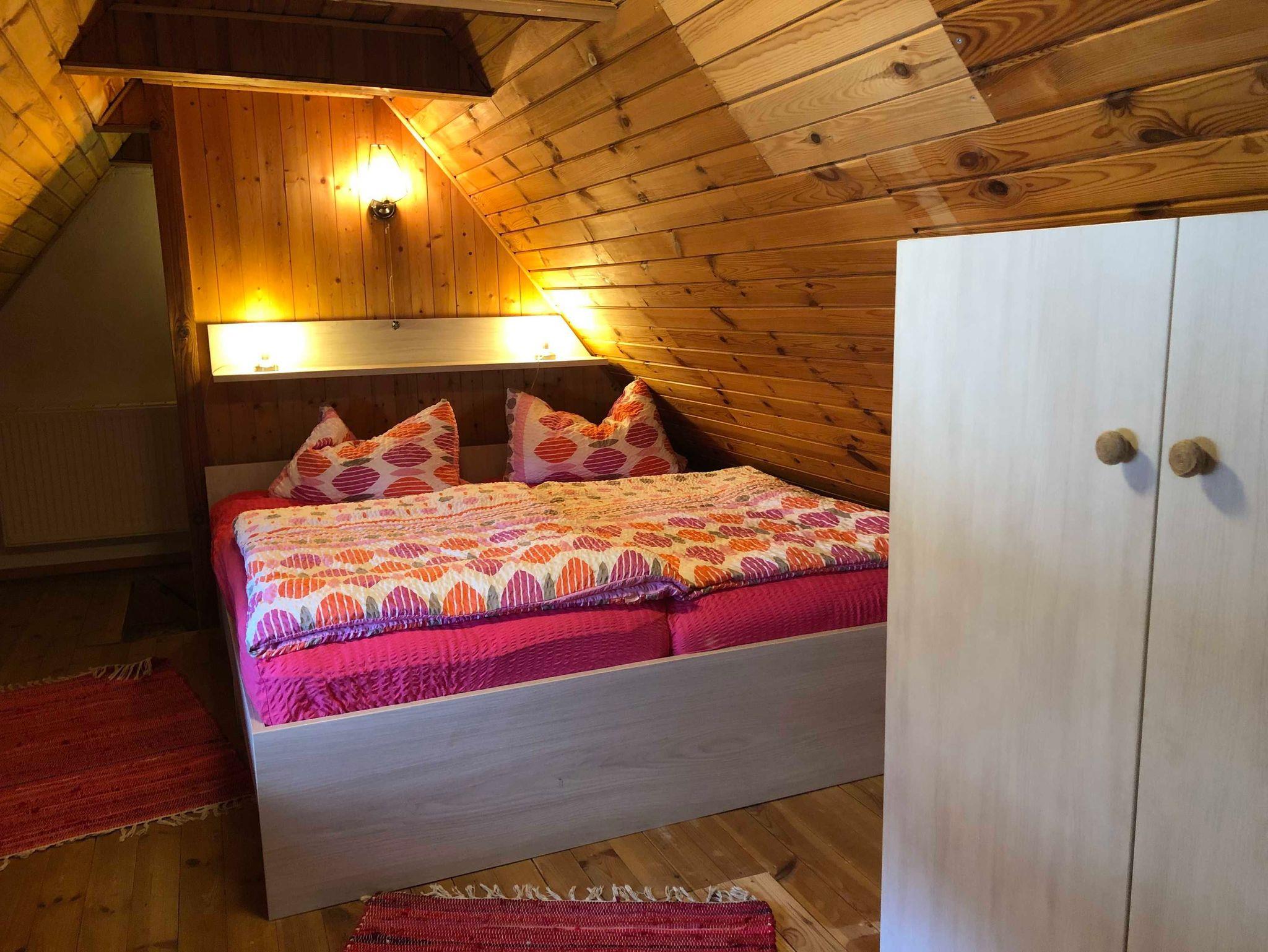 Über eine Treppe gelangen Sie zu den zwei Schlafräumen, welches mit einem Doppelbett und eines mit 2 Einzelbetten ausgestattet ist. Bitte beachten Sie, dass einer der Schlafräume ein Durchgangszimmer ist.