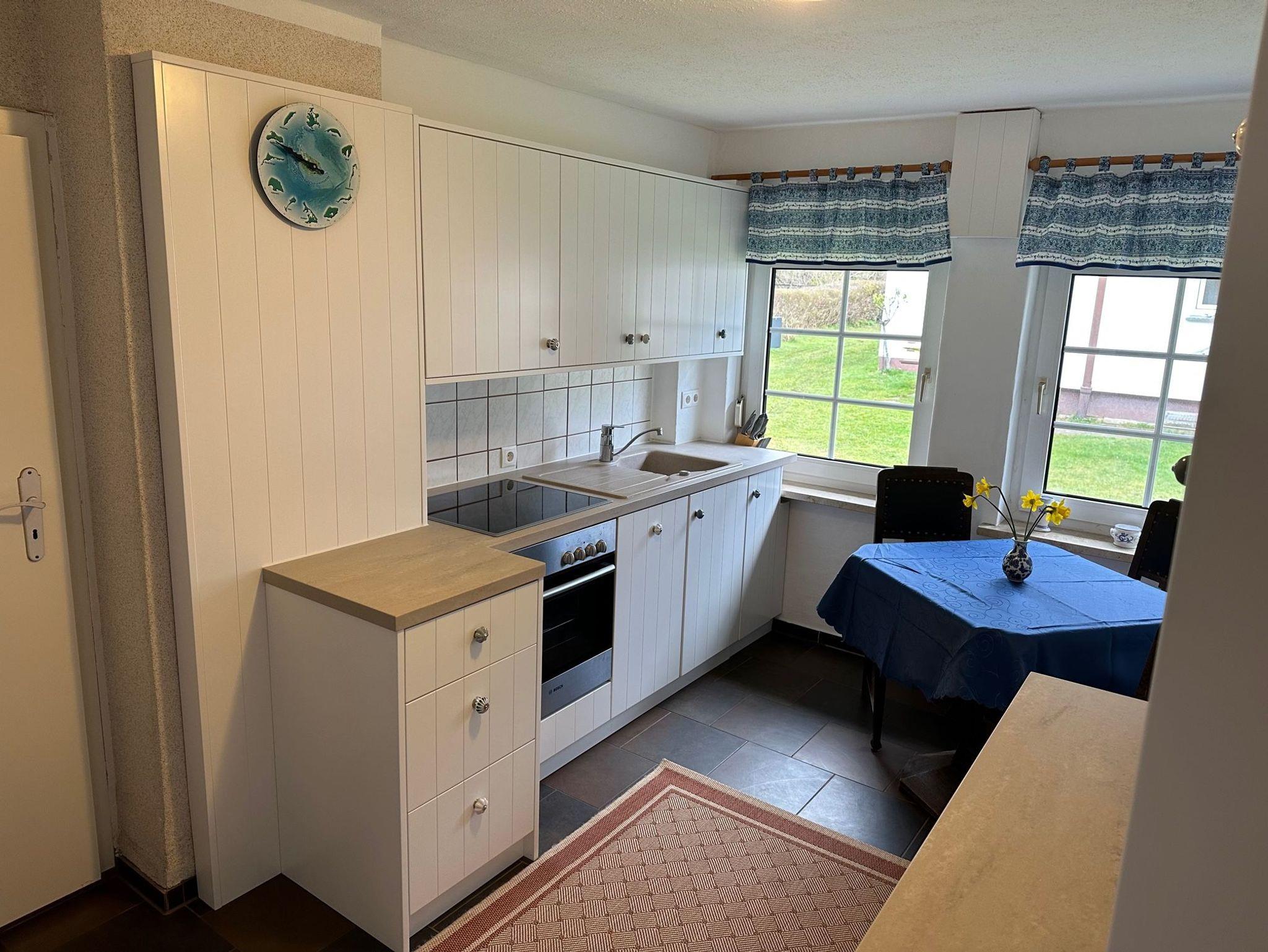 vollausgestattete Küche mit Backofen, Mikrowelle und Essgarnitur