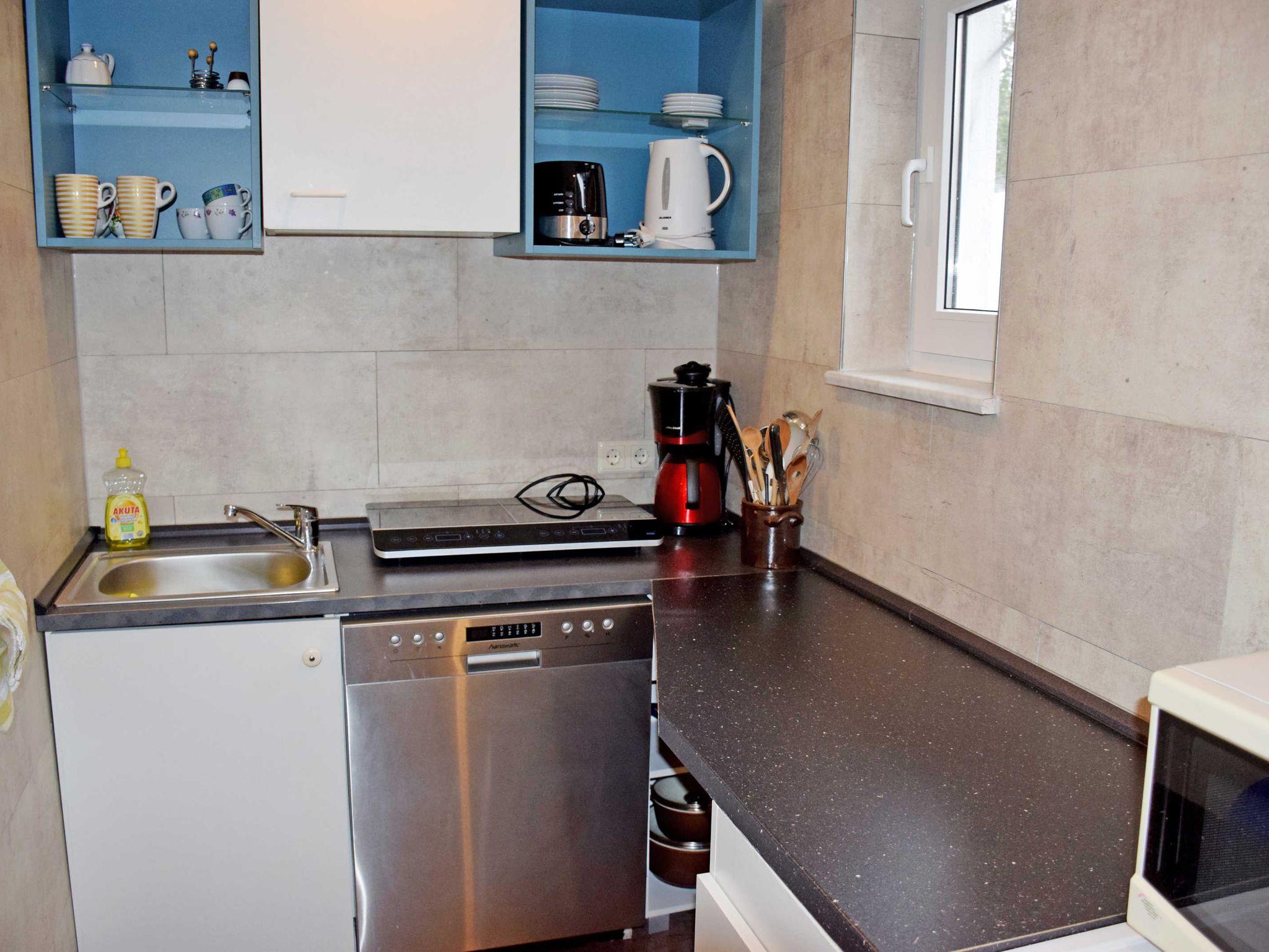 Die kleine separate Küche ist mit einem Kleinen Cerankochfeldherd, Mikrowelle, Wasserkocher, Kaffeemaschine, Spülmaschine, Toaster und Kühlschrank mit Gefrierfach ausgestattet.