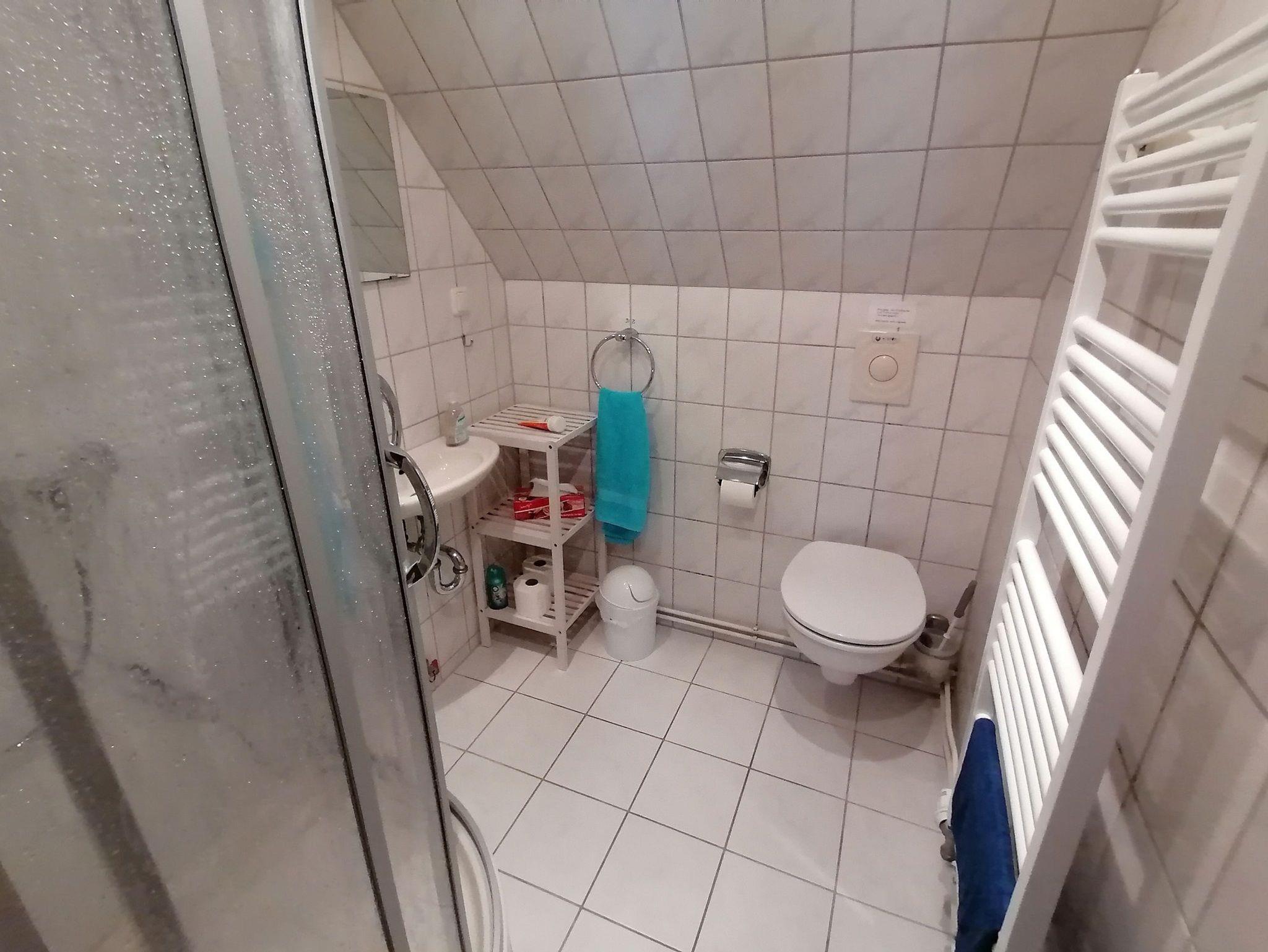 Dusche und WC befinden sich auf der Etage und werden gemeinsam mit einem weiteren Gästezimmer genutzt.