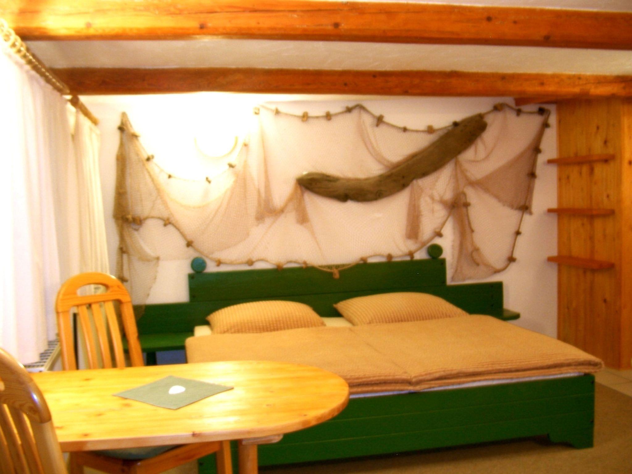 Ausgang und Blick zur Wiese. Entfernung zum nahen Strandbereich etwa 150 m. Gartentisch, Stühle, Liegestühle, Sonnenschirm. Kombinierter Wohn-/Schlafbereich. Raum- und Türhöhen entsprechen dem traditionellen Stil des Hauses und gelten daher als anerkannt. Ausstattung mit Miniküche, Kühlschrank, Kaffeemaschine, Wasserkocher, Toaster, Radio, Fernseher, Doppelbett, Wc, Dusche, Fön, Geschirrtücher, Spülmittel, Papierartikel, (Filtertüten, Küchenrolle etc.). Im Mietpreis enthalten sind Bettwäsche, Hand- und Badetücher, Heizung, Strom, Wasser sowie Endreinigung. Keine sonstigen Verbrauchskosten. Rauchen und sämtlicher Gebrauch von Feuer (z. b. Kerzen, Öllampen usw.) sind im Fischerhaus aus Gründen des Brandschutzes untersagt. Hausschuhe sind bitte erwünscht. Appartement nicht kindgerecht, Buchungen nur für Erwachsene. Kurabgabe je nach Saison. Ruhesuchende und ebenso rücksichtsvolle Gäste sind gern willkommen.