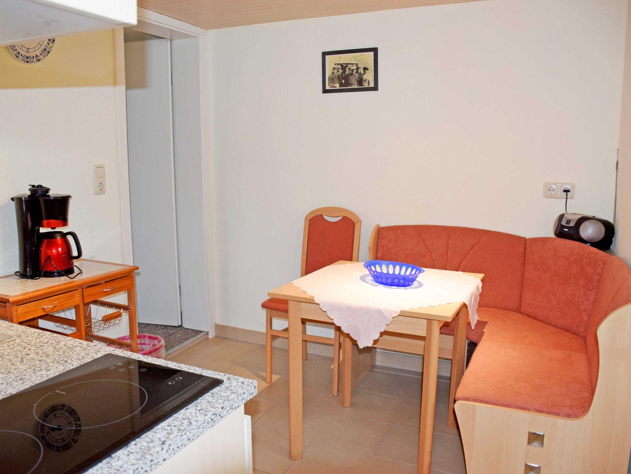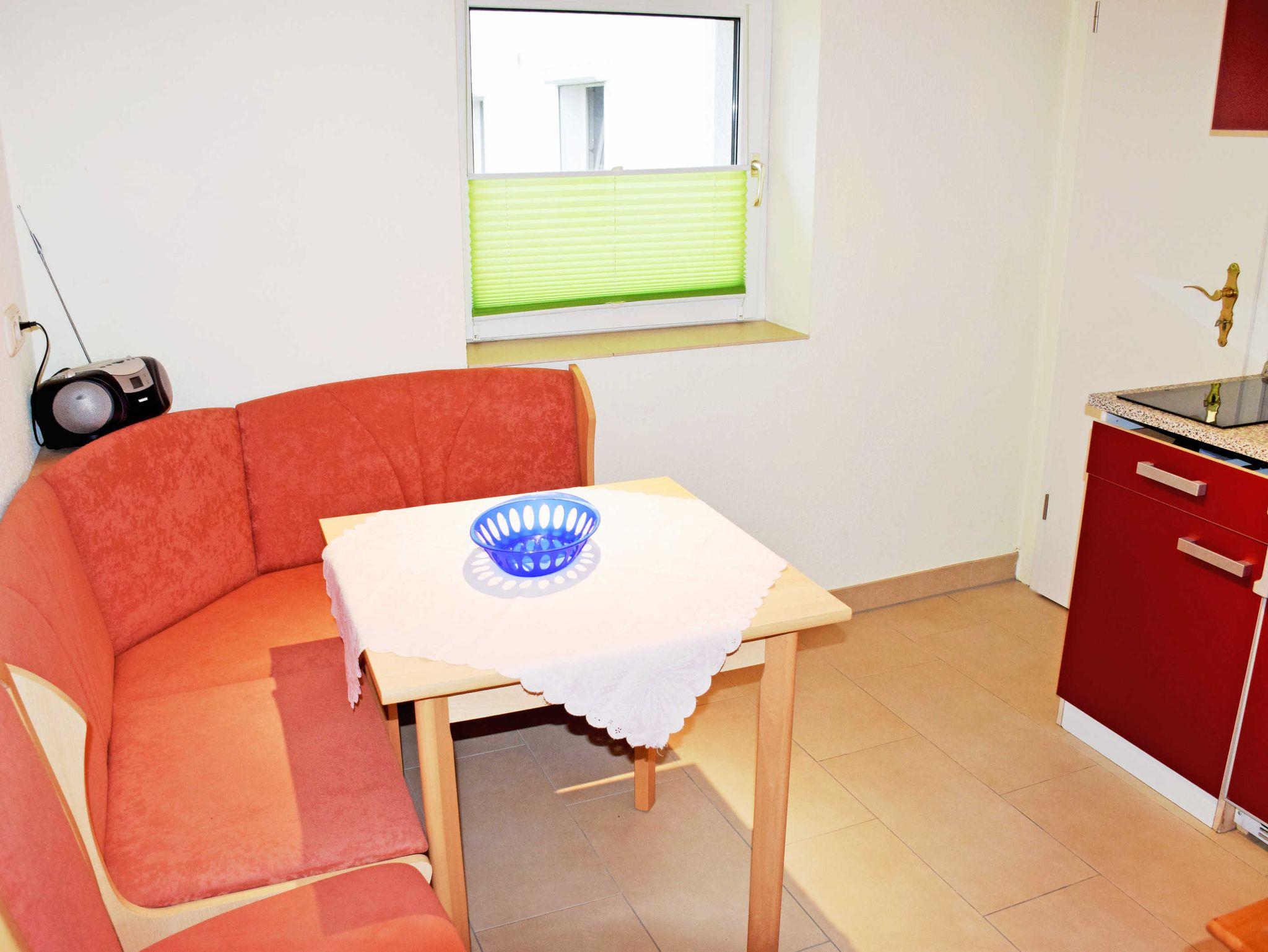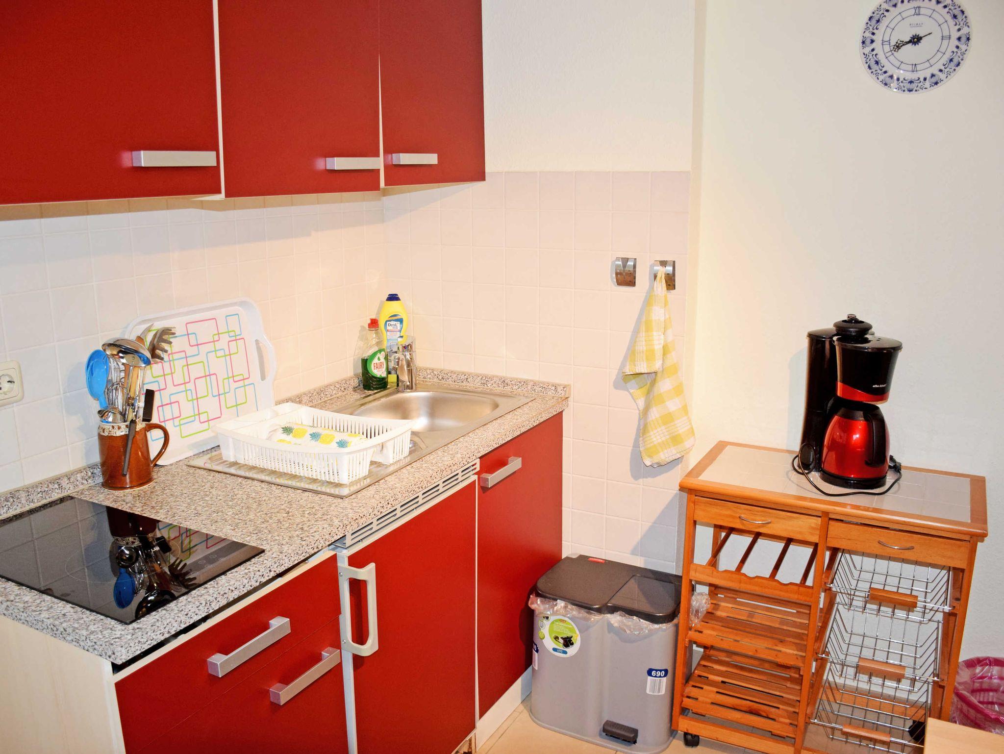 In der kleinen separaten Küche stehen eine Sitzecke mit Esstisch und eine Küchenzeile die mit einem kleinen Cerankochfeld, Wasserkocher, Kaffeemaschine, Toaster und Kühlschrank ausgestattet ist. Vom Wohn-/Schlafzimmer aus gelangt man über den Hausflur auf die Sonnenterrasse mit Gartenmöbeln, davor befindet sich eine Liegewiese zum Sonnen und vuel Platz.