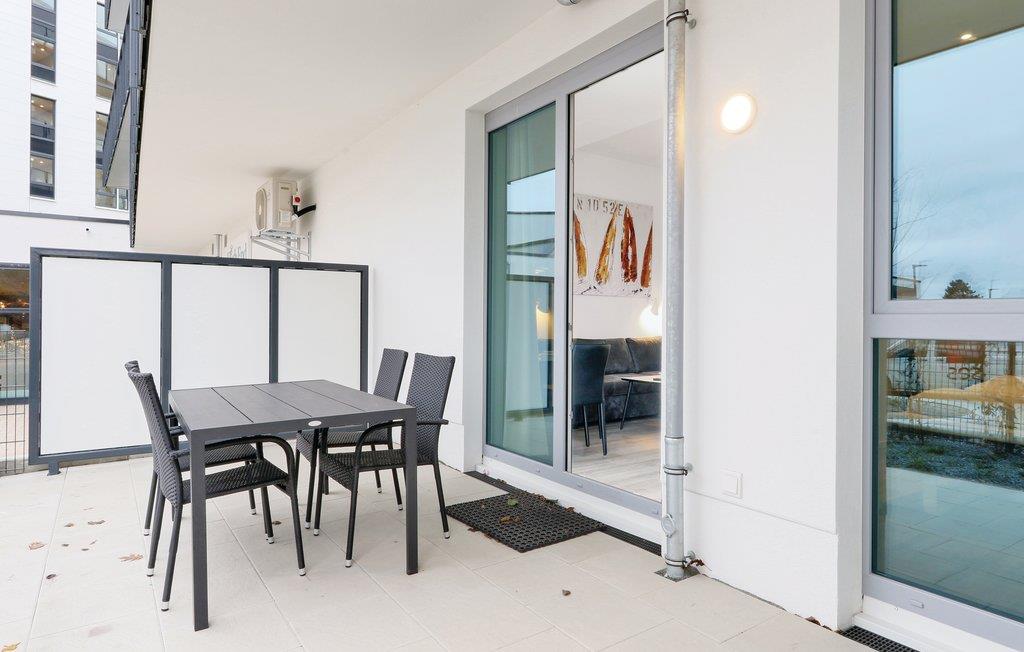 Die moderne Küchenzeile bietet ausreichend Platz zum Kochen und ist mit hochwertigen Markengeräten ausgestattet. Hier finden Kaffeeliebhaber eine Nespresso-Maschine (Kapseln bitte selbst mitbringen), sowie Thermoskanne und Handfilter zum Selbstbrühen, falls Sie doch den klassischen Filterkaffee bevorzugen. Auf der Terrasse können Sie die frische Ostseeluft und das Rauschen der Wellen genießen oder gemeinsame Mahlzeiten mit der Familie einnehmen.
