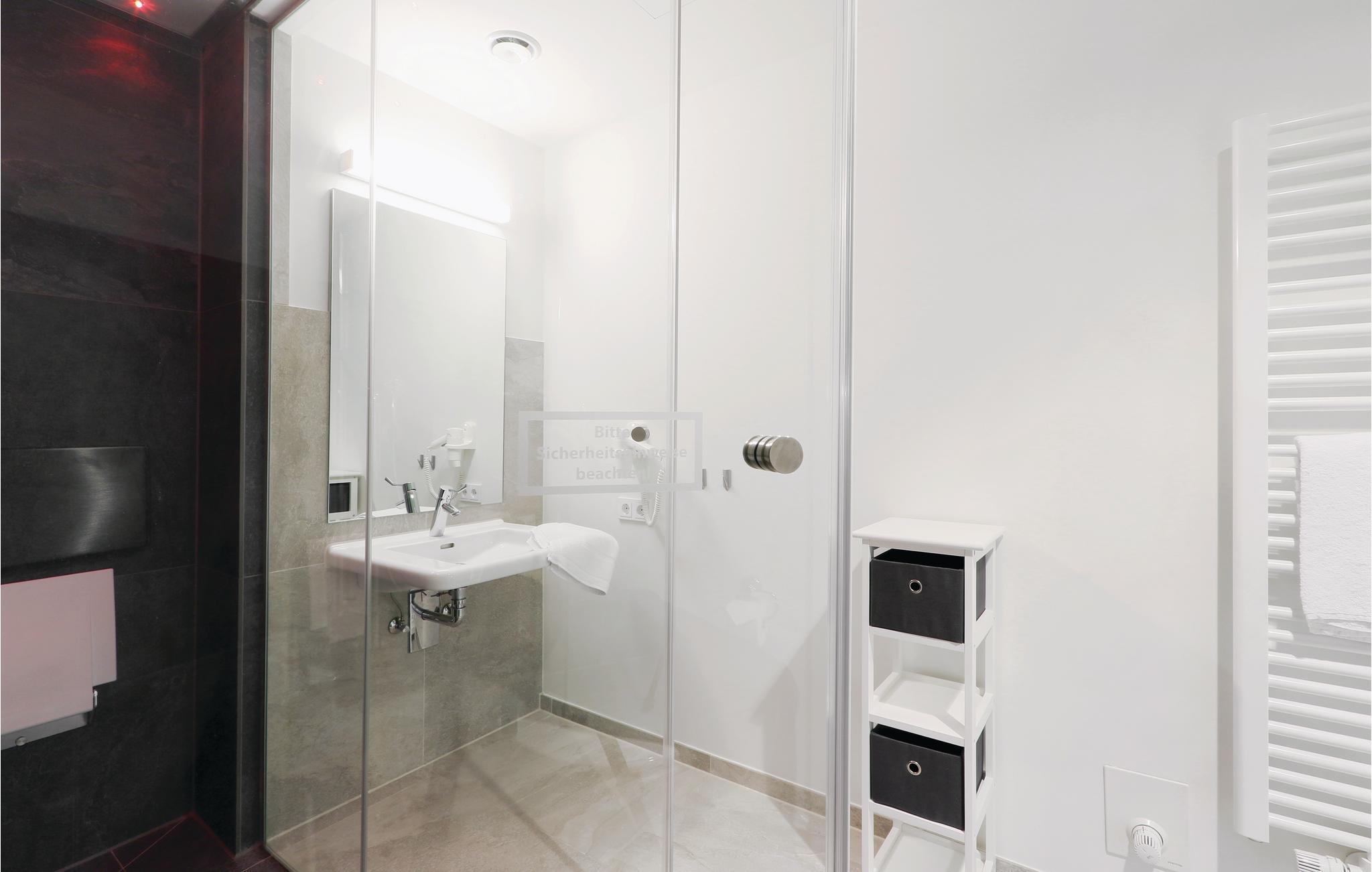 Im modernen Badezimmer befindet sich das Highlight Ihrer Wohnung: die großzügige Regendusche. Hier können Sie sich nach einem langen Ostseespaziergang eine ausgiebige Dusche genießen.