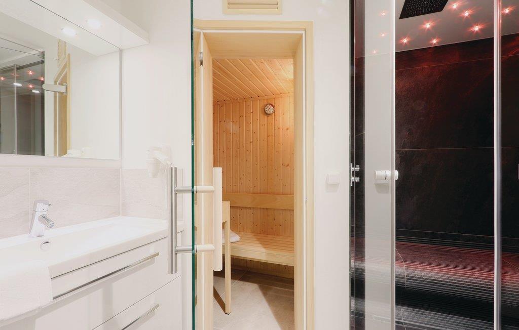 Das Badezimmer präsentiert sich als Ihr persönlicher Wellness-Bereich. Hier können Sie sich nach einem langen Spaziergang an der Ostsee in der Sauna aufwärmen. Außerdem verfügt das Badezimmer über ein Dampfbad mit Regendusche.