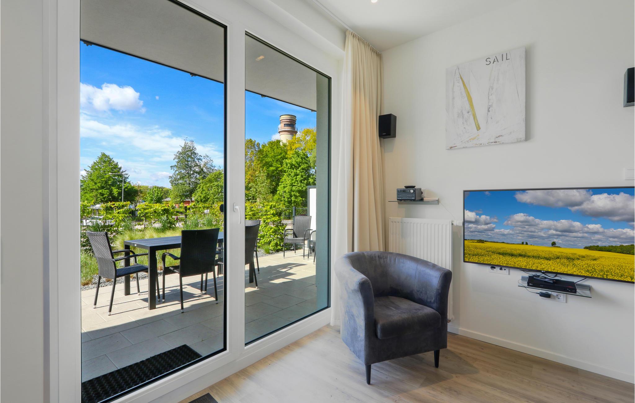 Auf der Terrasse, die nach Süden ausgerichtet ist, können Sie die frische Ostseeluft und die Sonne genießen. Von hier aus blicken Sie auf den Priwall und die Hafenausfahrt mit den vorbeziehenden Schiffen und Fähren. Gartenmöbel stehen hier für gemeinsame Mahlzeiten mit der Familie zur Verfügung.