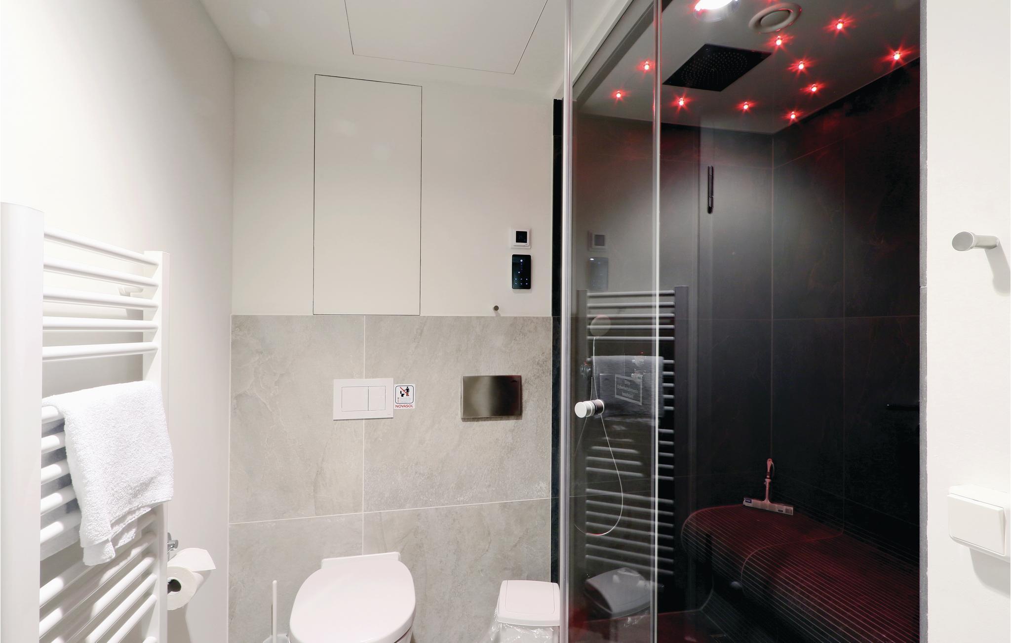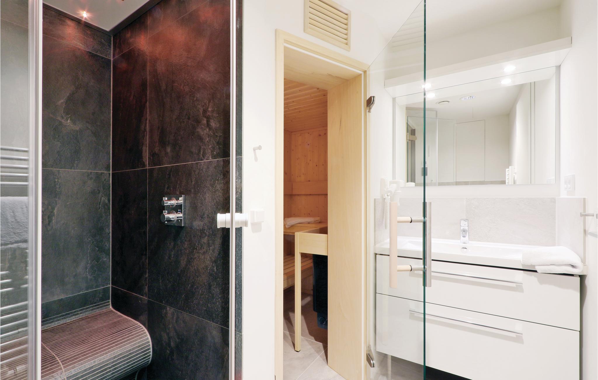 Das Badezimmer präsentiert sich als Ihr persönlicher Wellness-Bereich. Hier können Sie sich nach einem langen Spaziergang an der Ostsee in der Sauna aufwärmen. Außerdem verfügt das Badezimmer über ein Dampfbad mit Regendusche.