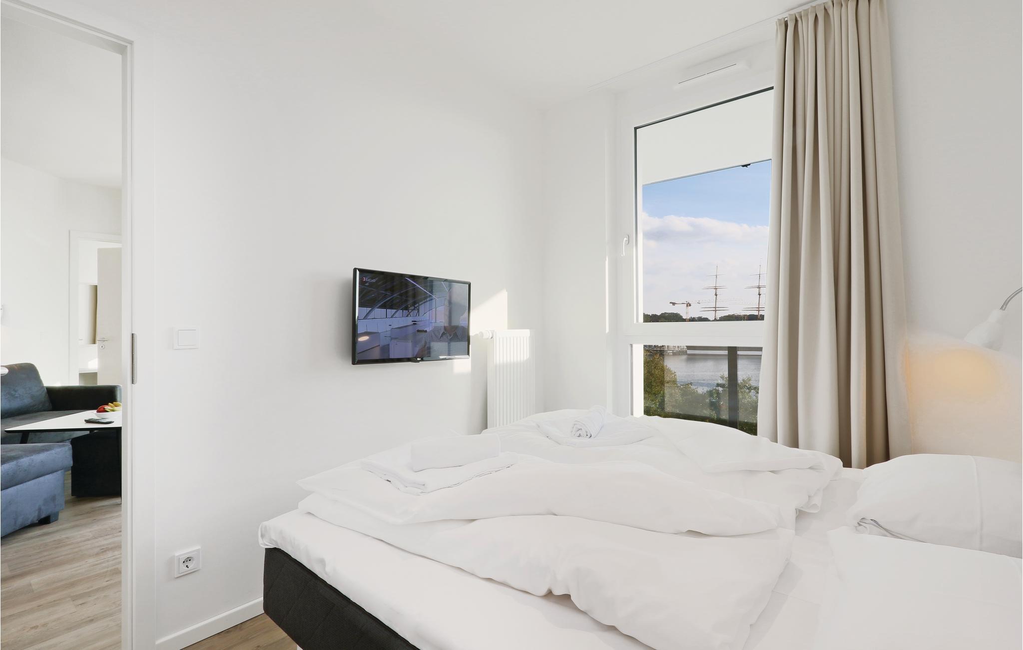 Ihre Ferienwohnung befindet sich im 4. Obergeschoss der Anlage, weshalb Sie eine einmalige Aussicht genießen. Von hier aus können Sie auf den Priwall, den Sandstrand sowie die Hafenausfahrt mit den vorbeiziehenden Schiffen blicken. Sie verfügt über zwei separate Schlafzimmer mit jeweils einem gemütlichen Doppelbett. Im Wohnbereich können Sie es sich vor dem wohligen Licht des Bio-Ethanol-Kamins gemütlich machen. Im Wohnbereich befindet sich außerdem das Schlafsofa, welches zwei weitere Schlafplätze bietet. Ein Kinderbett lässt sich ausschließlich im Wohnzimmer aufstellen, da im Schlafzimmer nicht ausreichend Platz zur Verfügung steht.