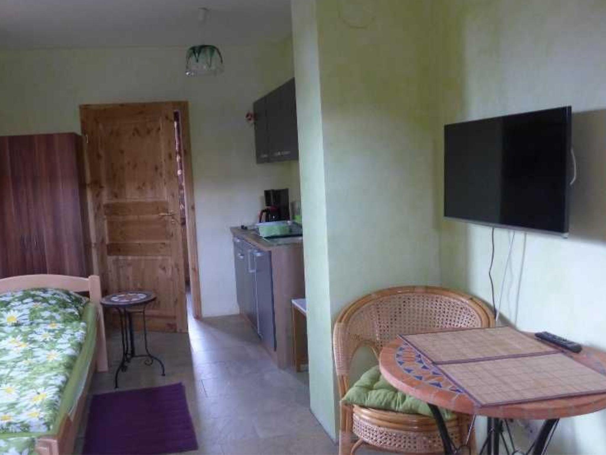 Für Ihre Selbstversorgung ist eine integrierte Miniküche vorhanden, inklusive Kühlschrank, zwei Cerankochfeldern, Wasserkocher, Kaffeemaschine, Toaster und Minibackofen. Das Badezimmer bietet eine ebenerdige Dusche (mit Duschvorhang), Waschtisch und WC - praktisch und komfortabel für den täglichen Start in den Tag.