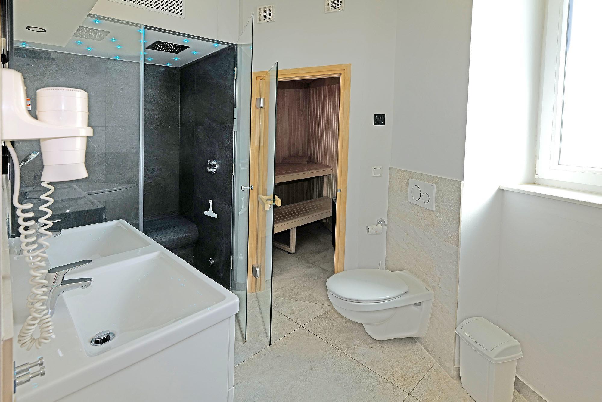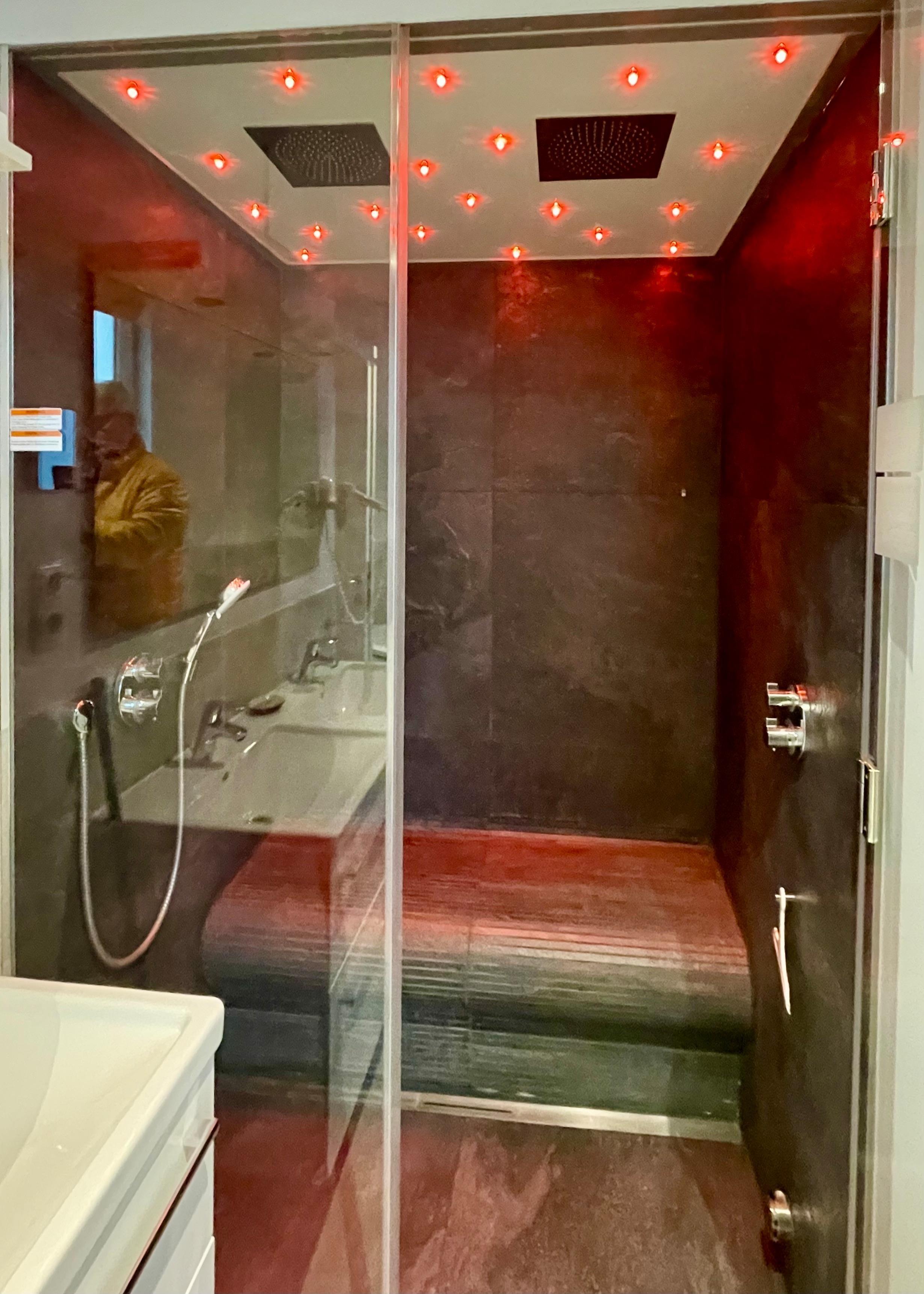 Diese luxuriöse Ferienwohnung mit fantastischem Panoramablick auf den Passathafen besitzt einen eigenen Wellness-Bereich mit Sauna, Dampfbad und Whirlwanne.