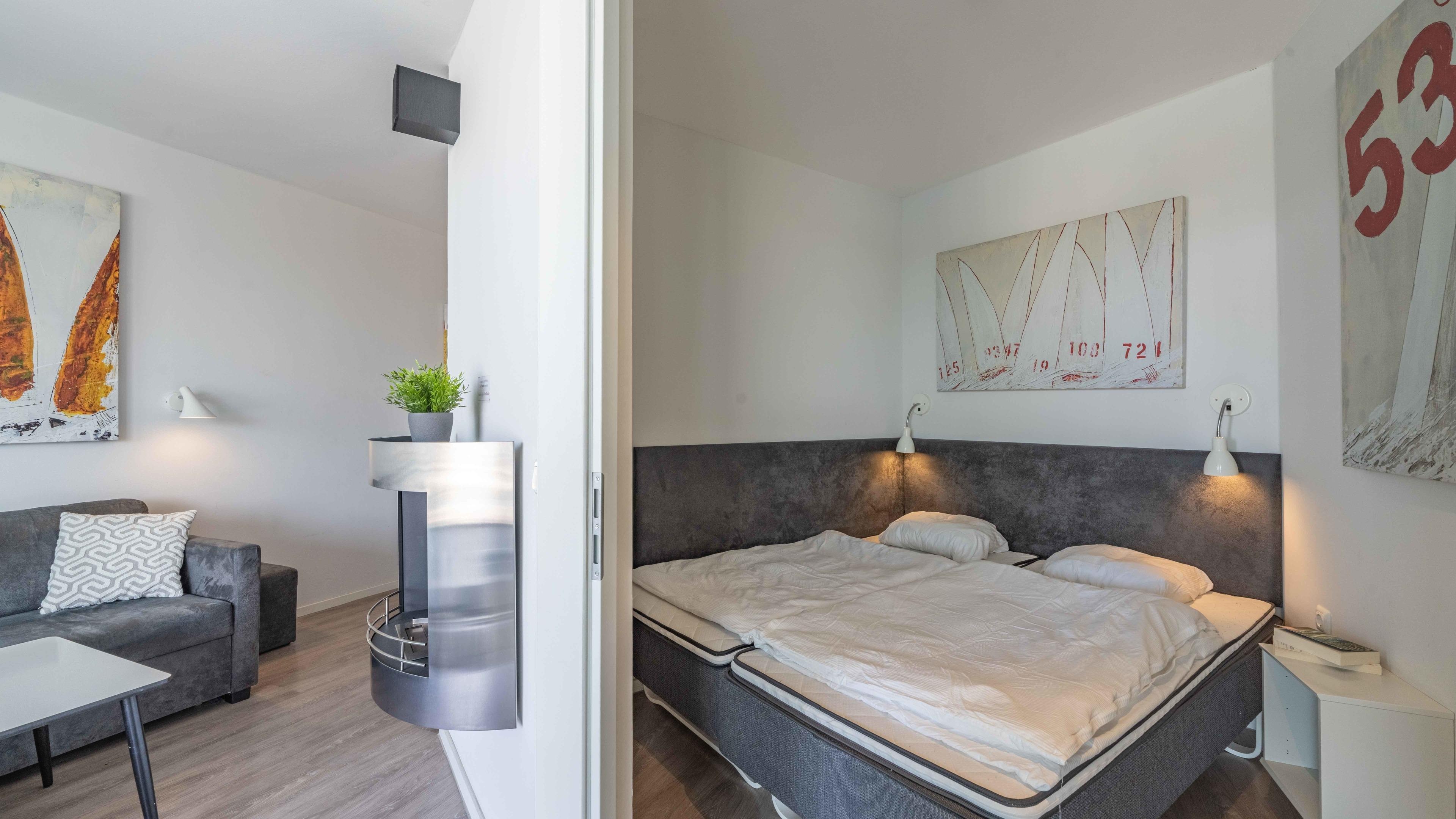 Regendusche. Im Wohnbereich sorgen am Abend die Flammen des Bioethanolkamins für eine gemütliche Atmosphäre, ebenso wie die vorbeifahrenden großen Schiffe mit ihrer eindrucksvollen nächtlichen Beleuchtung.