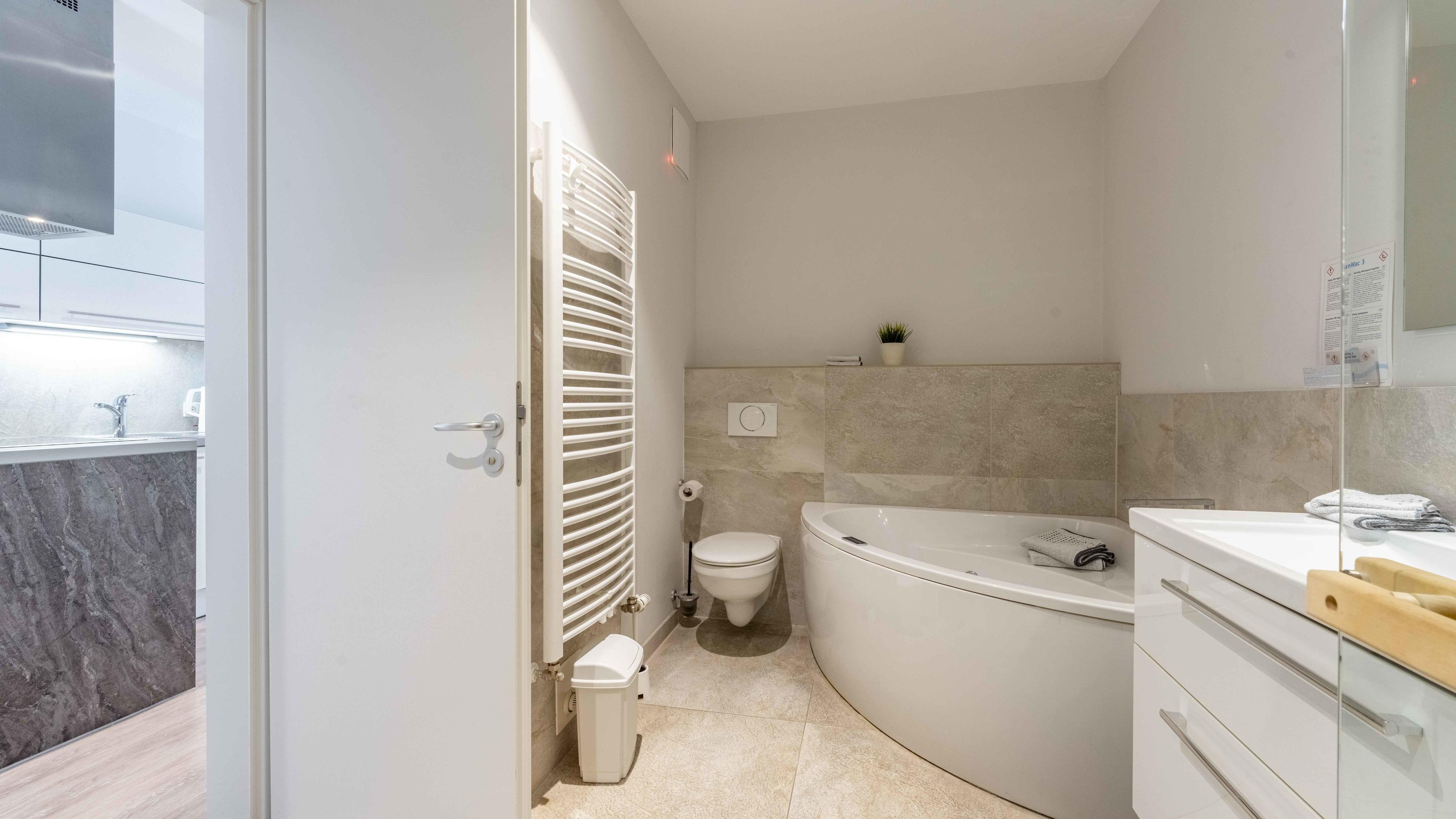 Die Wohnung ist stilvoll, hochwertig und modern eingerichtet. Ein besonderes Highlight ist ihr persönlicher Wellnessbereich mit Sauna, Whirlpool und Dampfbad mit integrierter Doppel-