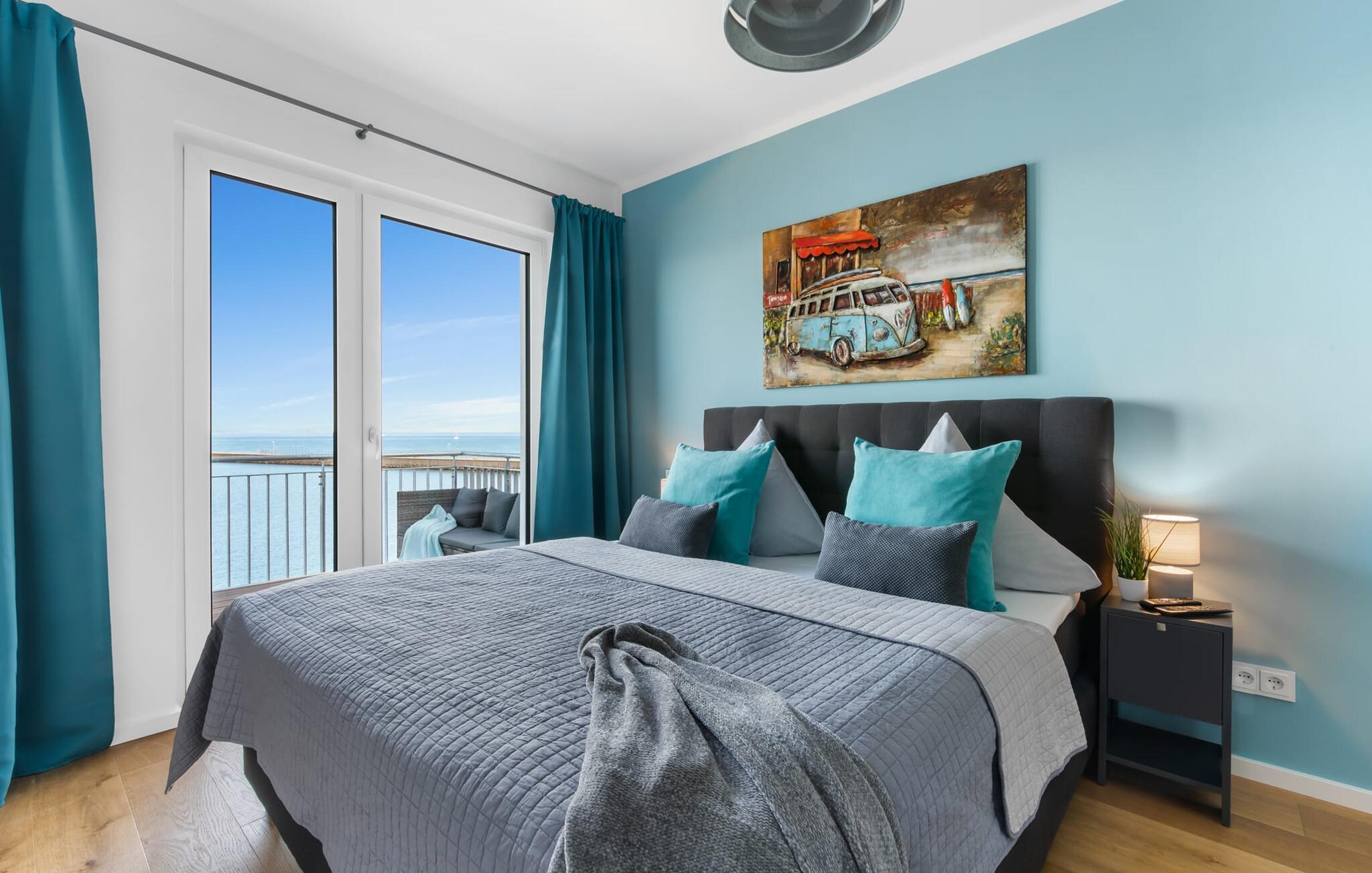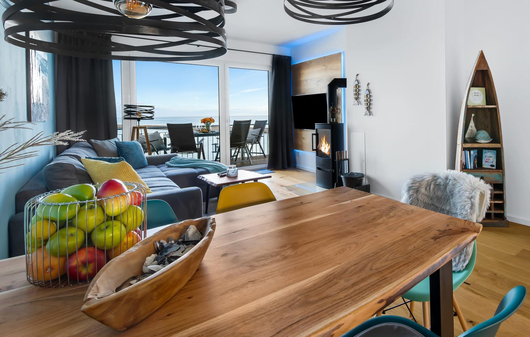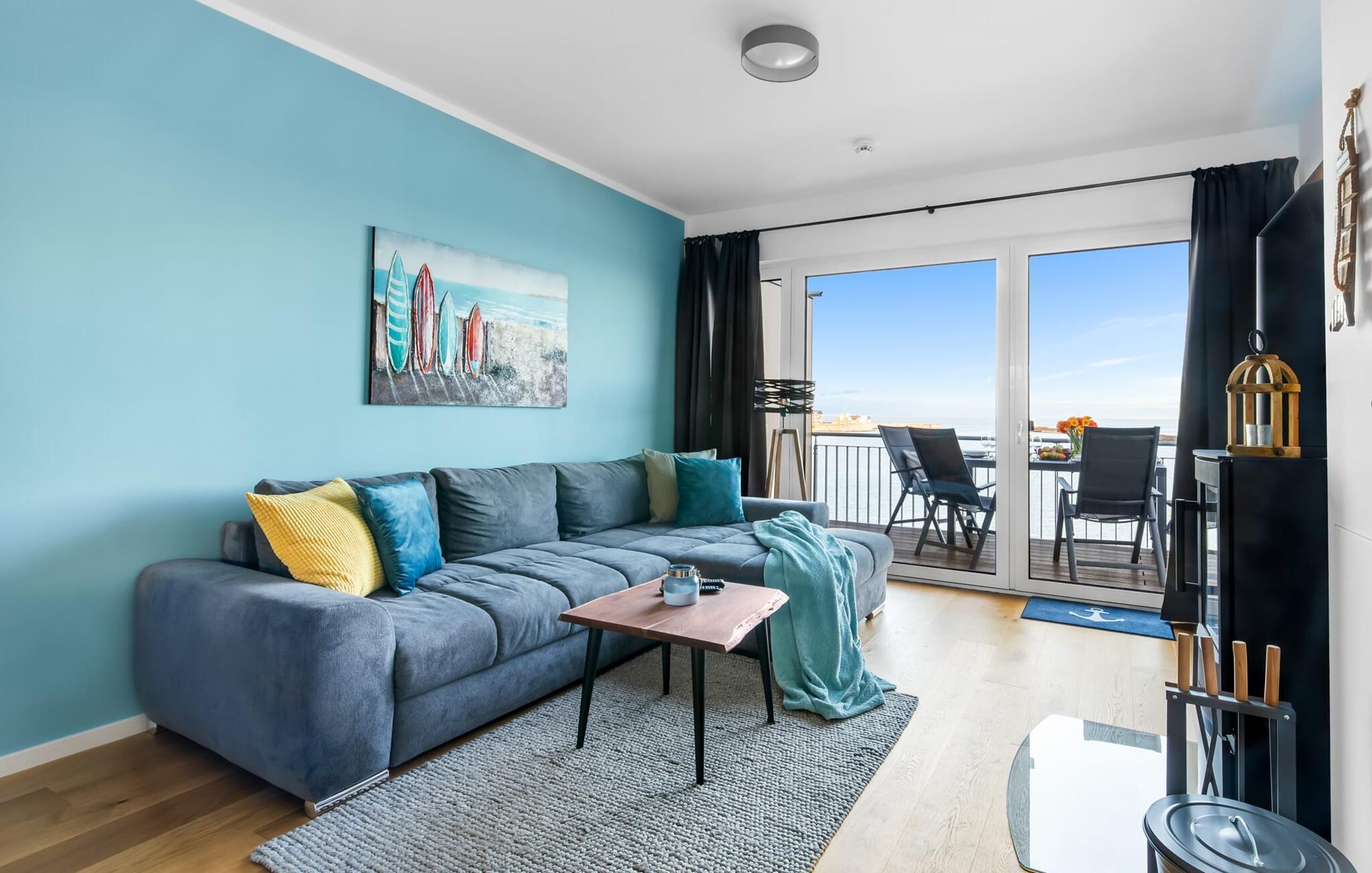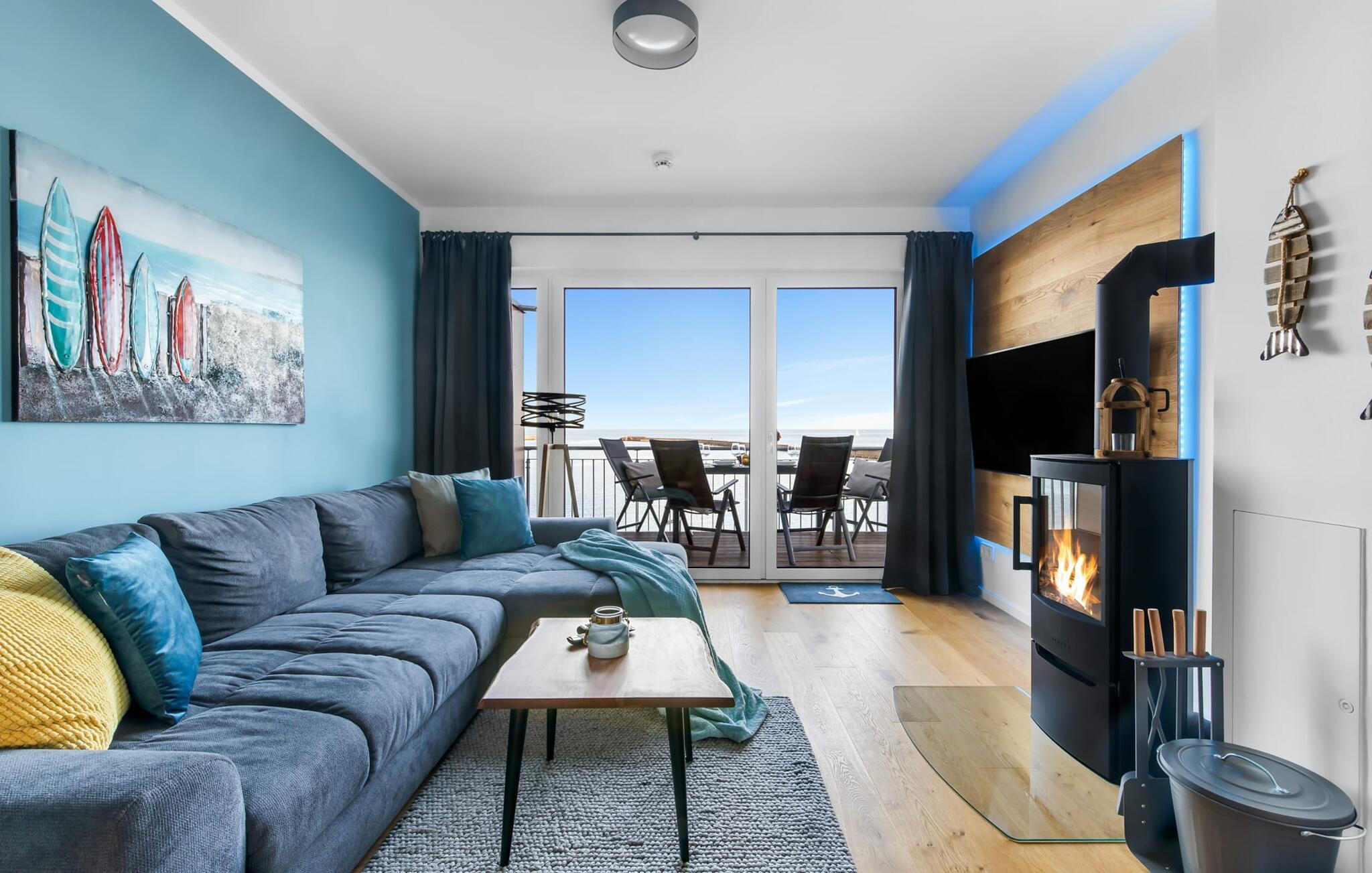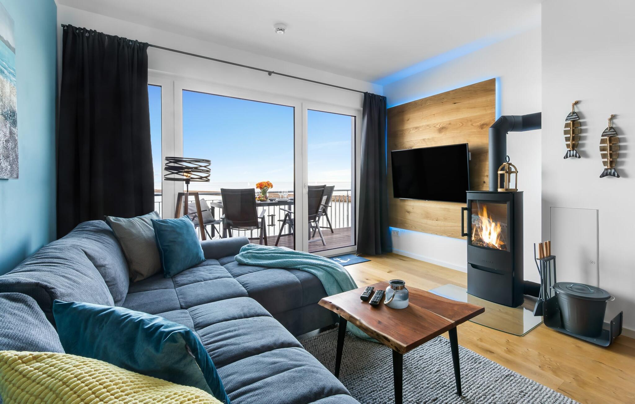 Ferienwohnung HochSee mit Meerblick, Balkon und Kaminofen im OstseeResort Olpenitz – ideal für entspannte Tage am Wasser.