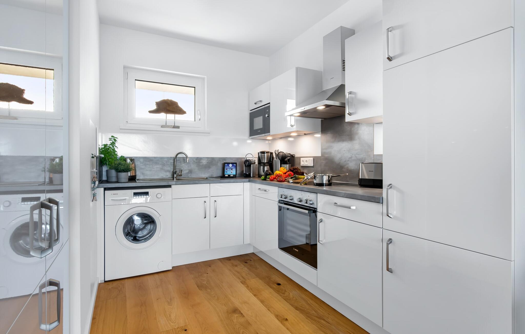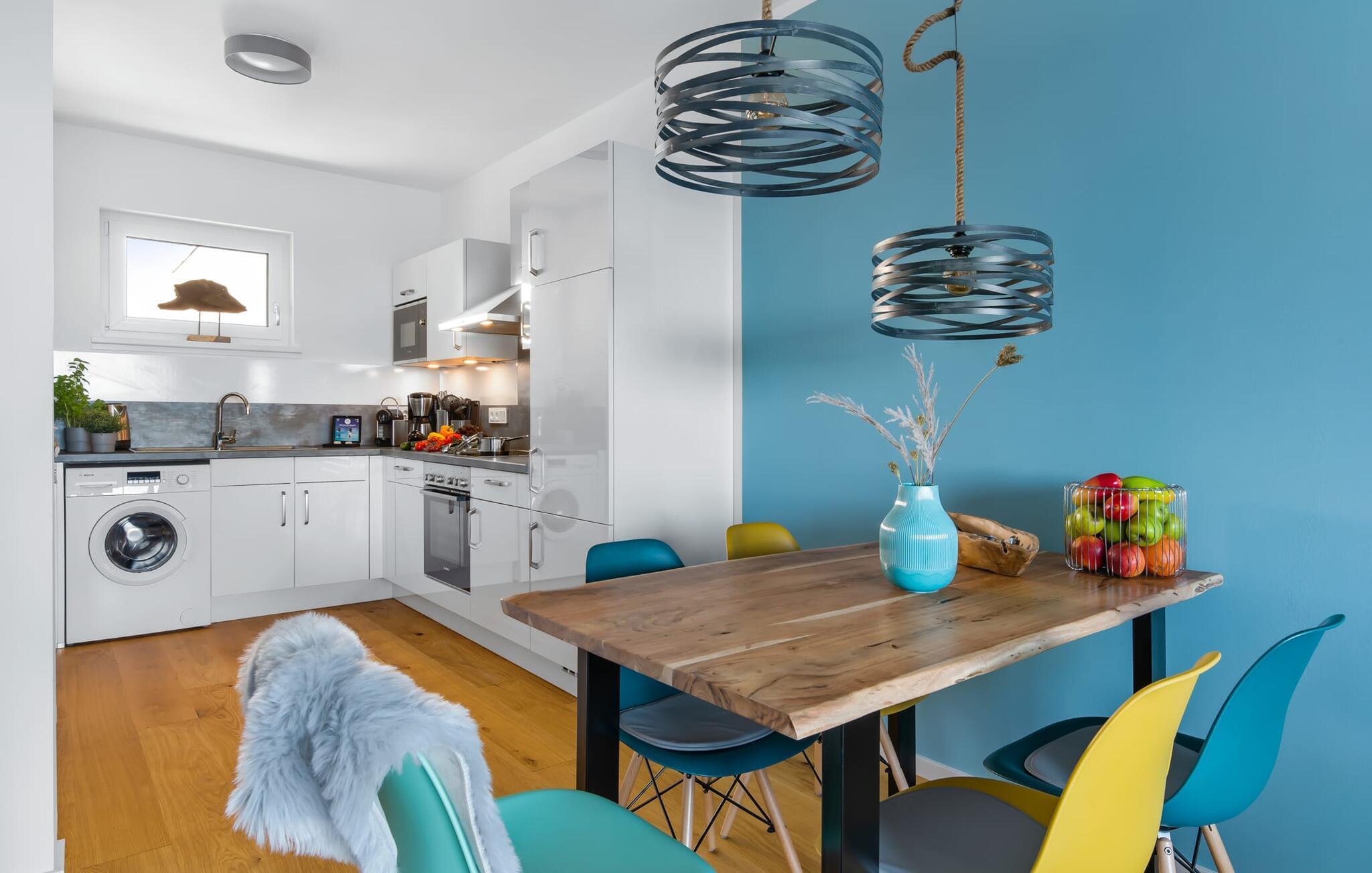 Hochwertig und geschmackvoll eingerichtet empfängt euch der lichtdurchflutete Wohn- und Essbereich mit seinen bodentiefen Fenstern und dem angrenzenden Balkon. Der fantastische Ausblick begleitet euch bei allem was ihr tut, trägt zur Entschleunigung und Erholung bei und lässt den Alltag sehr schnell verblassen.