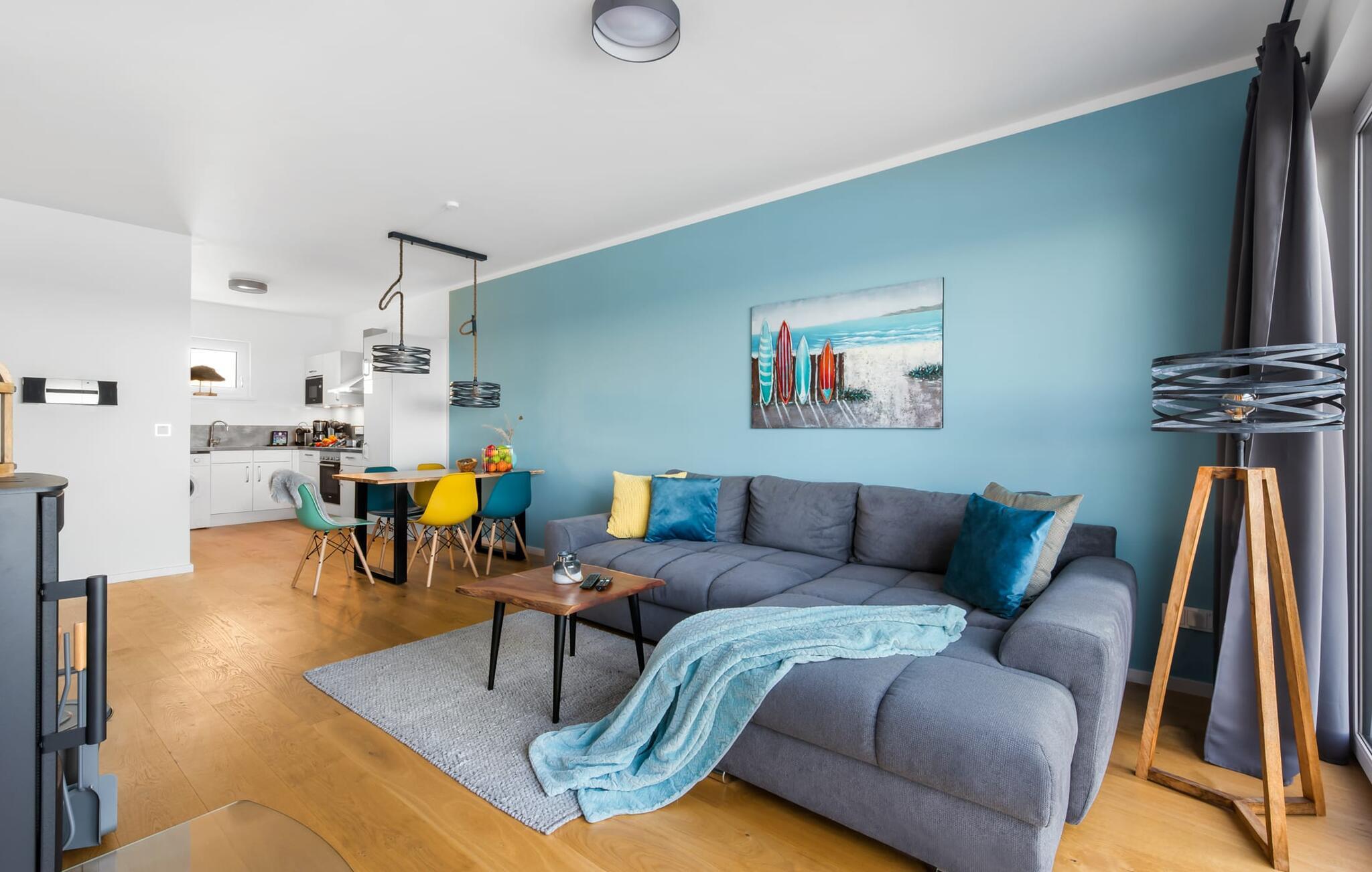 Im Wohnbereich lässt sich das bequeme Sofa mit ein paar Handgriffen in ein Bett umfunktionieren und ein Fernseher mit Home Entertainment sorgt für Abwechslung, falls das Ostseekino einmal unterbrochen werden soll.