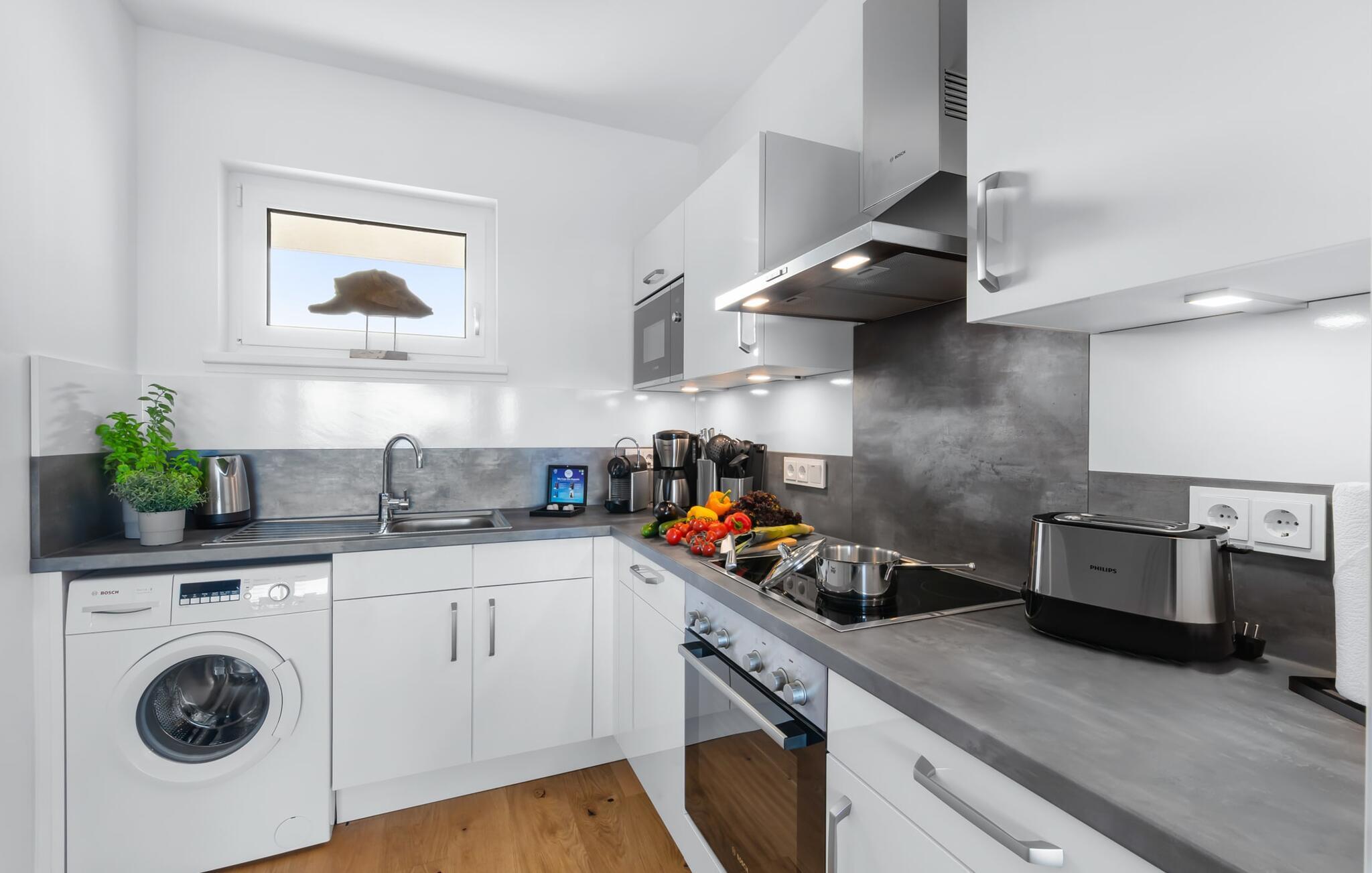Die perfekt ausgestattete Küche lässt keine Wünsche offen und man freut sich darauf kochen zu dürfen. Anschließend auf dem Balkon gemeinsam zu essen oder gemütlich zu grillen ist jeden Tag auf's Neue ein Genuss, was will man Meer?