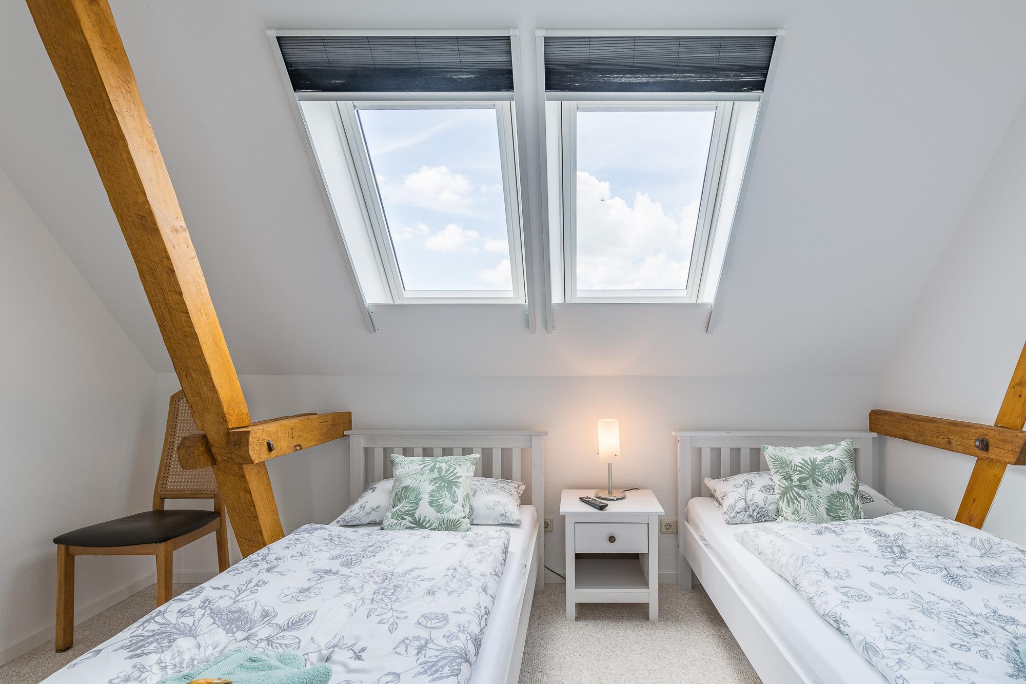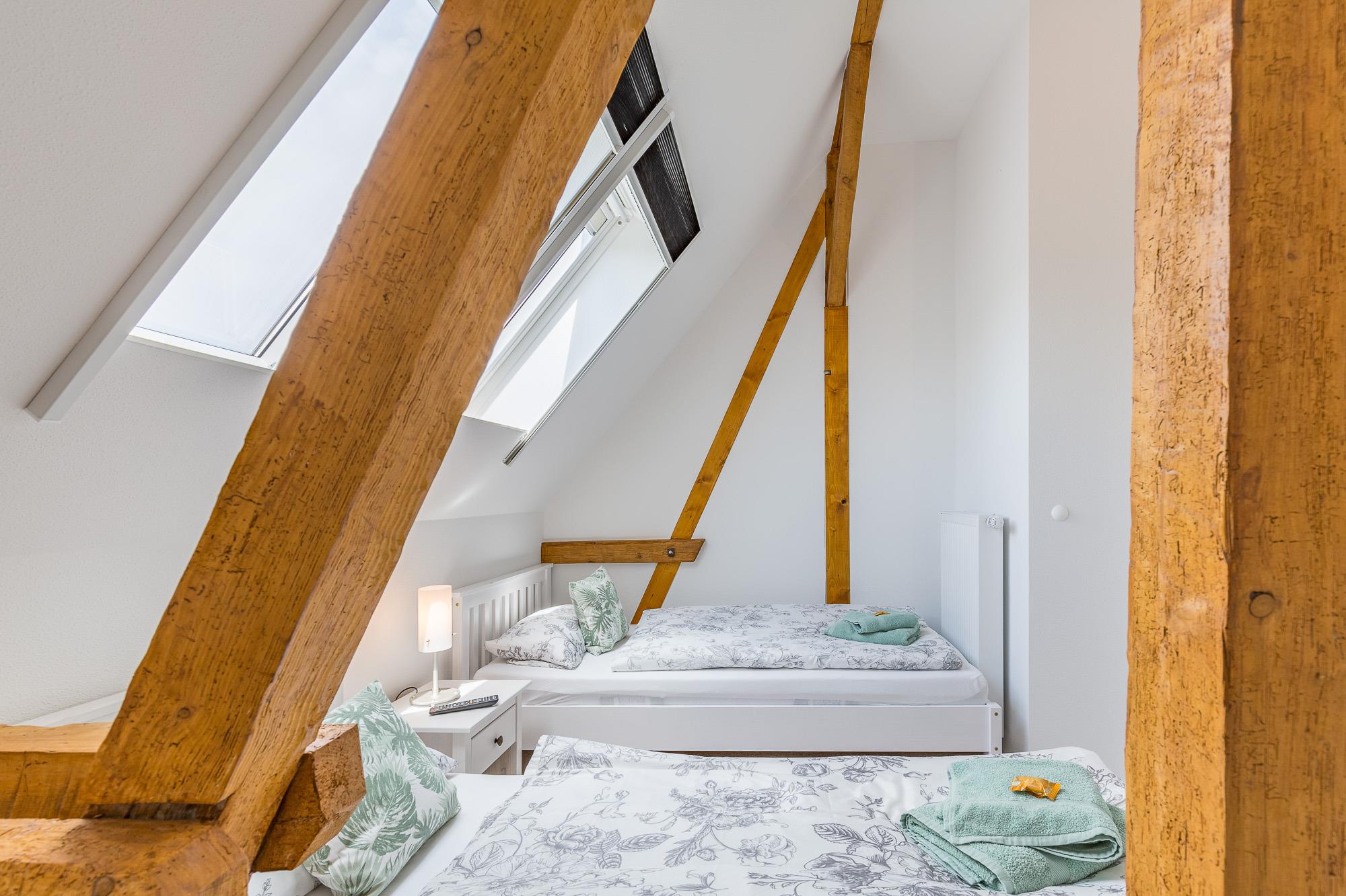 Wohnung auf 2 Etagen verteilt: Im Obergeschoß befinden sich 2 Schlafzimmer. Das Elternschlafzimmer enthält ein Doppelbett. Im Kinderschlafzimmer stehen 2 getrennt stehende Einzelbetten.