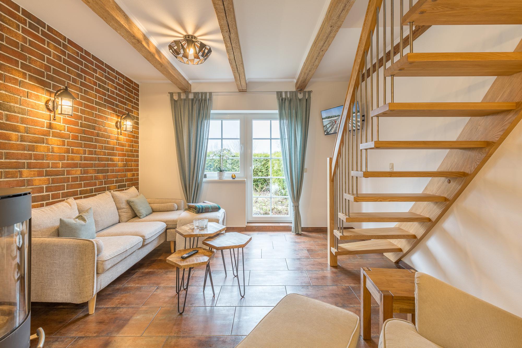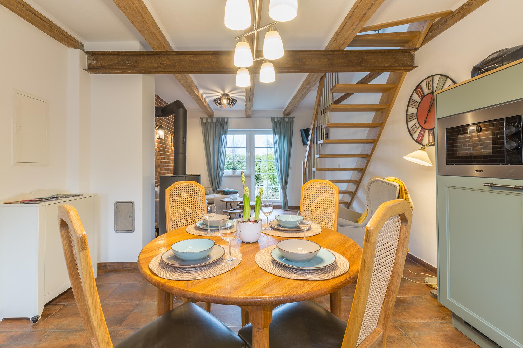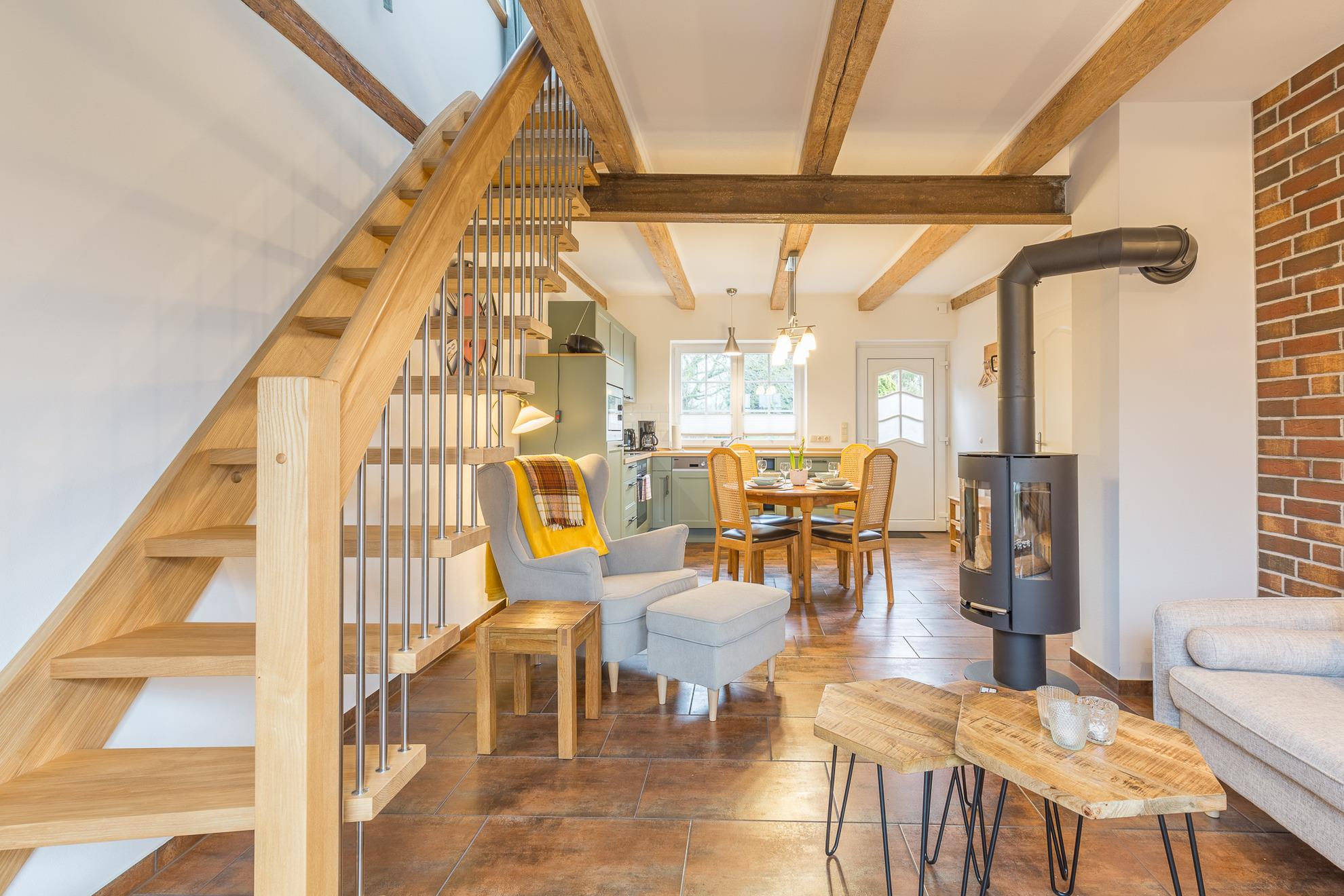 Ein 65 m² großes Wohn- und Esszimmer befindet sich im Erdgeschoss der Wohnung. Von hier aus geht es zu einer überdachten Terrasse. Im Erdgeschoss befindet sich außerdem eine Wohnküche und das Bad mit Dusche, Waschmaschine, Trockner und Fön.