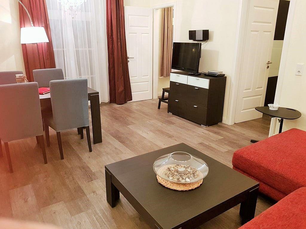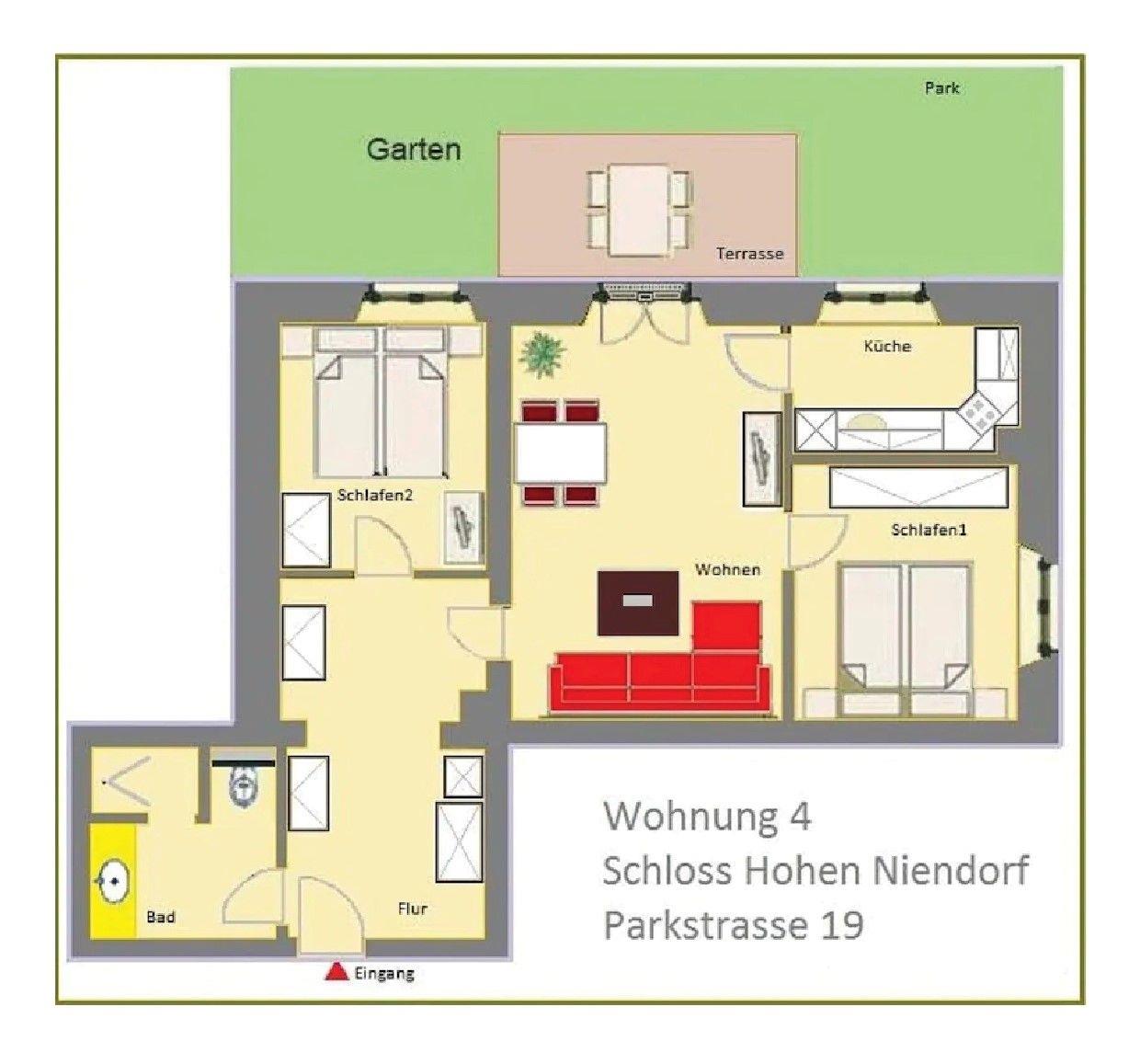 Das gemütliche und großzügige Wohn-/Esszimmer verfügt über eine separate Sitzgruppe mit bequemer Eckcouch, Couchtisch, einen separaten Esstisch mit 4 Stühlen sowie ein Sideboard. Vom Wohnzimmer aus haben Sie direkten Zugang zu der ca. 12 m² großen Terrasse (nach Nord-Osten ausgerichtet) mit Gartenmöbeln. Hier sitzen Sie entspannt und gemütlich mit herrlichem Blick in den Schloßpark und können abends bei einem guten Glas Wein in Ruhe die lauen Sommernächte genießen!