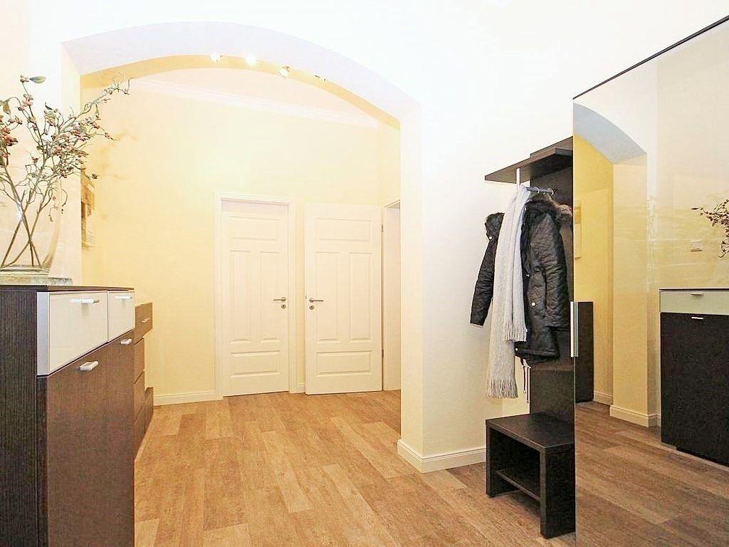 Von der sehr geräumigen Diele (mit historischem Rundbogen) mit Garderobe, großem Kleiderschrank, 2 großen Sideboards und Spiegel erreichen Sie bequem alle Räume Ihrer Ferienwohnung.