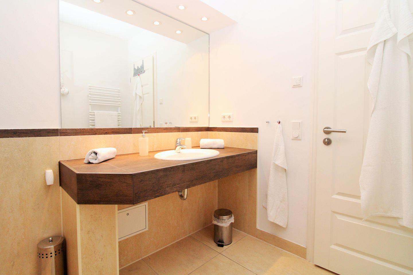 Das moderne Badezimmer verfügt über eine begehbare, ebenerdige und somit auch seniorenfreundliche Dusche, einen Waschtisch mit großem Wandspiegel, WC, Handtuch-Heizkörper sowie ausreichend Ablagemöglichkeiten.