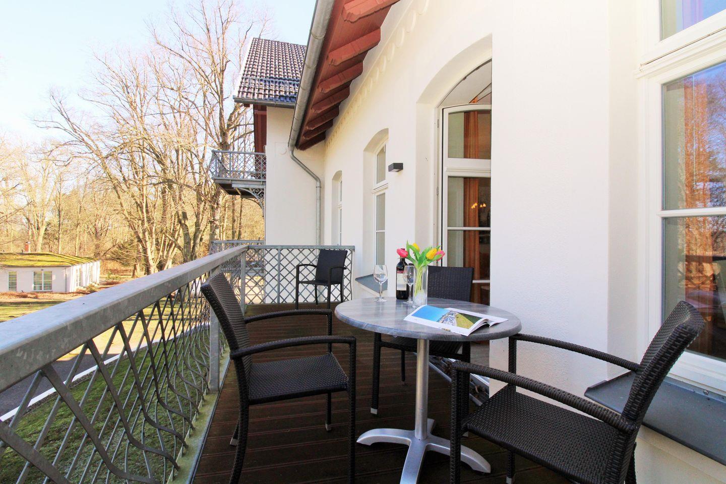 Das geräumige und gemütliche Wohn-/Esszimmer verfügt über eine separate Sitzgruppe mit bequemer (Schlaf-)Couch, 2 Sessel, Couchtisch, einen separaten Esstisch mit 4 Stühlen sowie ein Sideboard. Vom Wohnzimmer aus haben Sie direkten Zugang zu dem ca. 10 m² großen Balkon (nach Nord-Osten ausgerichtet) mit Balkonmöbeln. Hier sitzen Sie entspannt und gemütlich mit herrlichem Blick in den Schloßpark und können abends bei einem guten Glas Wein in Ruhe die lauen Sommernächte genießen!