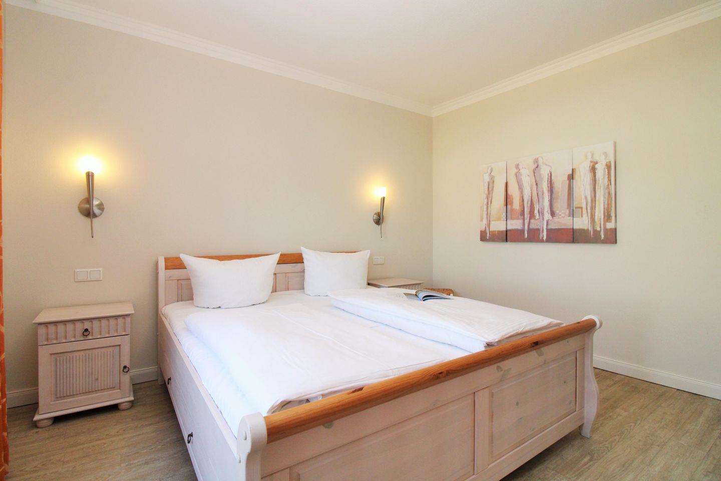 Das freundliche und behagliche Schlafzimmer ist mit einem bequemen Doppelbett, Nachttischen sowie einem geräumigen Kleiderschrank eingerichtet. Eine zusätzliche bequeme Schlafmöglichkeit für eine weitere 3. oder 4. Person bietet die ausziehbare Schlafcouch im Wohnzimmer.
