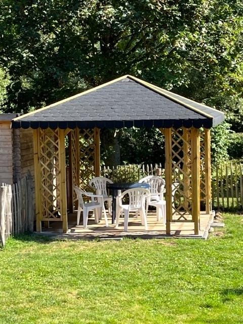 Ein mit Staketen umzäunter Garten von 300 qm mit einem Pavillon und Gartenmöbeln direkt neben