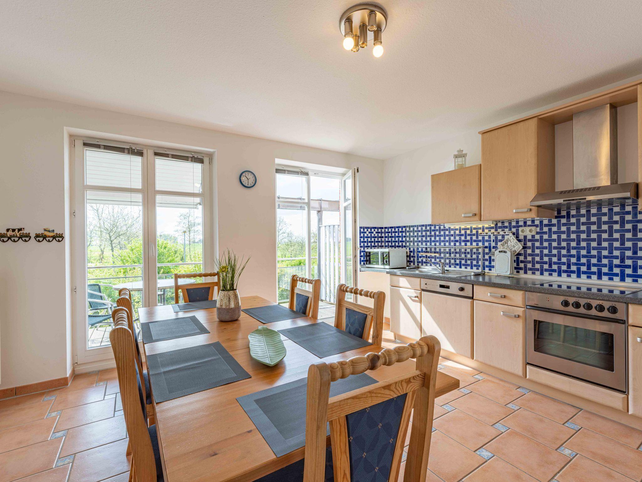 2. Obergeschoss: Küche mit Esstisch für 6 Personen, Kühl- und Gefrierkombination, Mikrowelle, Westbalkon mit Ostseeblick (Wohlenberger Wiek); Wohnzimmer mit TV, Kamin und Süd-Westfenstern (Blick auf die Wismarer Bucht und die Insel Walfisch).