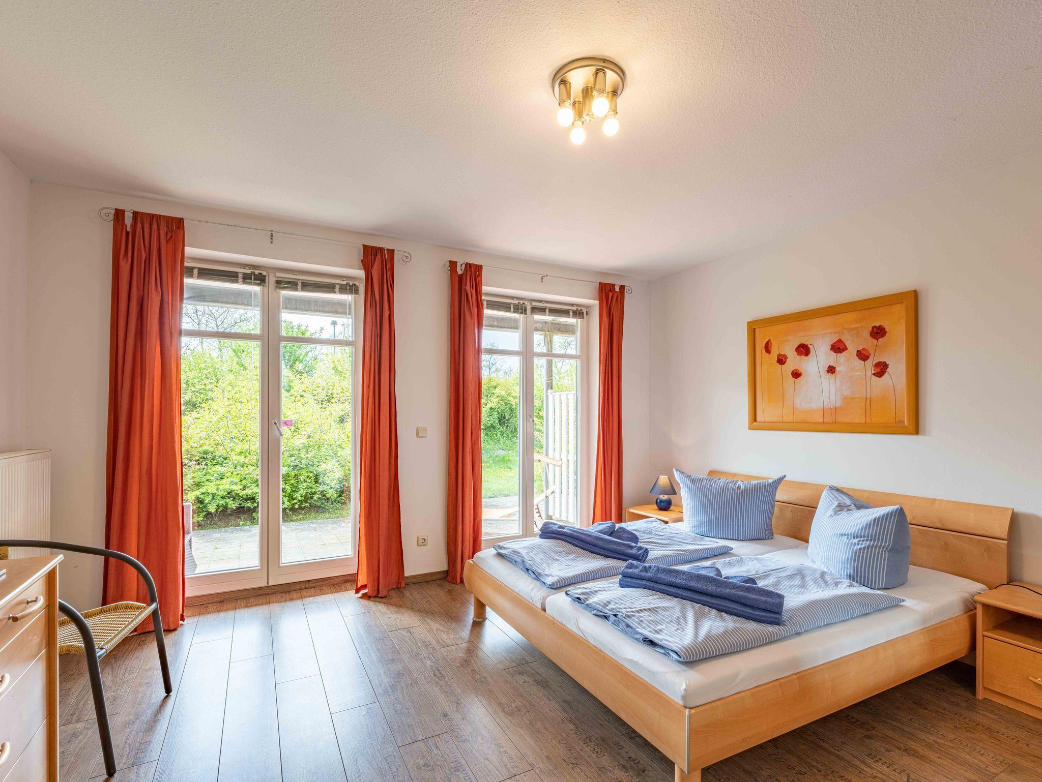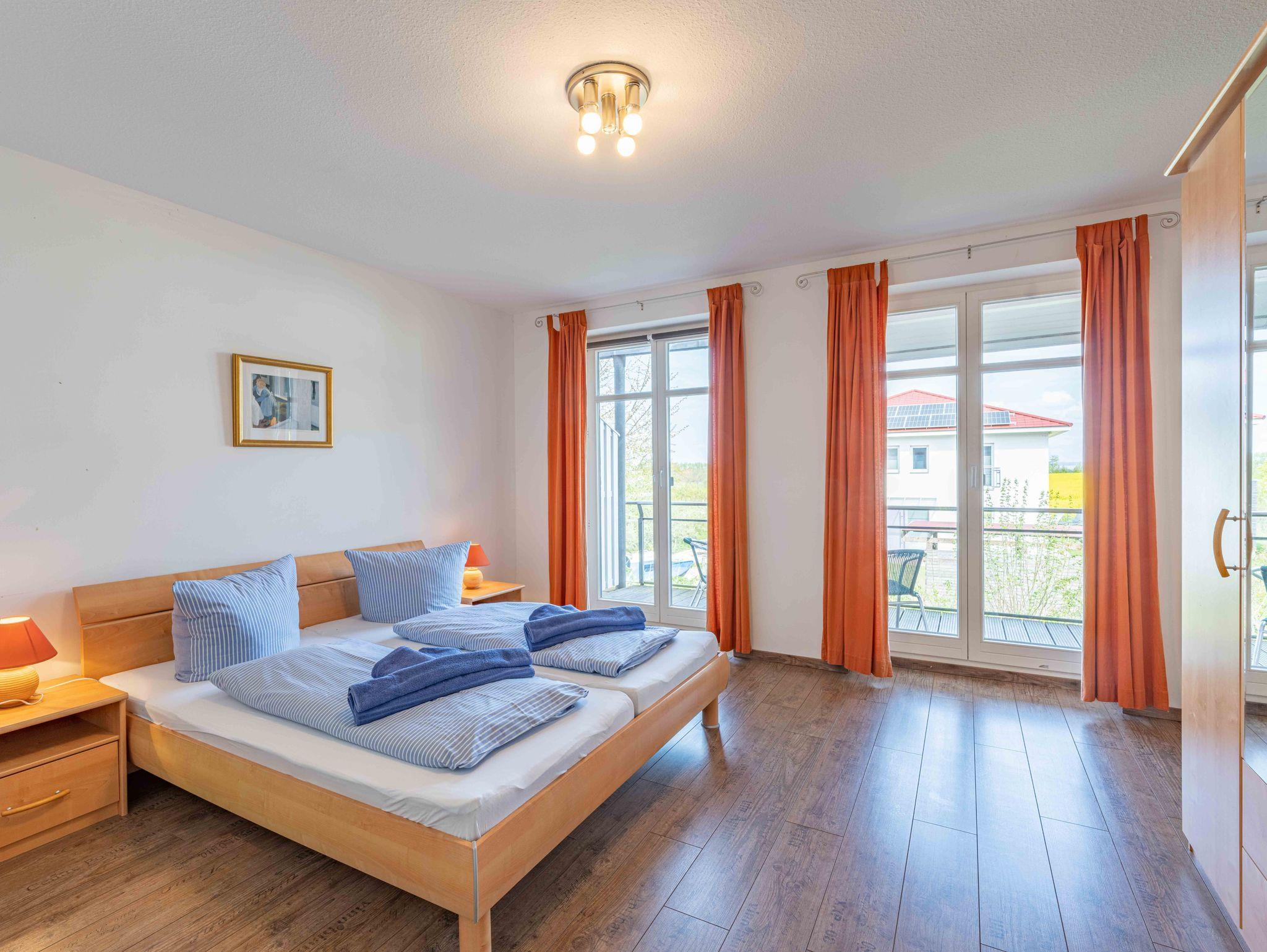 1. Obergeschoss: Schlafzimmer 2 mit Doppelbett, TV, Ostbalkon und Blick auf die Wismarer Bucht; Bad mit Dusche [&] Badewanne, sowie Fußbodenheizung
