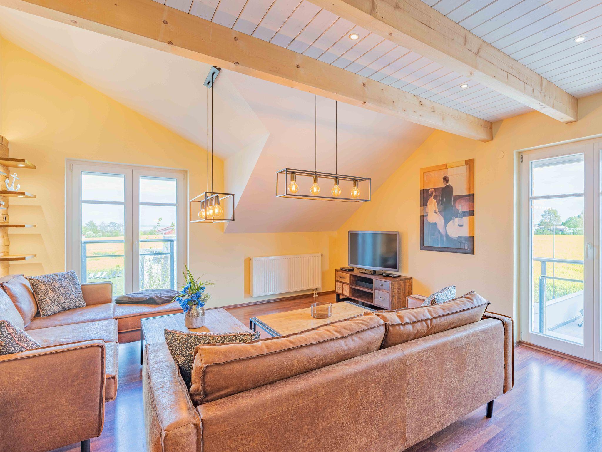 Dachgeschoss: Schlafzimmer mit TV und Ostseeblick (Wohlenberger Wiek); Empore Poelblick mit Schlafsofa und Sitzecke für 4-6 Personen, TV, sowie 4 großen Dachflächenfenstern inkl. Rolläden auf Ostseite