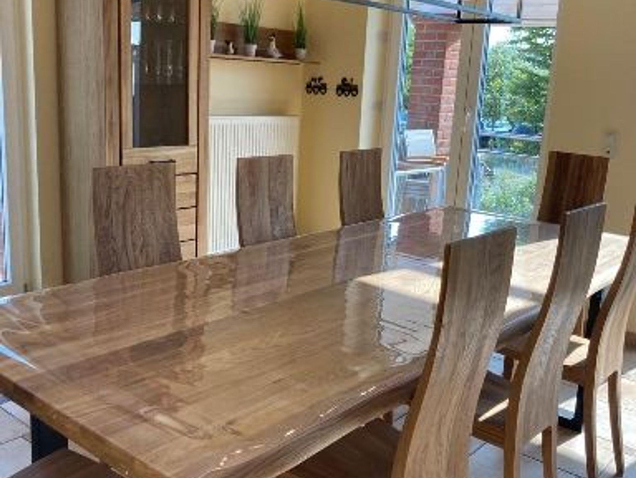 2. Obergeschoss: Küche mit Esstisch für 8 Personen, Kühl- und Gefrierkombination, Mikrowelle, Westbalkon mit Ostseeblick (Wohlenberger Wiek); Wohnzimmer mit TV, Kamin und Süd-Westfenstern (Blick auf die Wismarer Bucht und die Insel Poel), Bose Soundsystem mit Bluetooth
