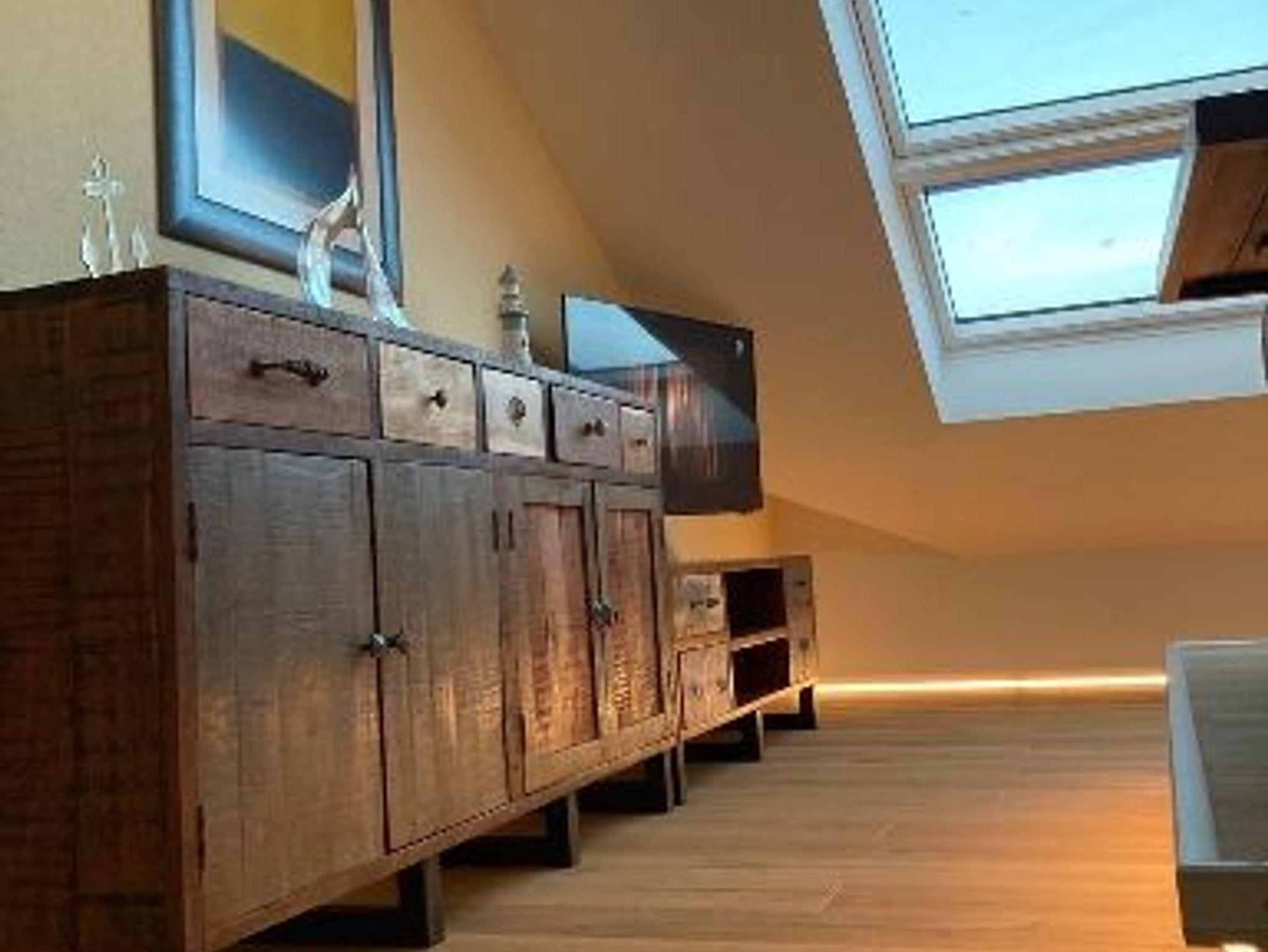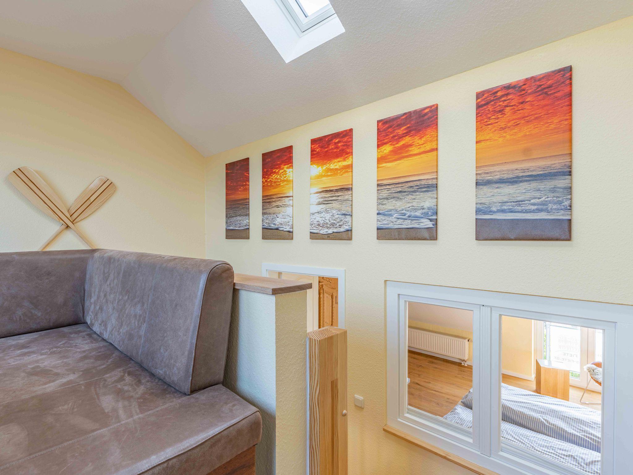 Dachgeschoss: Schlafzimmer mit TV und Ostseeblick (Wohlenberger Wiek); Empore „Poelblick“ mit Schlafsofa und Sitzecke für 4-6 Personen, TV, sowie 4 großen Dachflächenfenstern inkl. Rolläden auf Ostseite