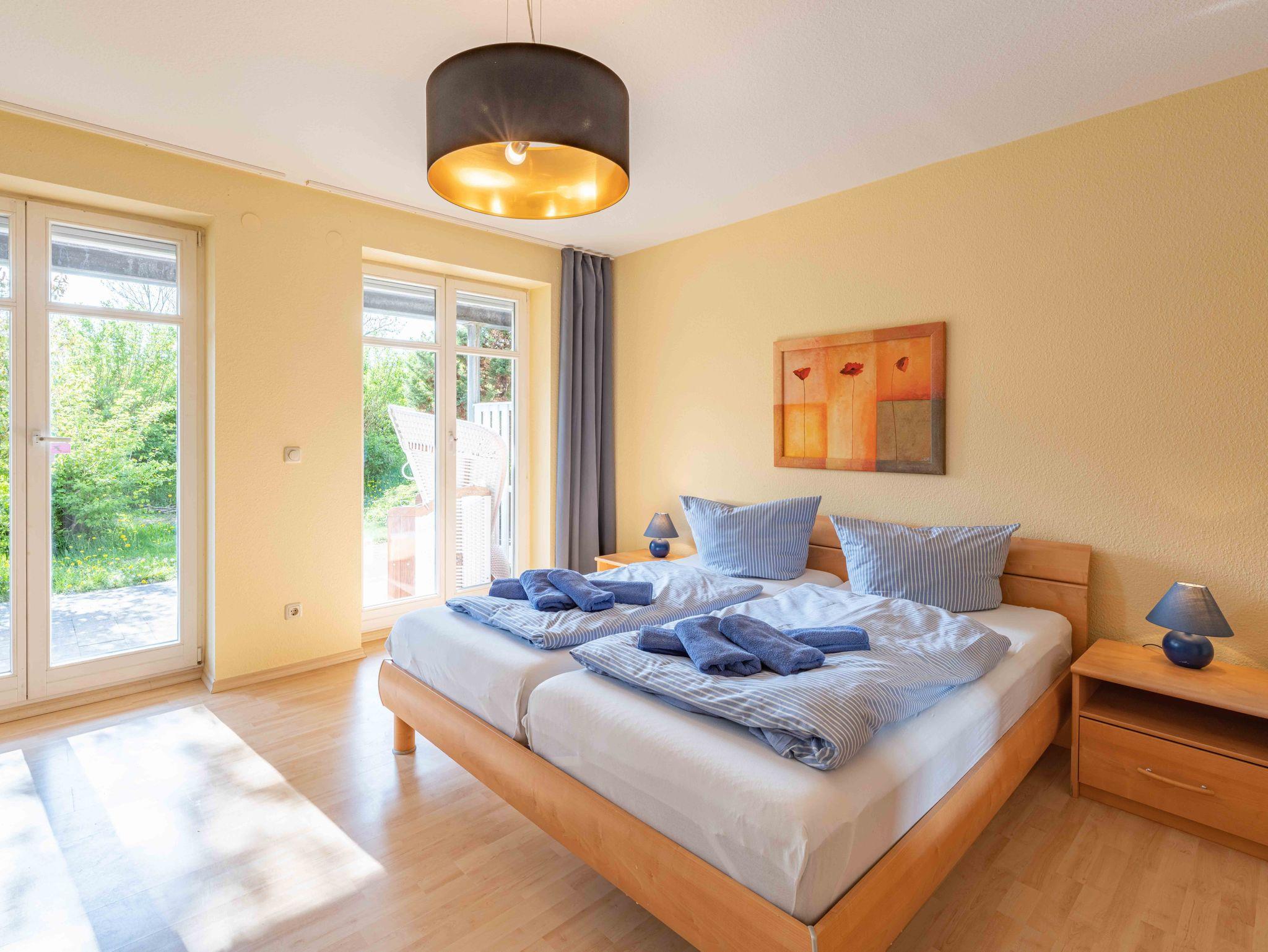 1. Obergeschoss: Schlafzimmer mit TV, Ostbalkon und Blick auf die Wismarer Bucht; Bad mit Dusche [&] Badewanne, sowie Fußbodenheizung