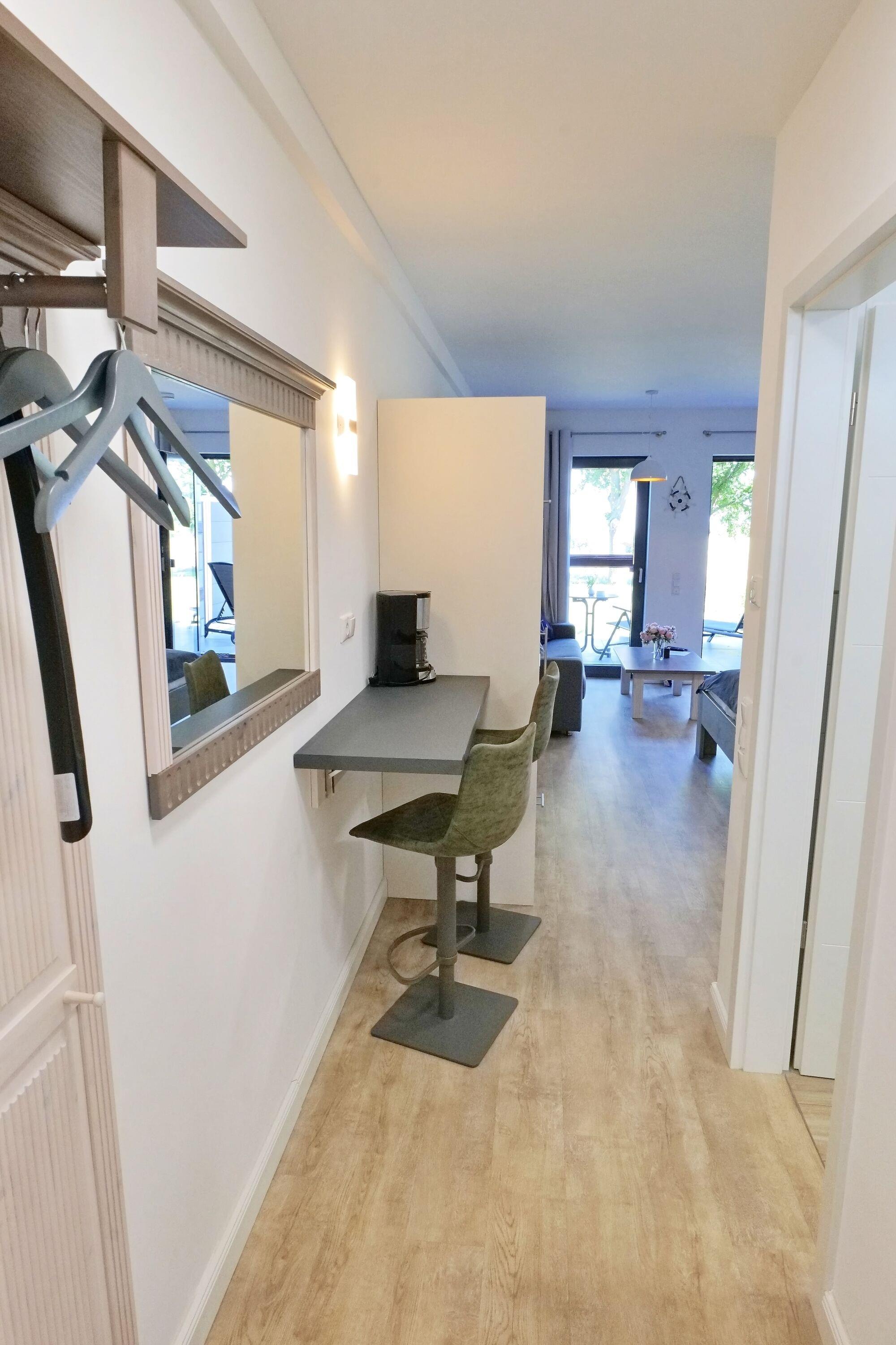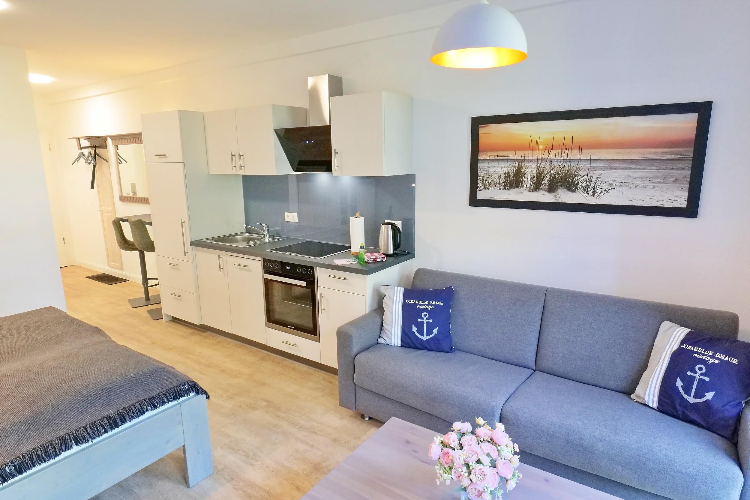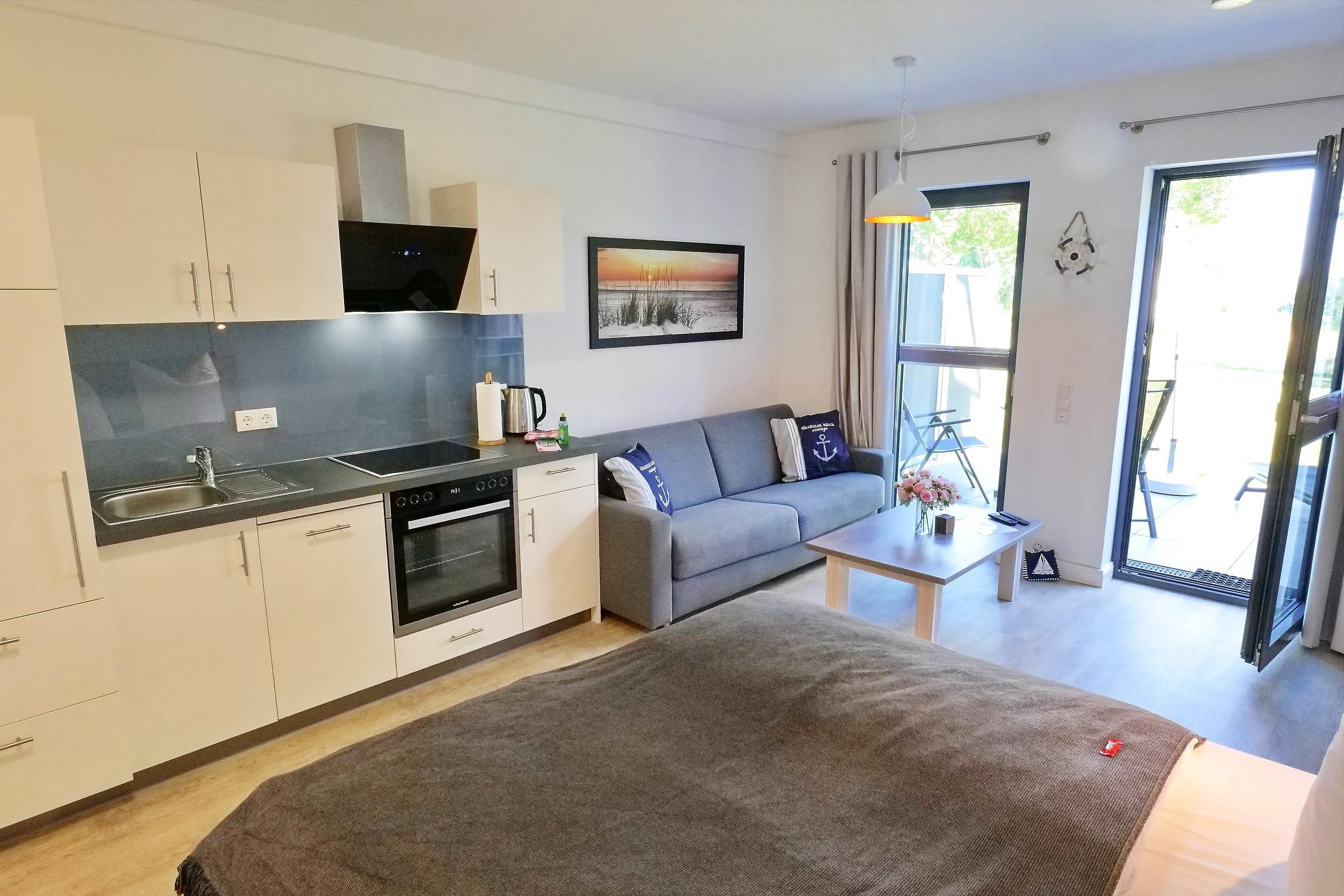 In unserem 1 Zimmer Komfort-Appartement Kleine Auszeit - Nr. 9 am Golfplatz sind Gäste mit Hund herzlich willkommen. Die Erdgeschosswohnung, mit saisonal möblierter Terrasse, bietet Ihnen eine Wohnfläche von ca. 37m². Eine Belegung ist mit bis zu zwei Personen möglich. Der hochwertig eingerichtete Wohn-/Schlaf-/Essbereich empfängt Sie mit einem Komfortsofa.