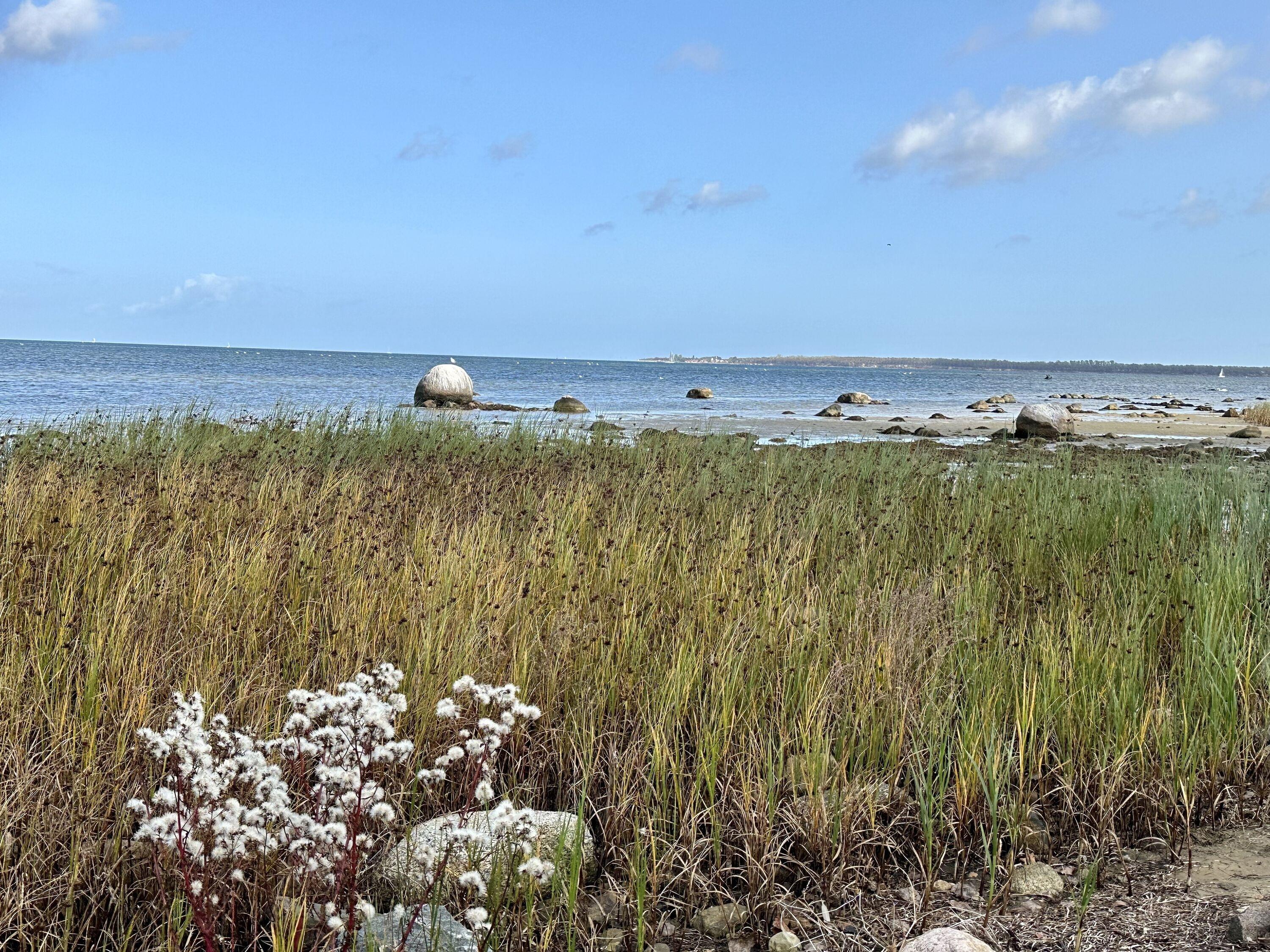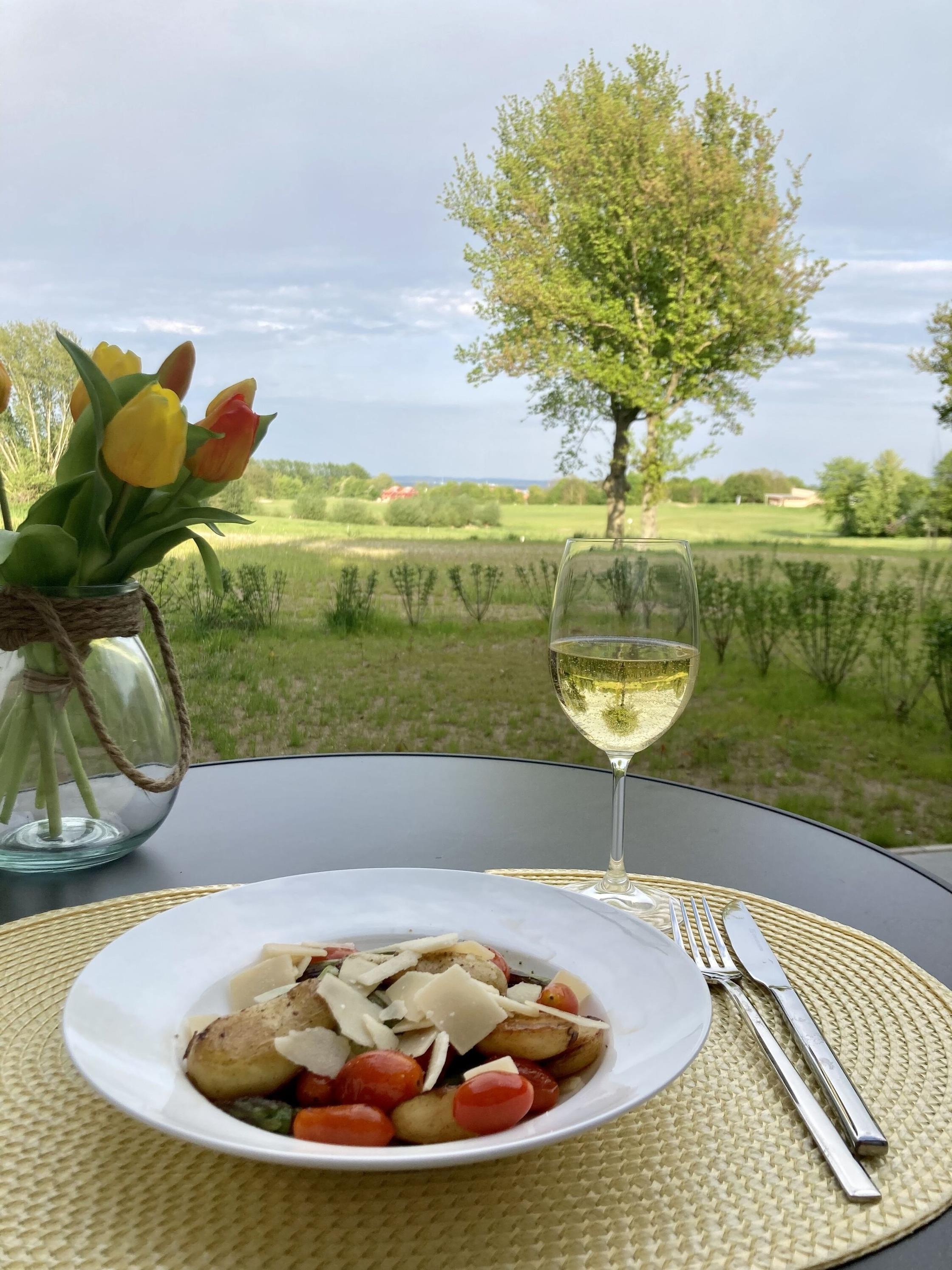 Die großzügige Terrasse mit Sitzgruppe und Sonnenschirm bietet direkten Zugang zum Garten. Von dort lässt sich der Blick auf den Golfplatz, die Ostsee und die Insel Poel genießen. Für Frühaufsteher: Den Sonnenaufgang begleitet von Vogelgezwitscher zu genießen, ist wunderbar.