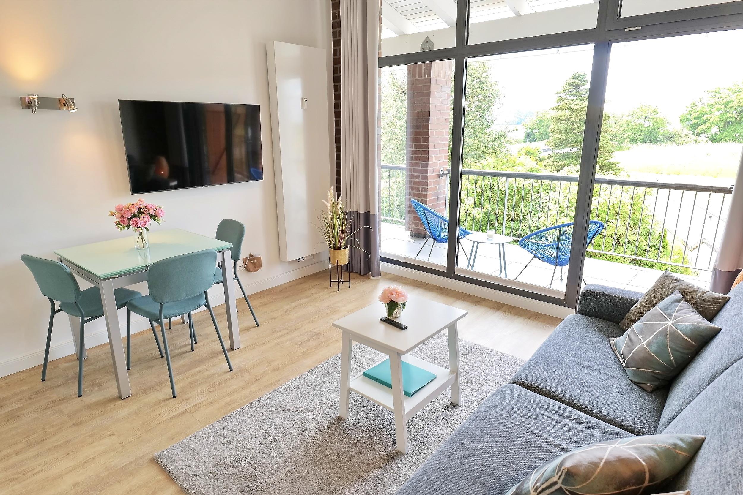 - Wohnzimmer mit Esstisch, Fernseher, vollständiger Küchenzeile mit Geschirrspülmaschine, kombiniertem Backofen/ Mikrowelle und einem komfortablen ausziehbaren Schlafsofa (2,0 x 1,6 m)