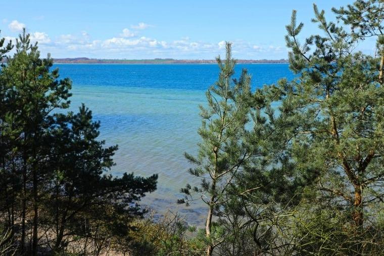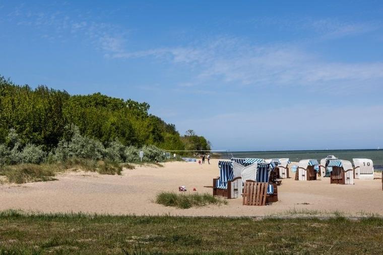 Von der Dachterrasse, die sich zur Westseite hin öffnet, hat man einen schönen Blick auf die Ostsee. Hier befinden sich ein Balkontisch, vier Stühle, eine Box mit Sitzkissen und ein Sonnenschirm.