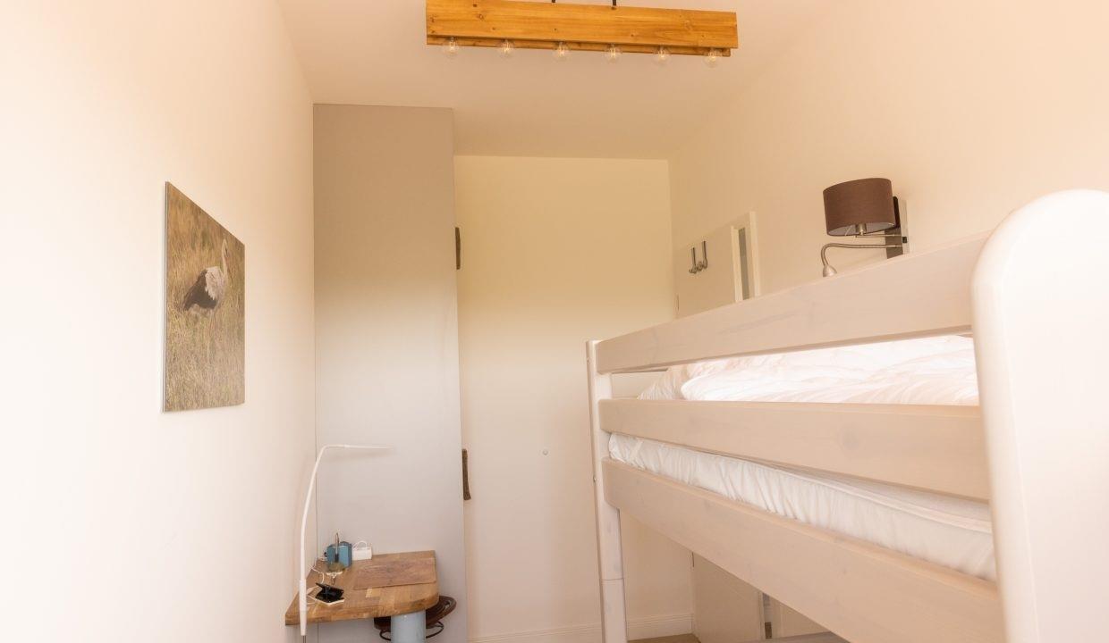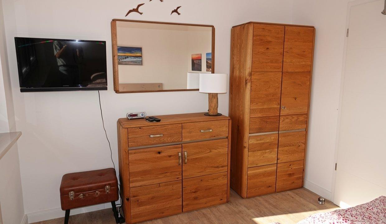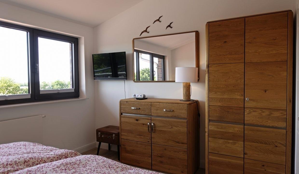 Die Wohnung verfügt über zwei Schlafzimmer, von denen eins mit einem Doppelbett, einer Kommode, einem Kleiderschrank, einem Spiegel und einem Flachbildschirmfernseher ausgestattet ist. Im zweiten Schlafzimmer steht ein Doppelstock-Bett, das auch für Erwachsene geeignet ist. Hier gibt es ebenfalls einen Kleiderschrank und einen kleinen Schreibtisch.