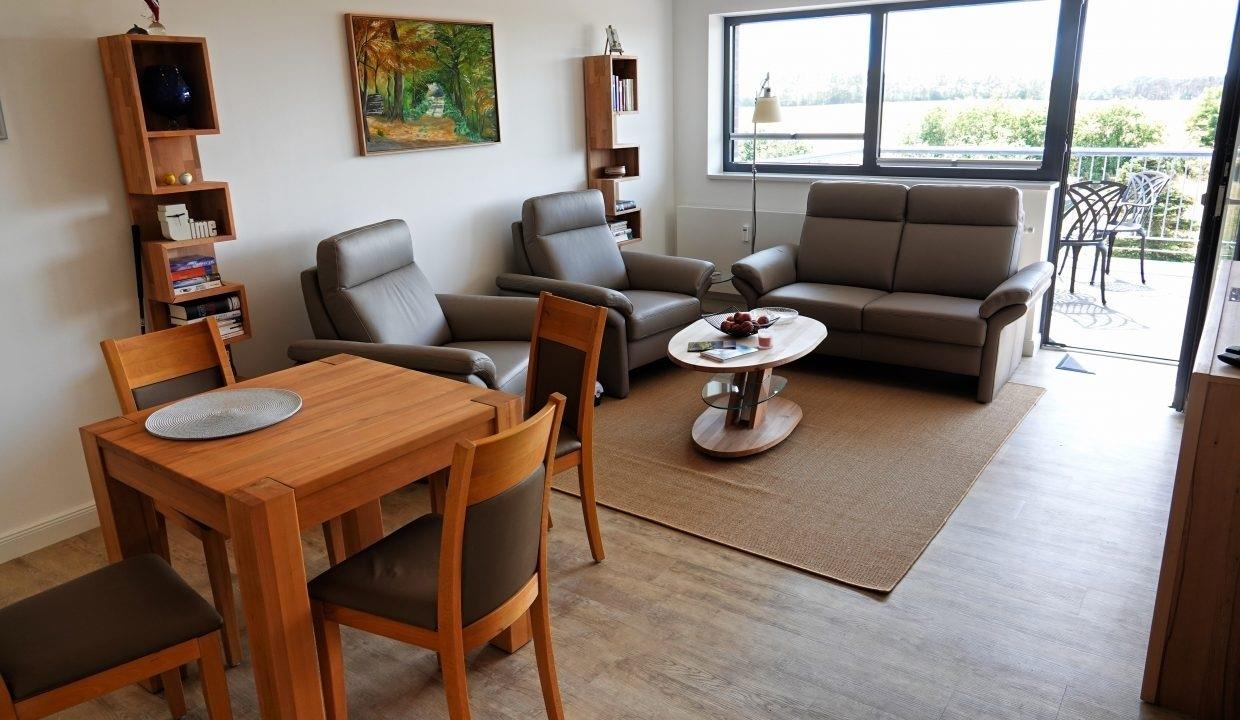 Im Wohnbereich befindet sich eine Ledersitzgarnitur, bestehend aus einem gemütlichen 2-Sitzer-Sofa und zwei großen Sesseln. Ein Couchtisch, ein Beistelltisch, Regale, ein Sideboard und eine Vitrine gehören ebenfalls zur Einrichtung. Zur Unterhaltung steht ein Flachbildschirmfernseher (Magenta-TV) sowie eine Stereoanlage zur Verfügung.