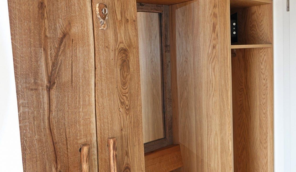 Das Badezimmer ist mit einer Glasdusche, einem Spiegelschrank und einem Waschtischunterschrank aus Massivholz ausgestattet.