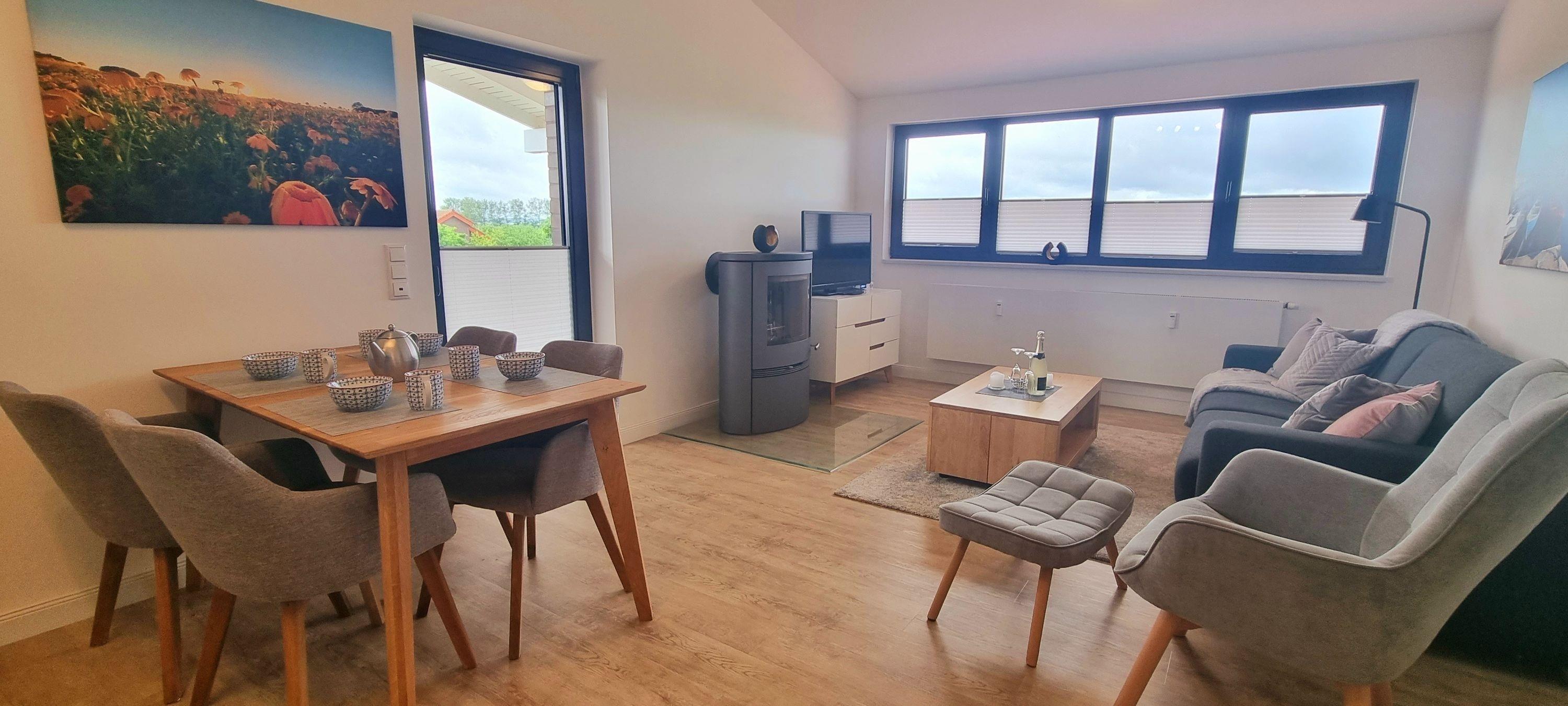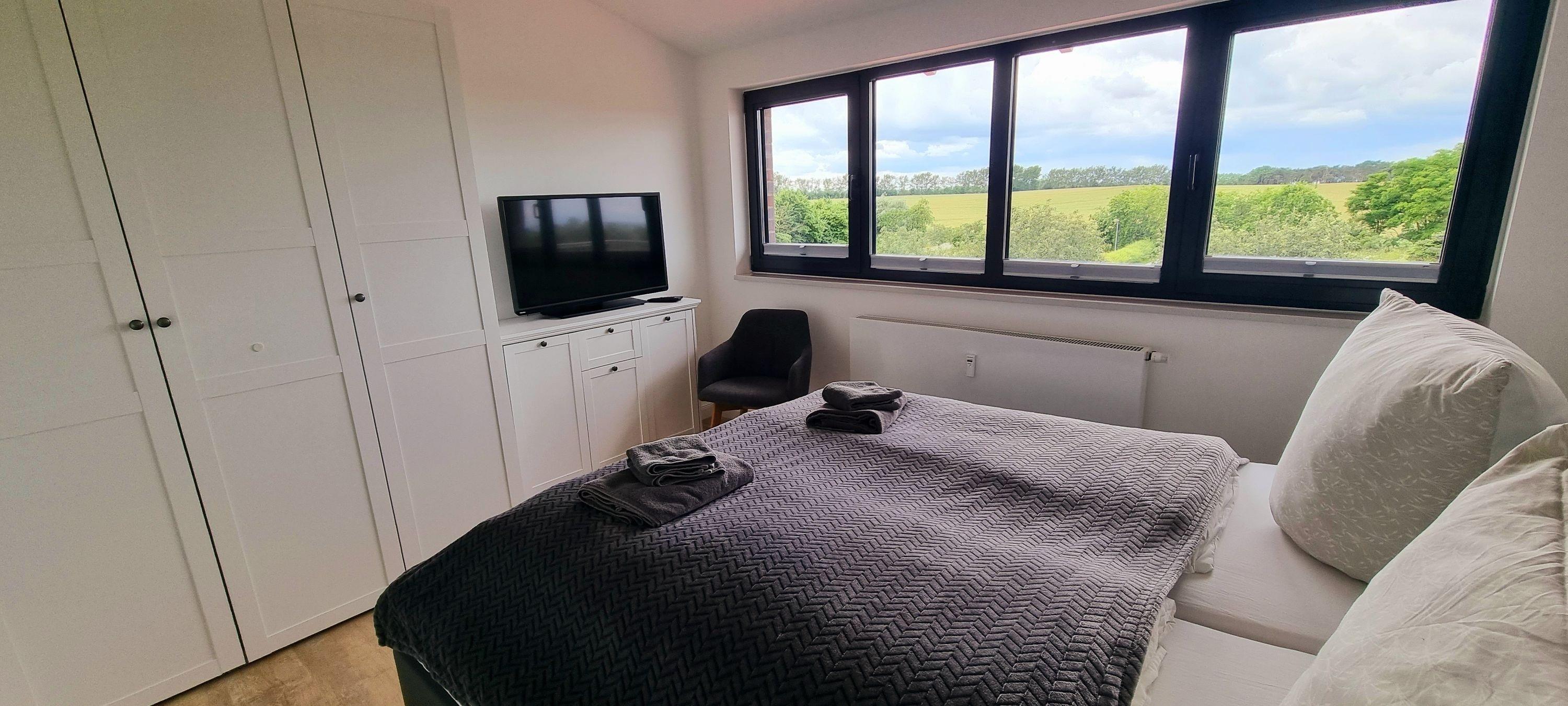 Dieses hochwertig eingerichtete Appartement befindet sich in der obersten Etage der Appartementanlage "Aurora Vista" in Hohen-Wieschendorf und verfügt über ein separates Schlafzimmer mit TV und Doppelbett.