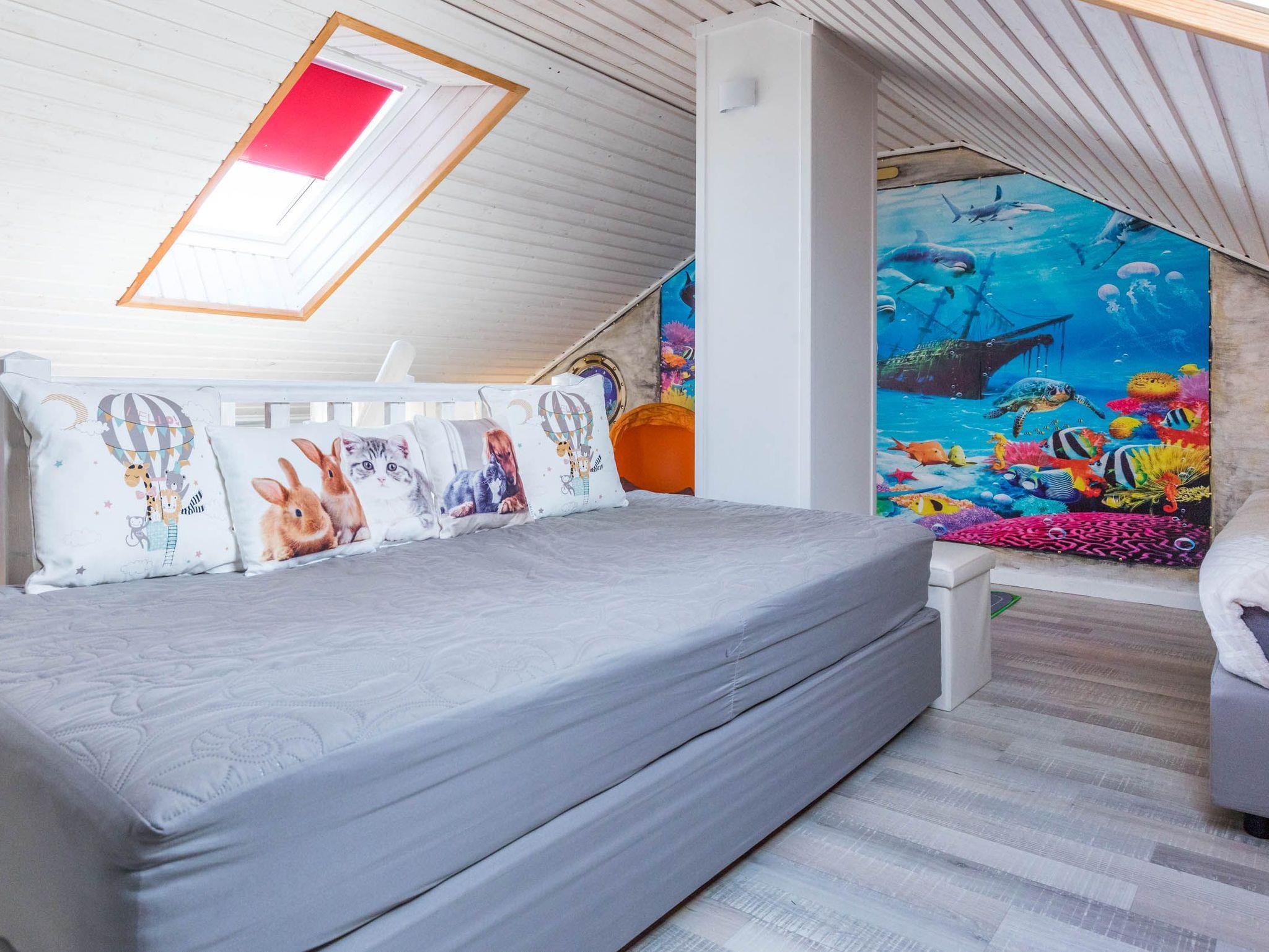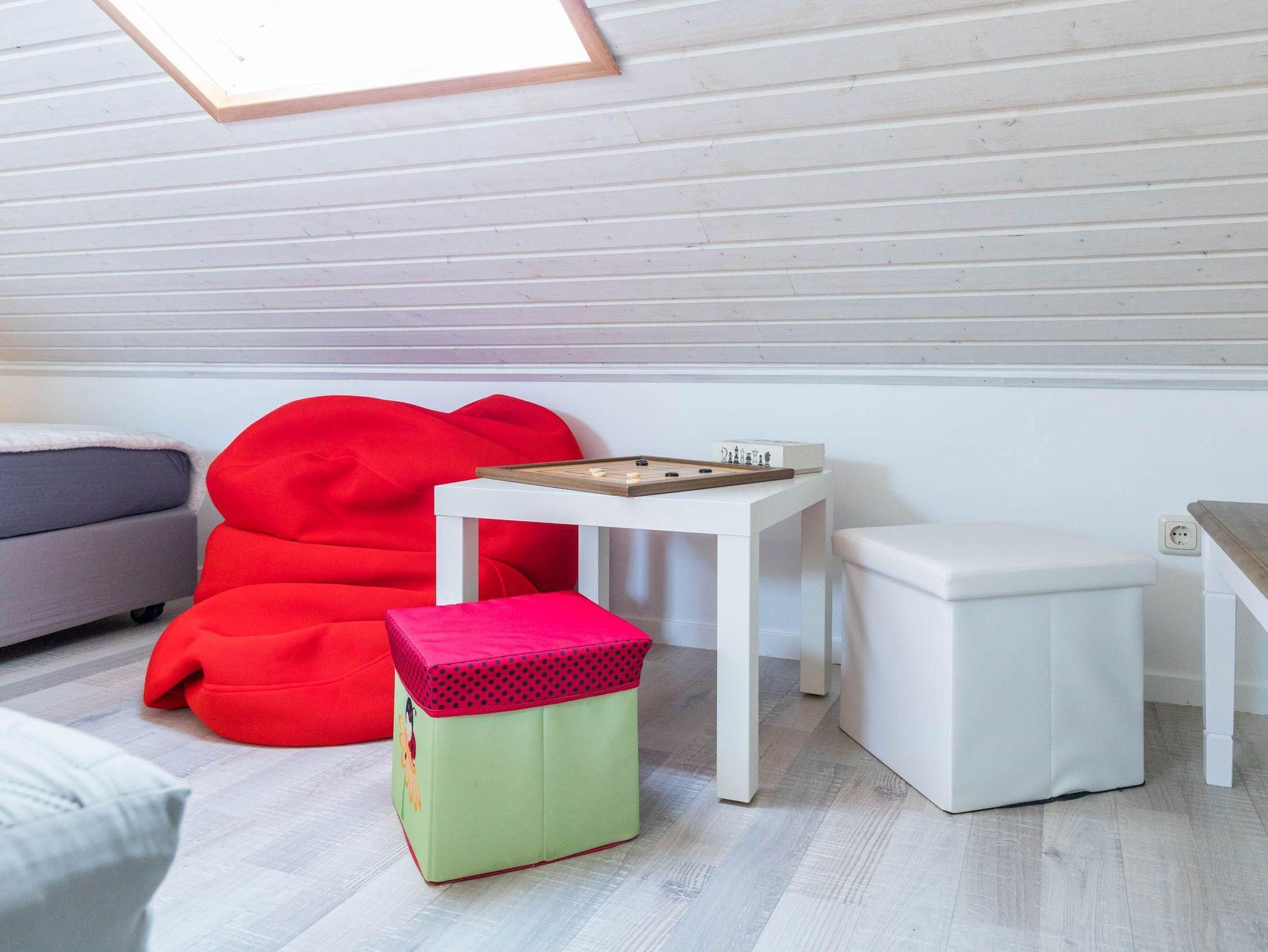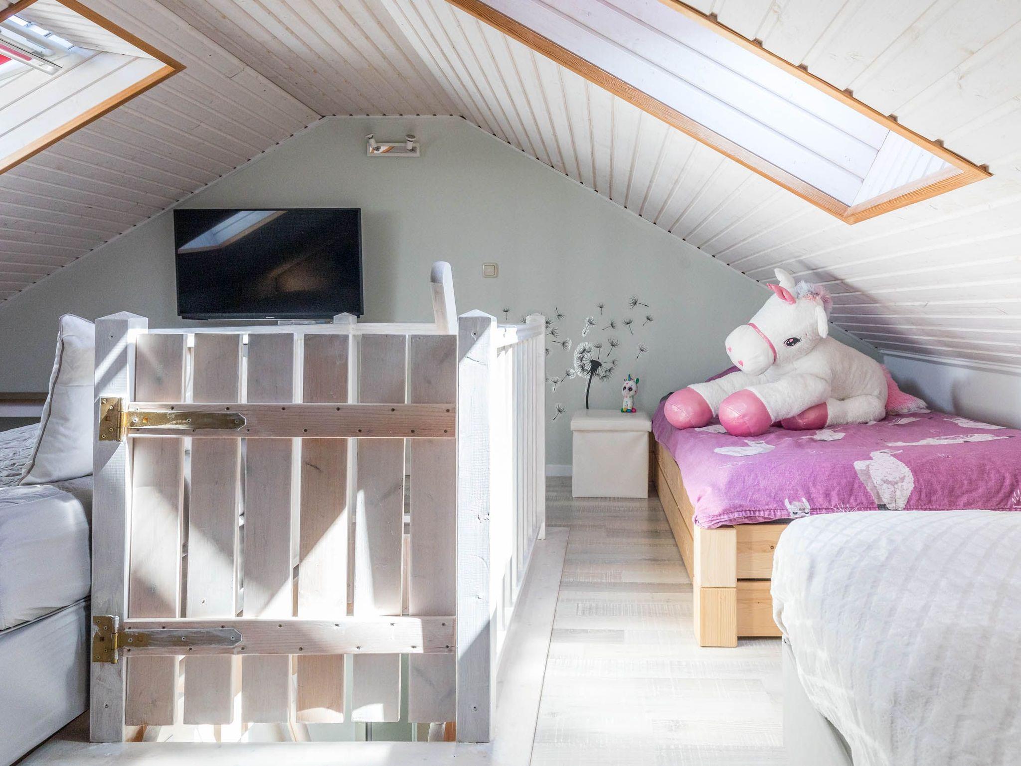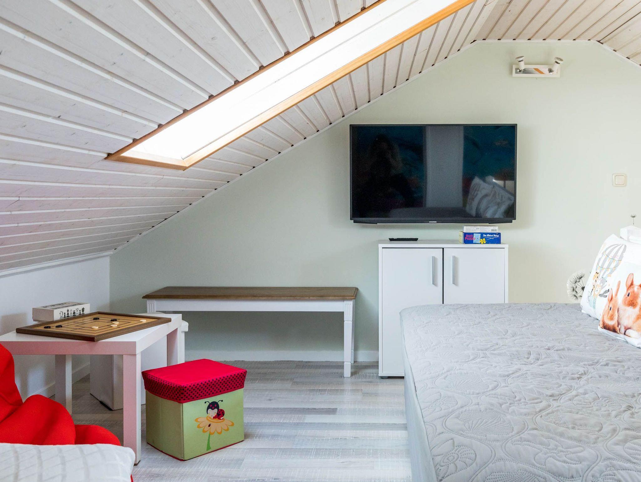 Das Schlafzimmer ist mit einem Doppelbett und einem geräumigen Kleiderschrank ausgestattet. Außerdem ist ausreichend Platz für das Babybett. Vom Wohnbereich aus gelangen Sie über eine Raumspartreppe ins offene Dachgeschoss. Dieser Bereich ist eher für größere Kinder geeignet. Hier stehen 3 Einzelbetten und ein Sofa bereit. Ein eigener Flatscreen-TV[nbsp] an der Wand sorgt auch auf dieser Etage für Unterhaltung.