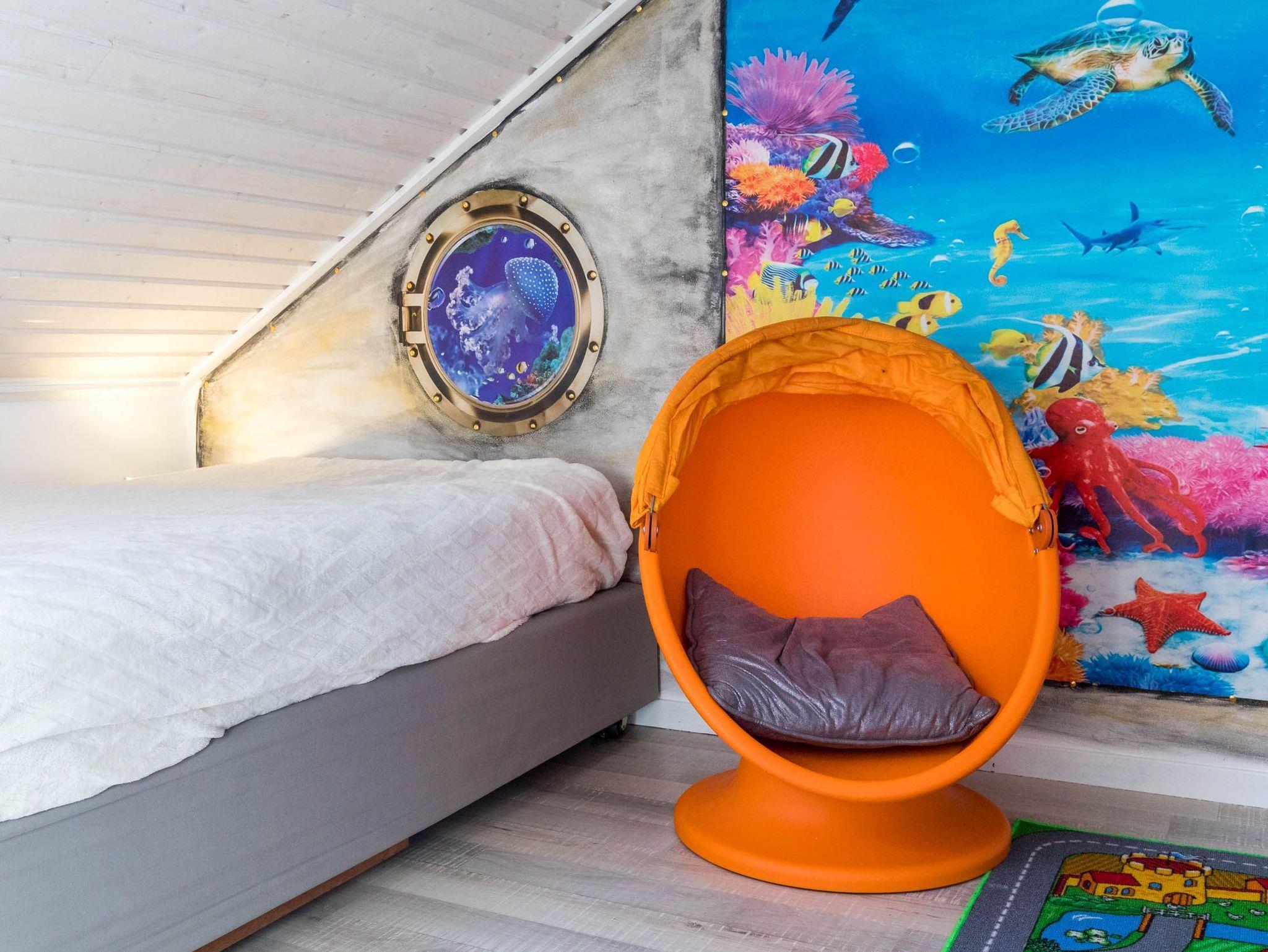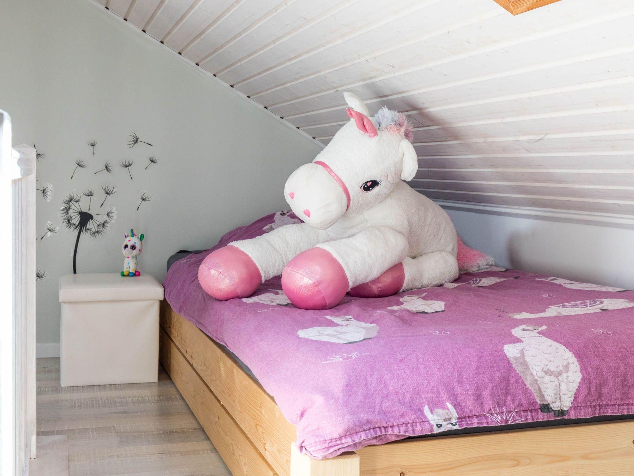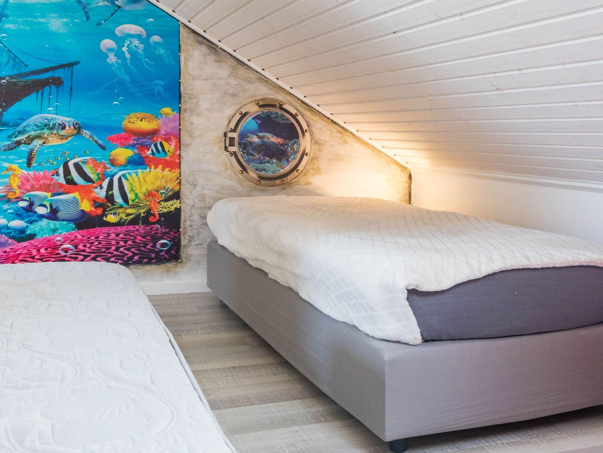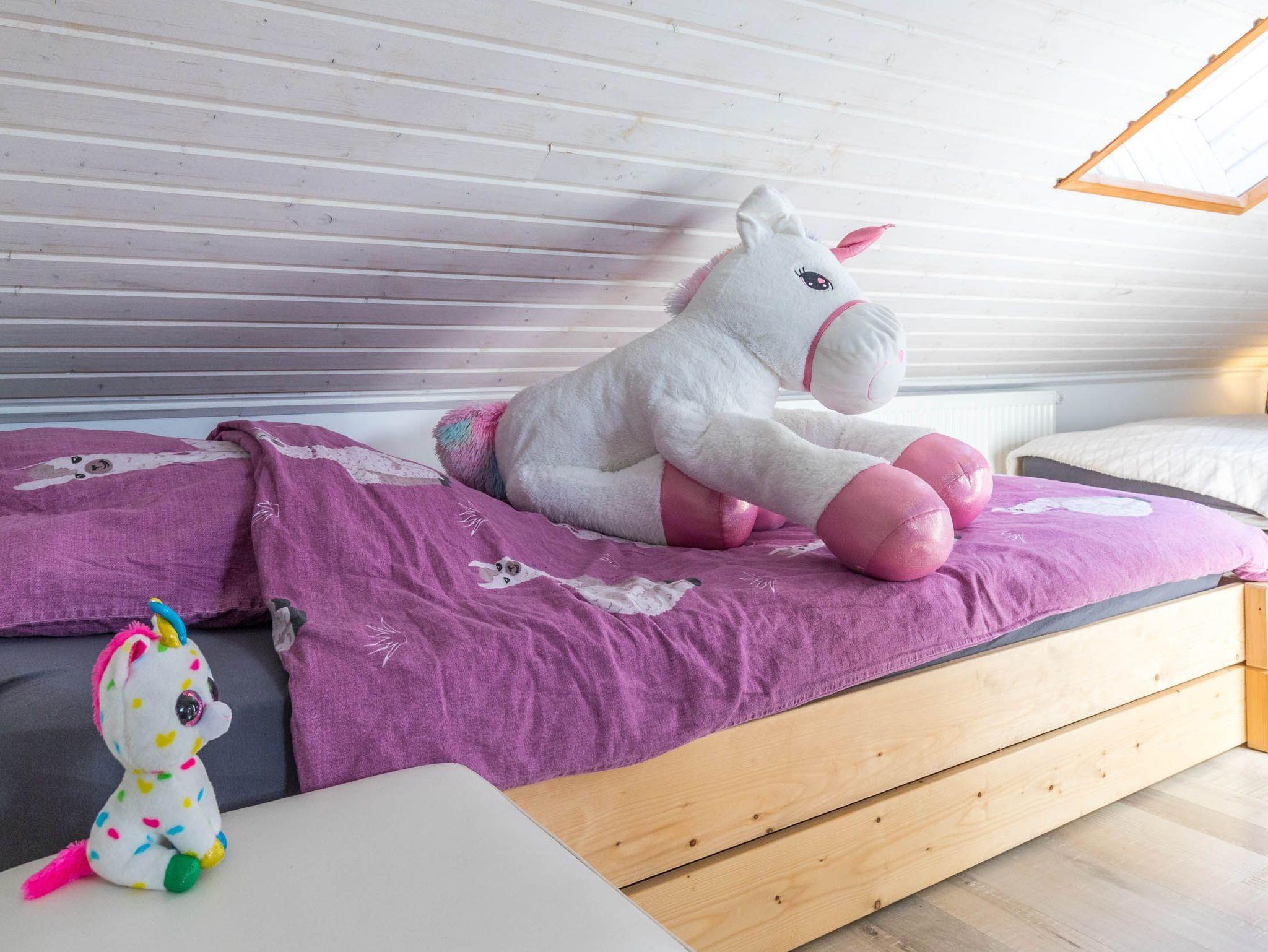 Das Schlafzimmer ist mit einem Doppelbett und einem geräumigen Kleiderschrank ausgestattet. Außerdem ist ausreichend Platz für das Babybett. Vom Wohnbereich aus gelangen Sie über eine Raumspartreppe ins offene Dachgeschoss. Dieser Bereich ist eher für größere Kinder geeignet. Hier stehen 3 Einzelbetten und ein Sofa bereit. Ein eigener Flatscreen-TV[nbsp] an der Wand sorgt auch auf dieser Etage für Unterhaltung.
