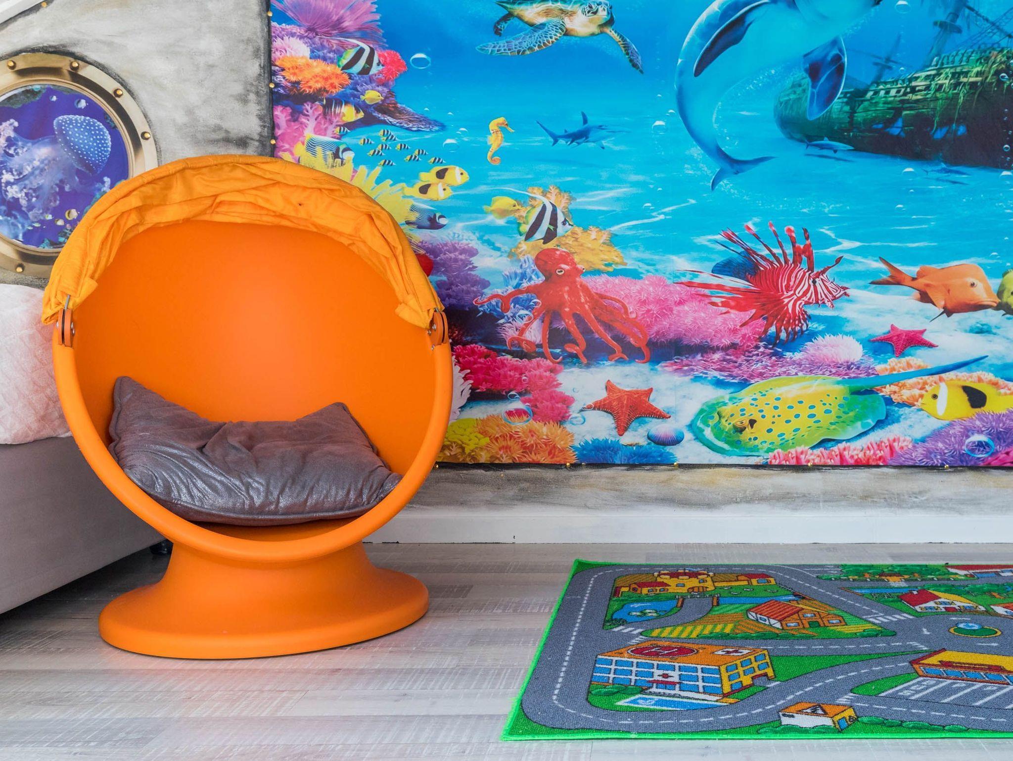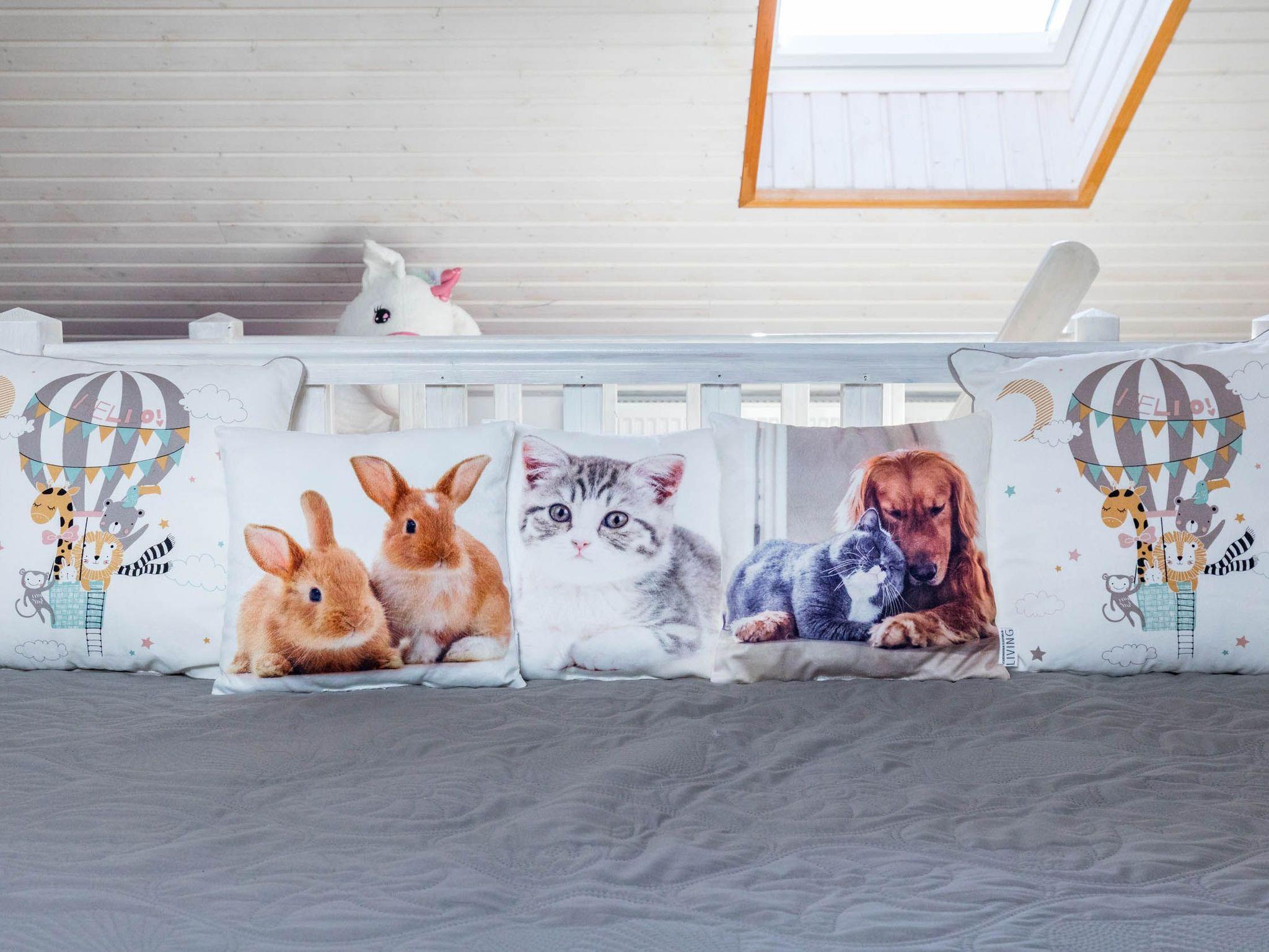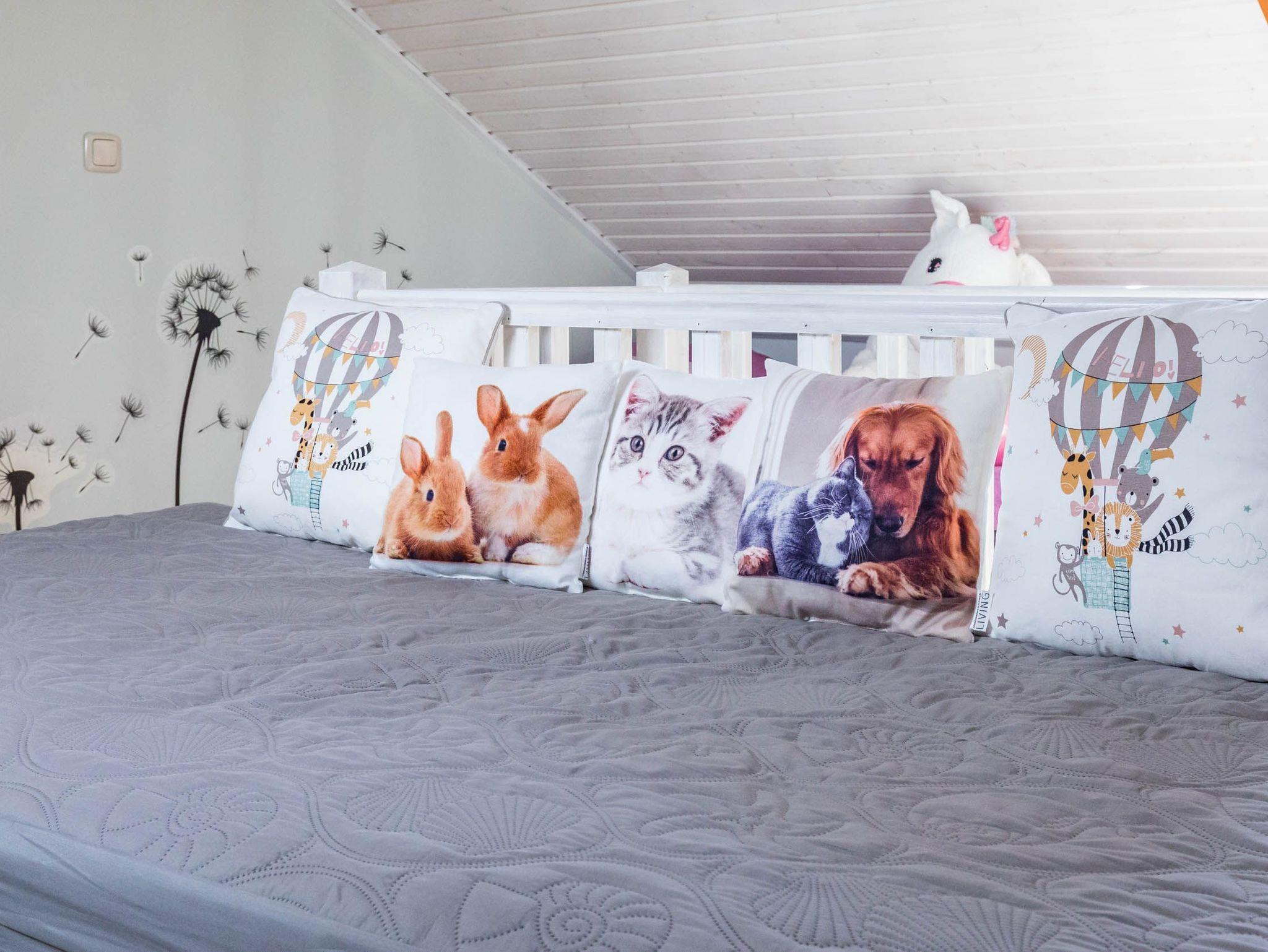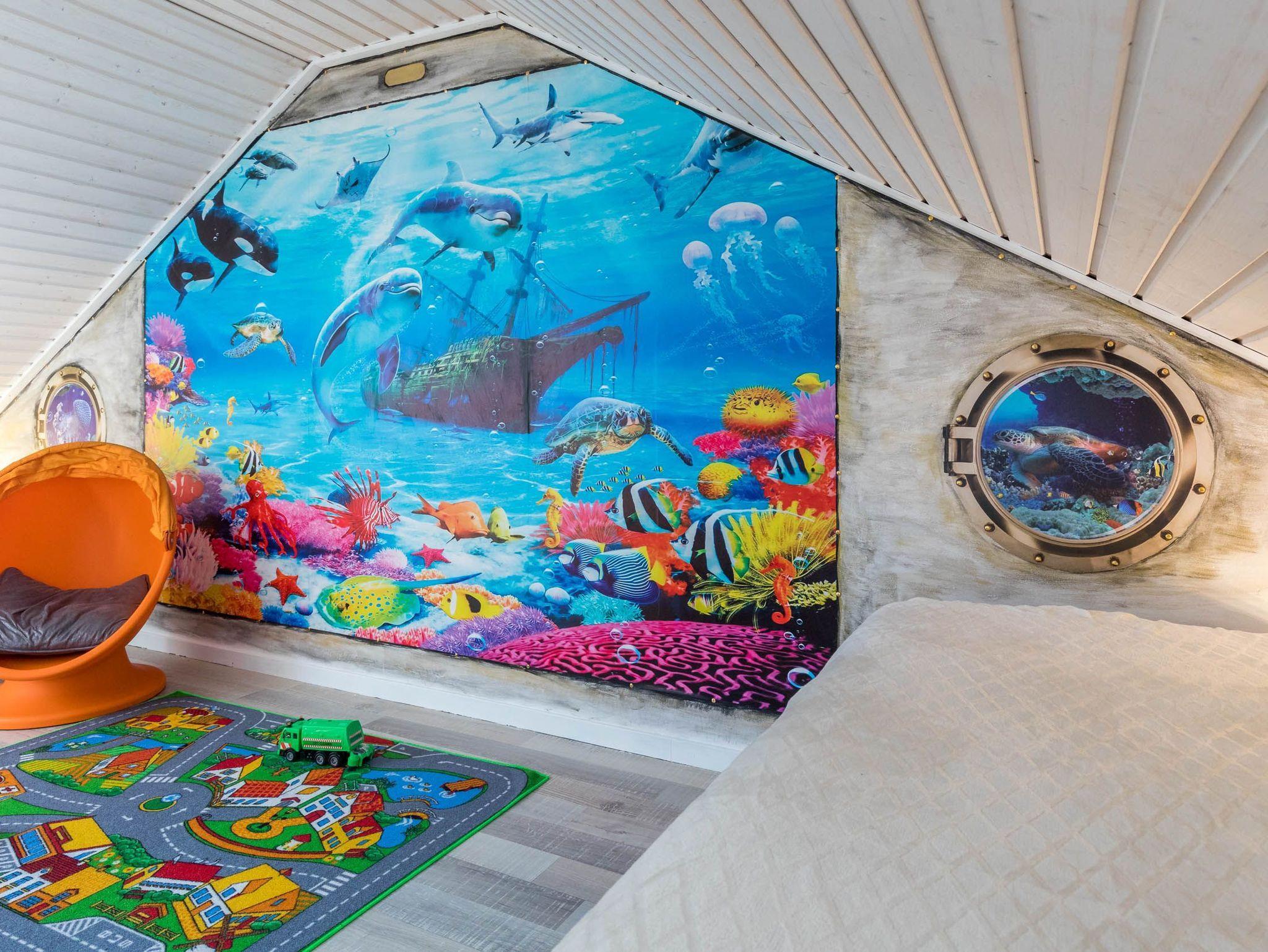 Das Schlafzimmer ist mit einem Doppelbett und einem geräumigen Kleiderschrank ausgestattet. Außerdem ist ausreichend Platz für das Babybett. Vom Wohnbereich aus gelangen Sie über eine Raumspartreppe ins offene Dachgeschoss. Dieser Bereich ist eher für größere Kinder geeignet. Hier stehen 3 Einzelbetten und ein Sofa bereit. Ein eigener Flatscreen-TV[nbsp] an der Wand sorgt auch auf dieser Etage für Unterhaltung.