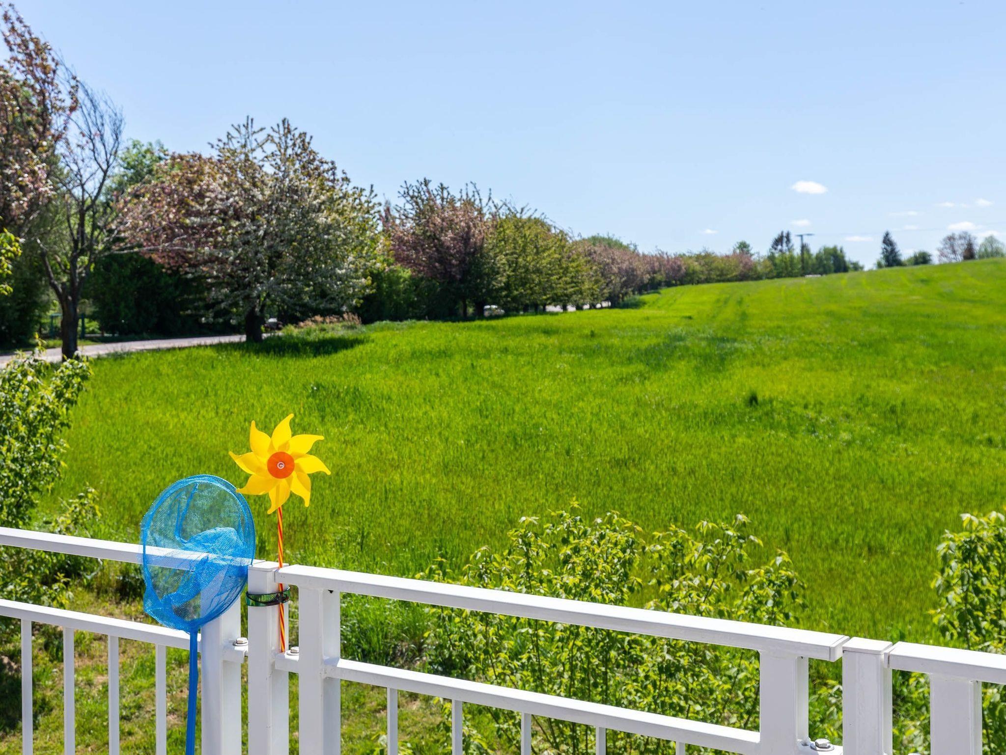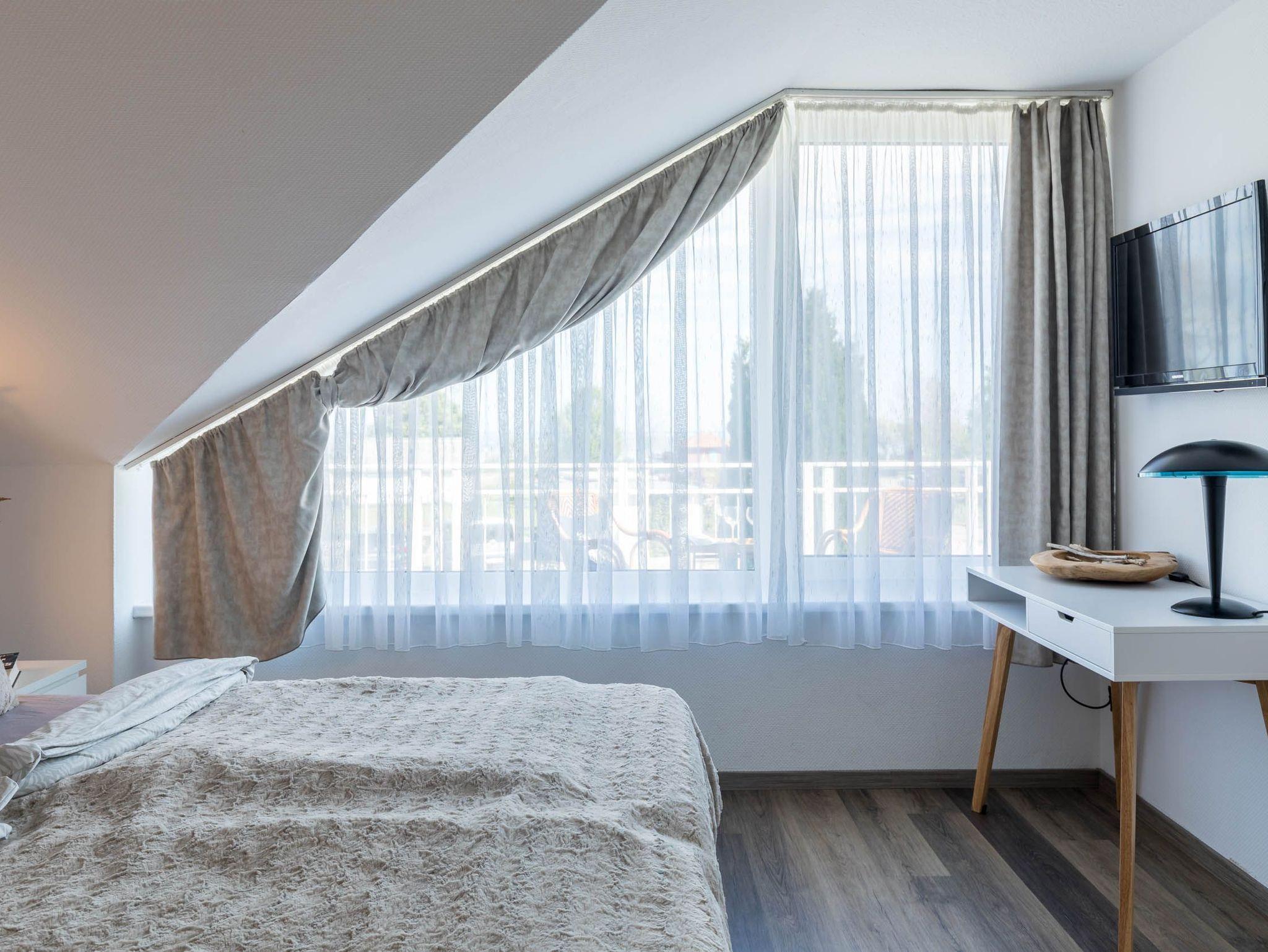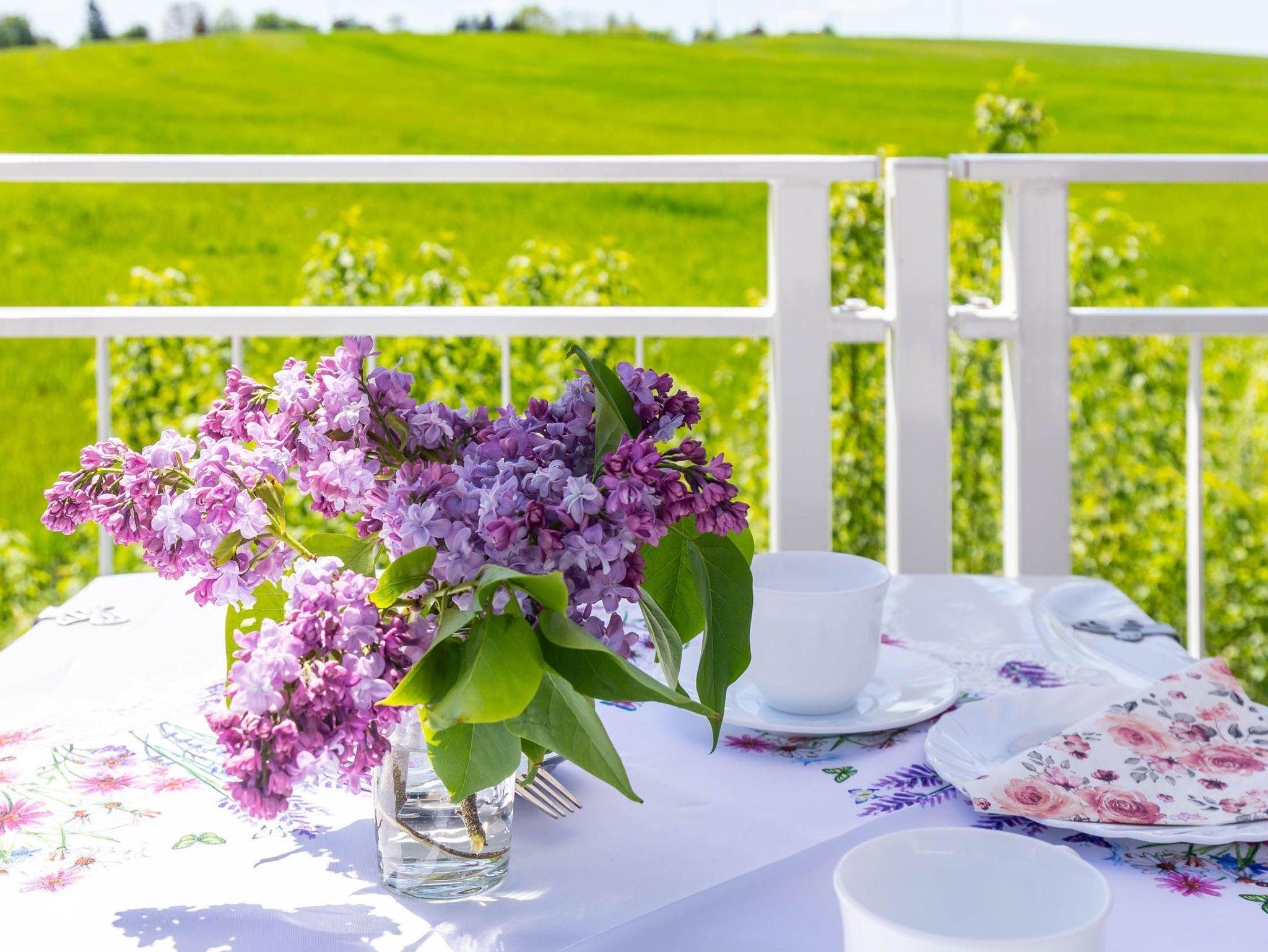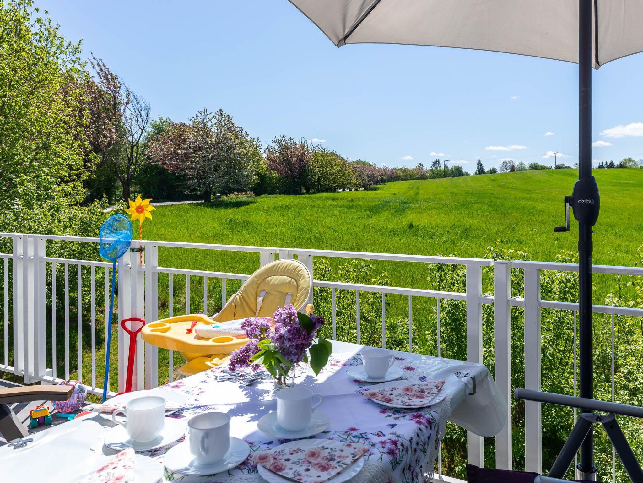 Von hier aus begehen Sie auch den möblierten Südbalkon mit Blick ins Grüne.
