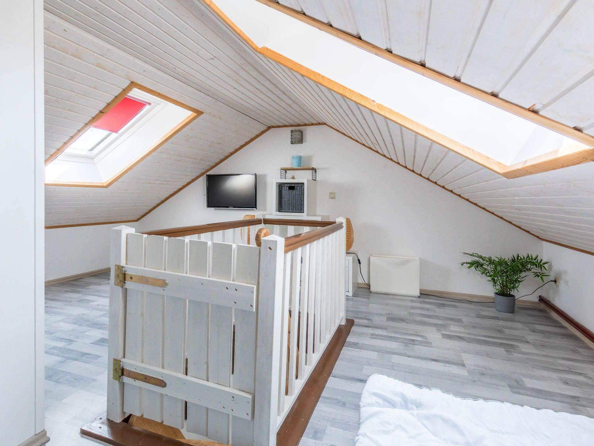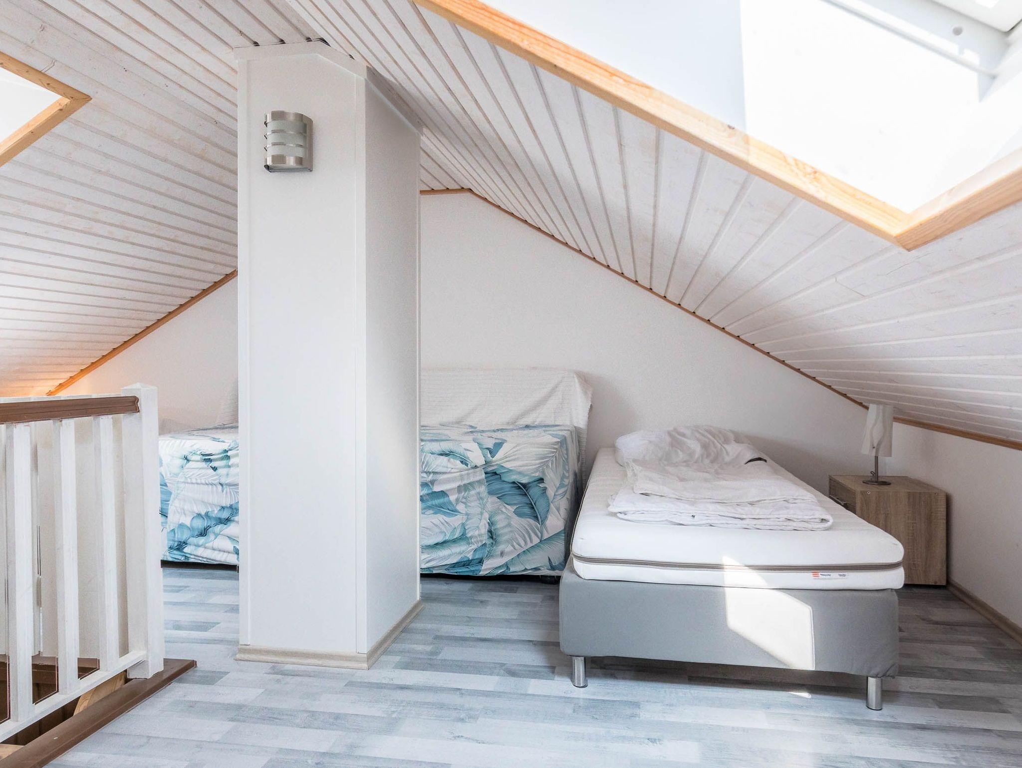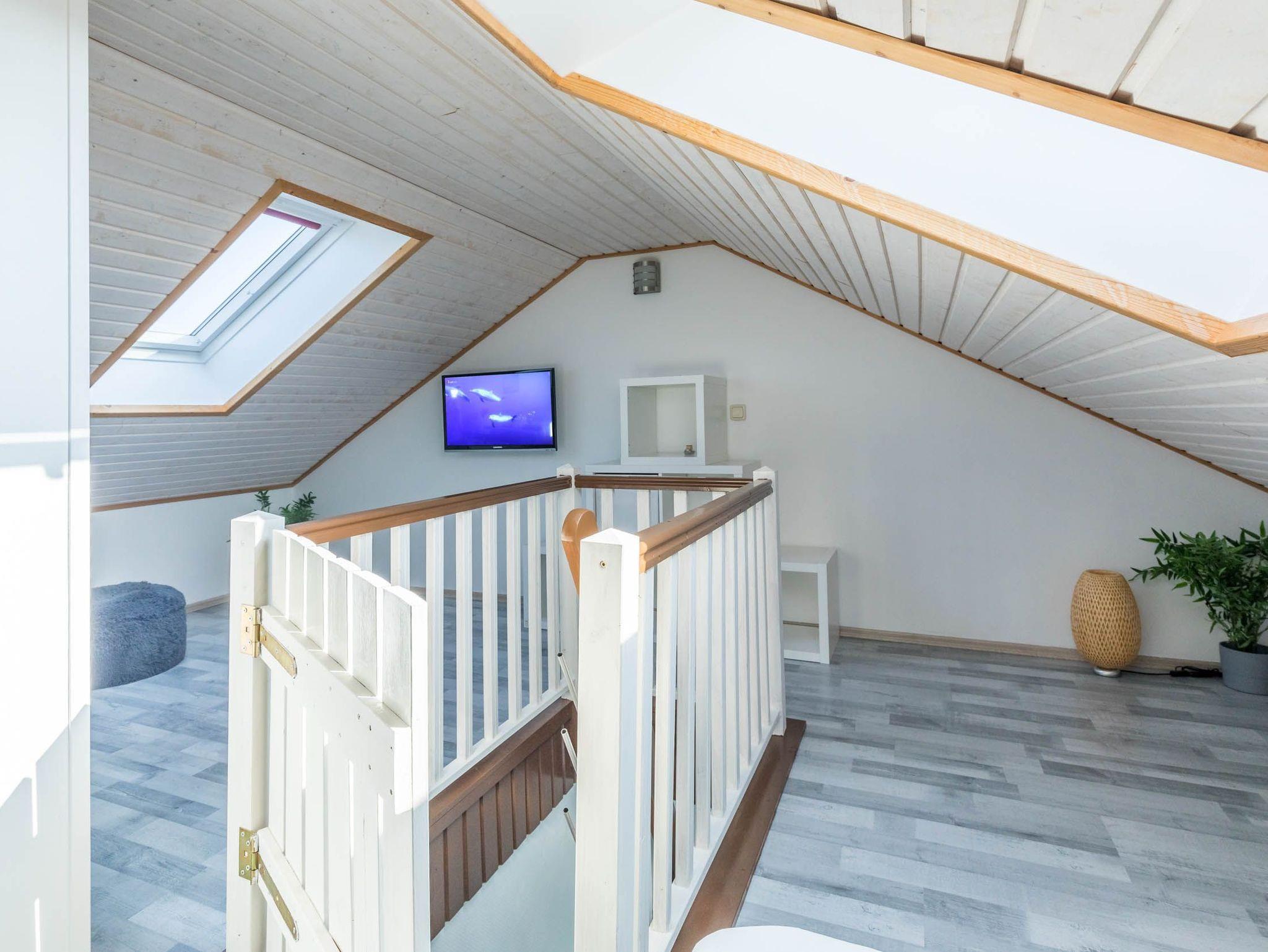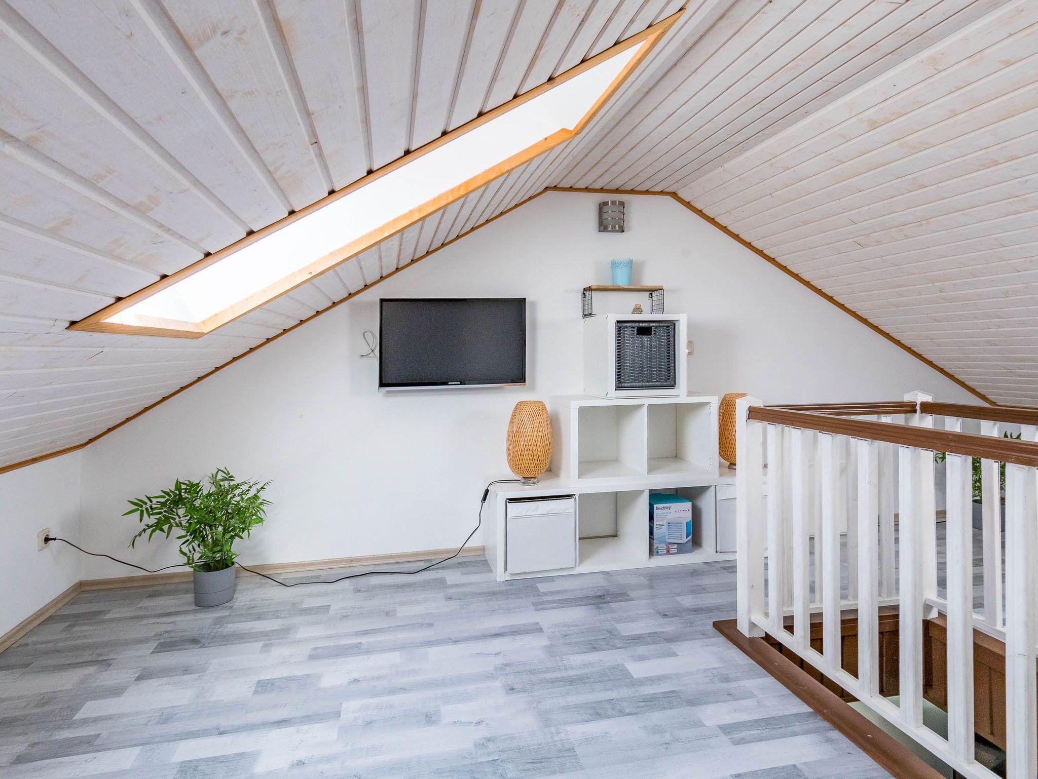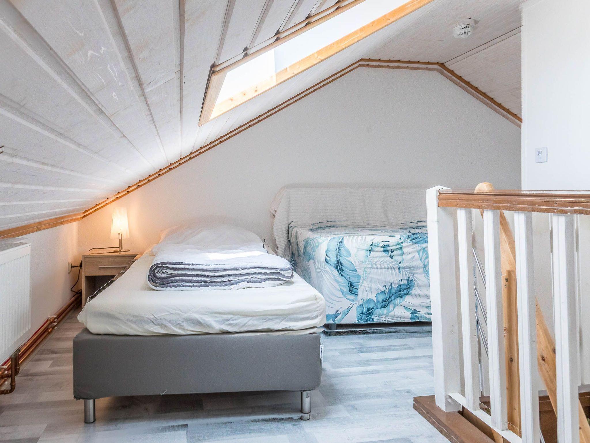 Vom Wohnbereich aus gelangen Sie über eine Raumspartreppe ins offene Dachgeschoss. Dieser Bereich ist eher für größere Kinder geeignet. Hier stehen Einzelbetten bereit. Ein eigener Flatscreen-TV an der Wand sorgt auch auf dieser Etage für Unterhaltung.