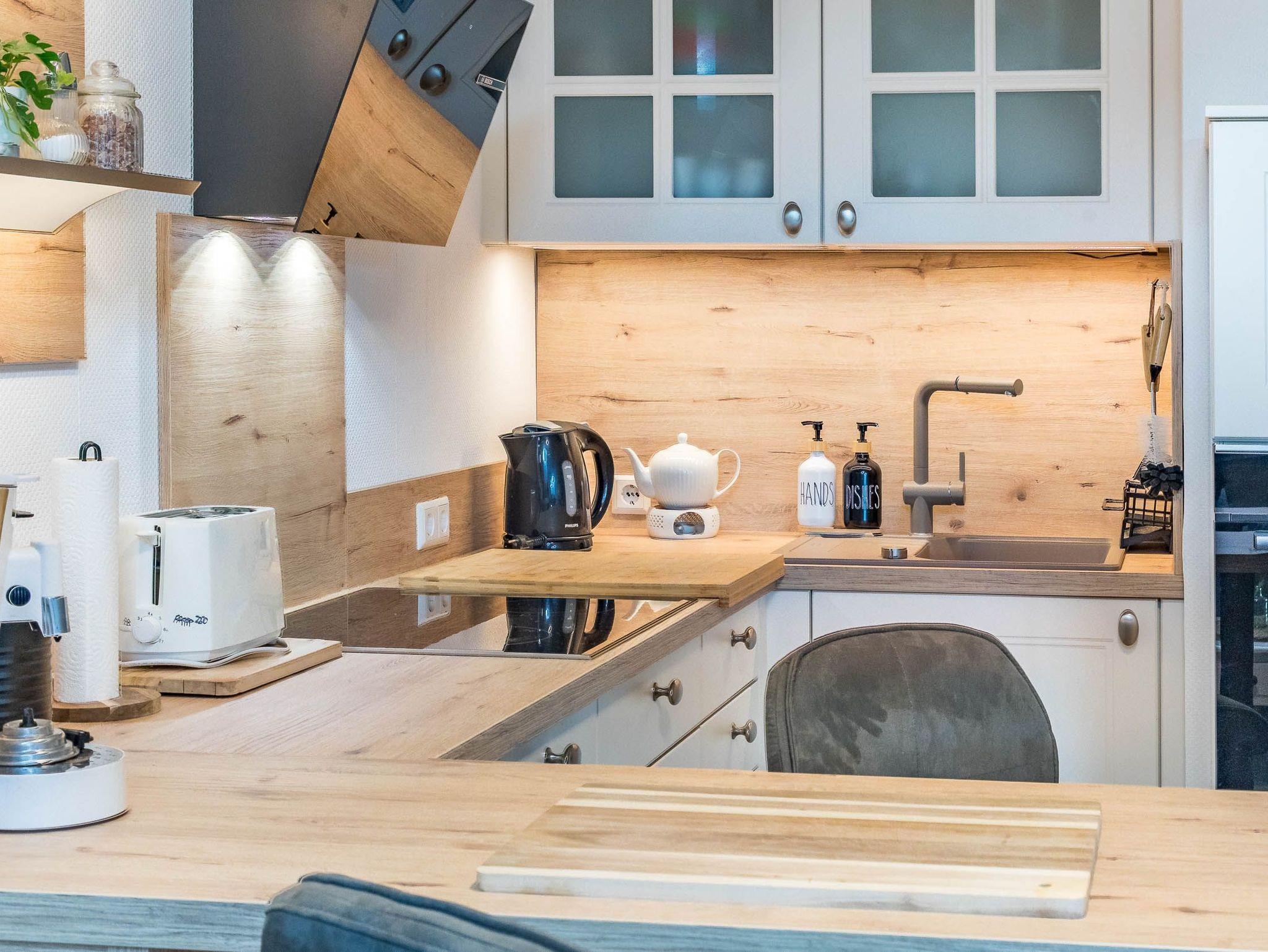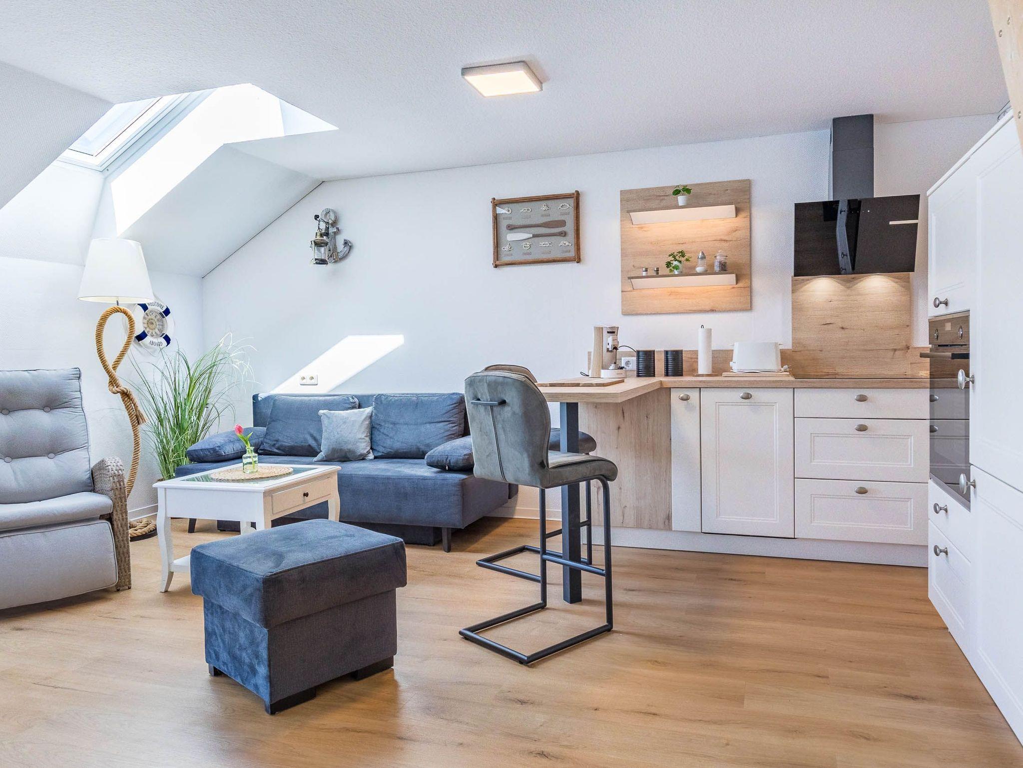 In der 1. Wohnebene finden Sie das Wohnzimmer mit großem Ecksofa (Schlafsofa), Flatscreen-TV, Essecke und kleiner Wohnküche.